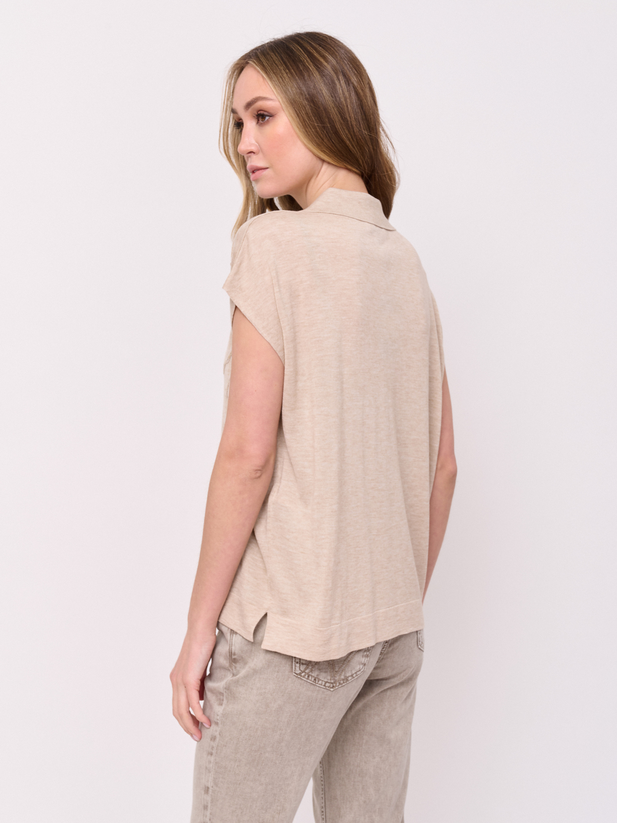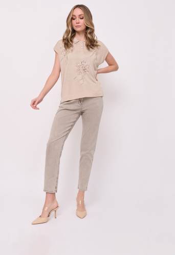 Детали: вырез горловины отложной воротничок, рукава короткие, покрой прямой, рисунок фактурный с пайетками - цветы. Длина по спинке: 59 см.