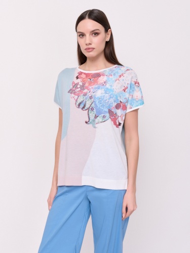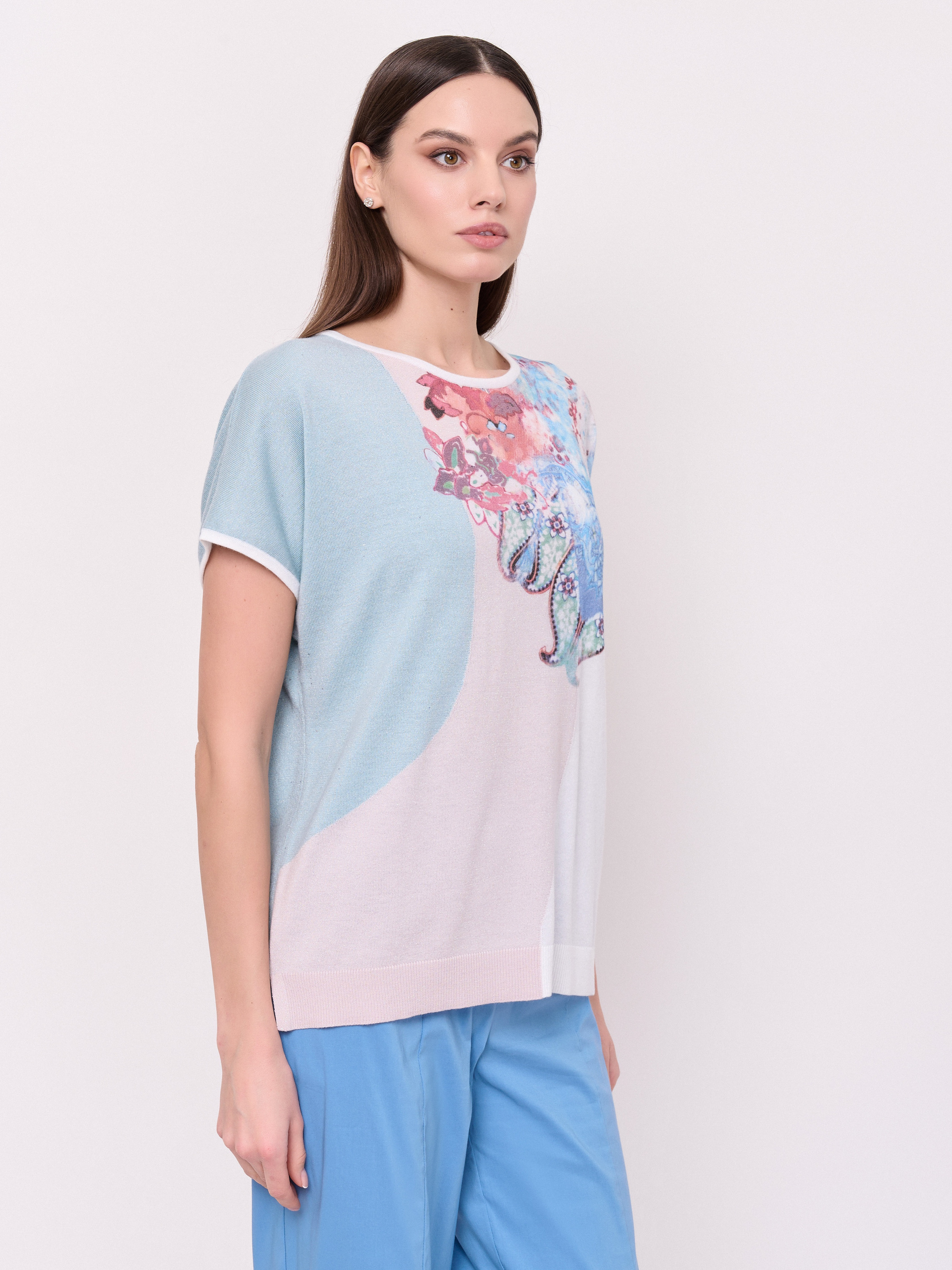 Детали: вырез горловины округлый, рукава короткие, покрой прямой, рисунок пэйсли, боковые разрезы, пайетки. Длина по спинке: 60 см.