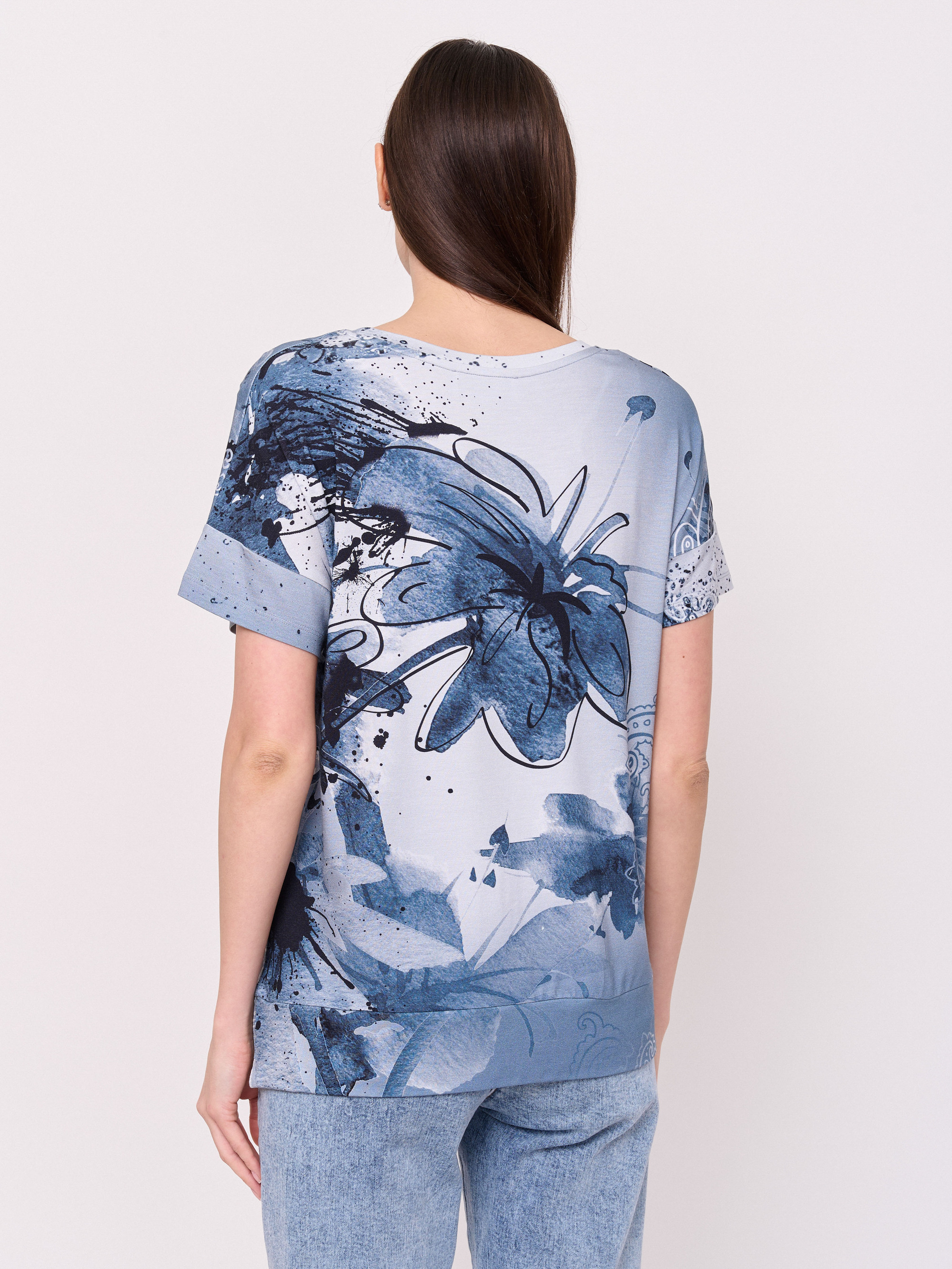 Детали: вырез горловины округлый, рукава короткие, покрой прямой, рисунок цветы и растения, стразы, боковые разрезы. Длина по спинке: 60 см.
