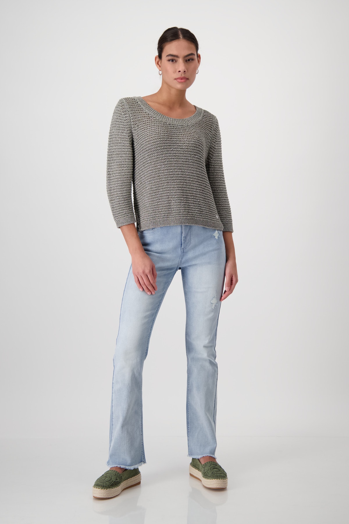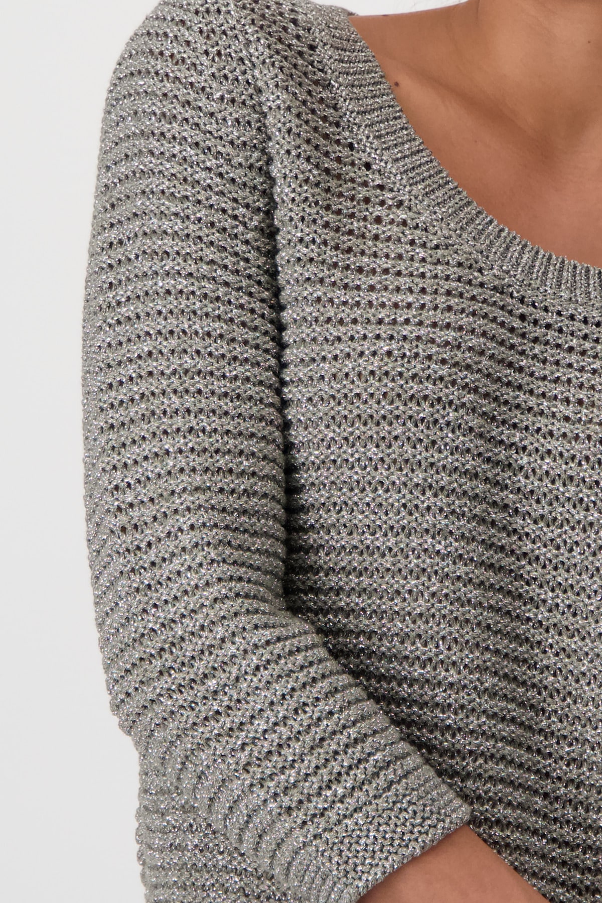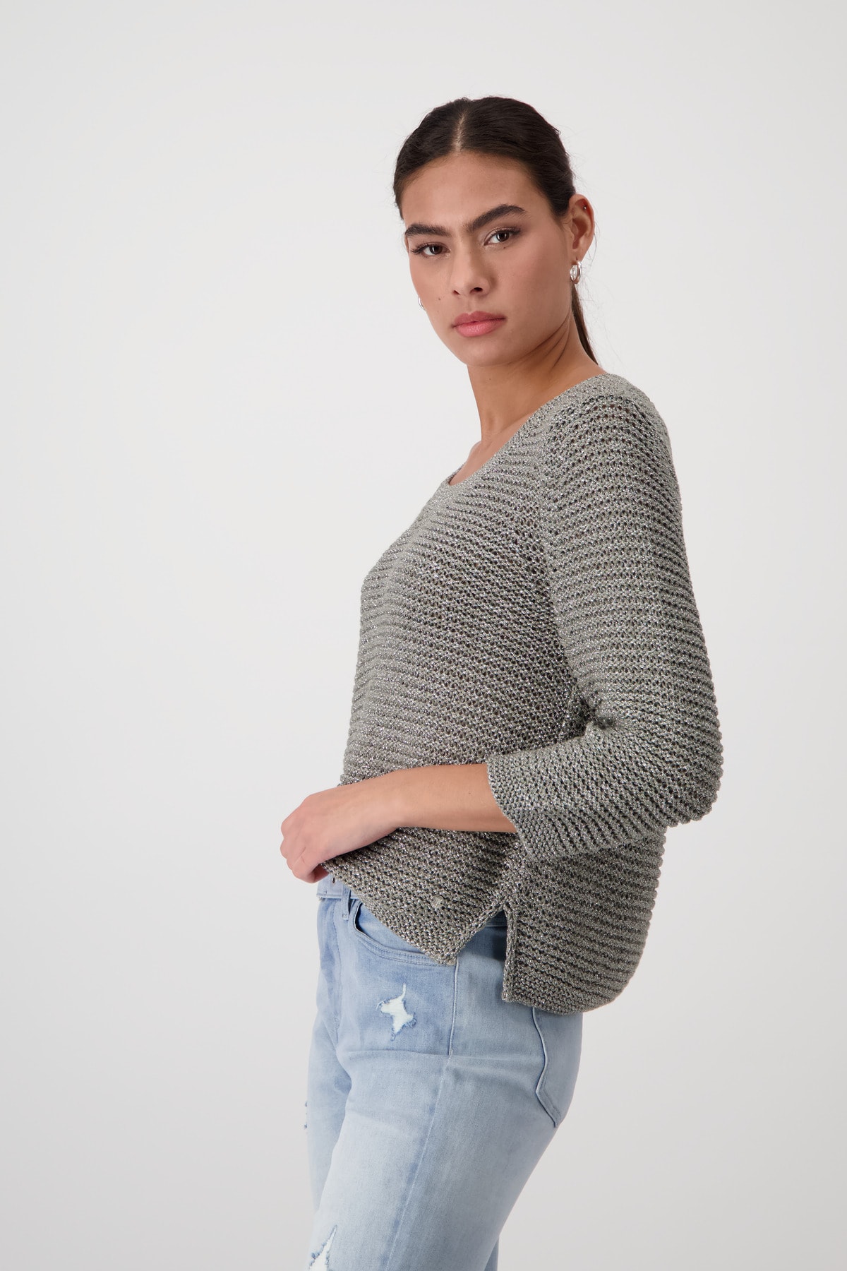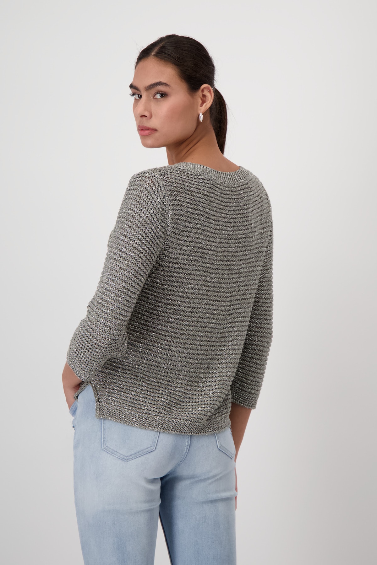 Блестящий джемпер с рукавами 3/4 и классными разрезами по бокам. Струящаяся вискоза с блестящим люрексом. Регулярная посадка. Ребристый круглый вырез. Рукава 3/4. Боковые разрезы. Длина 44 размера 54 см.