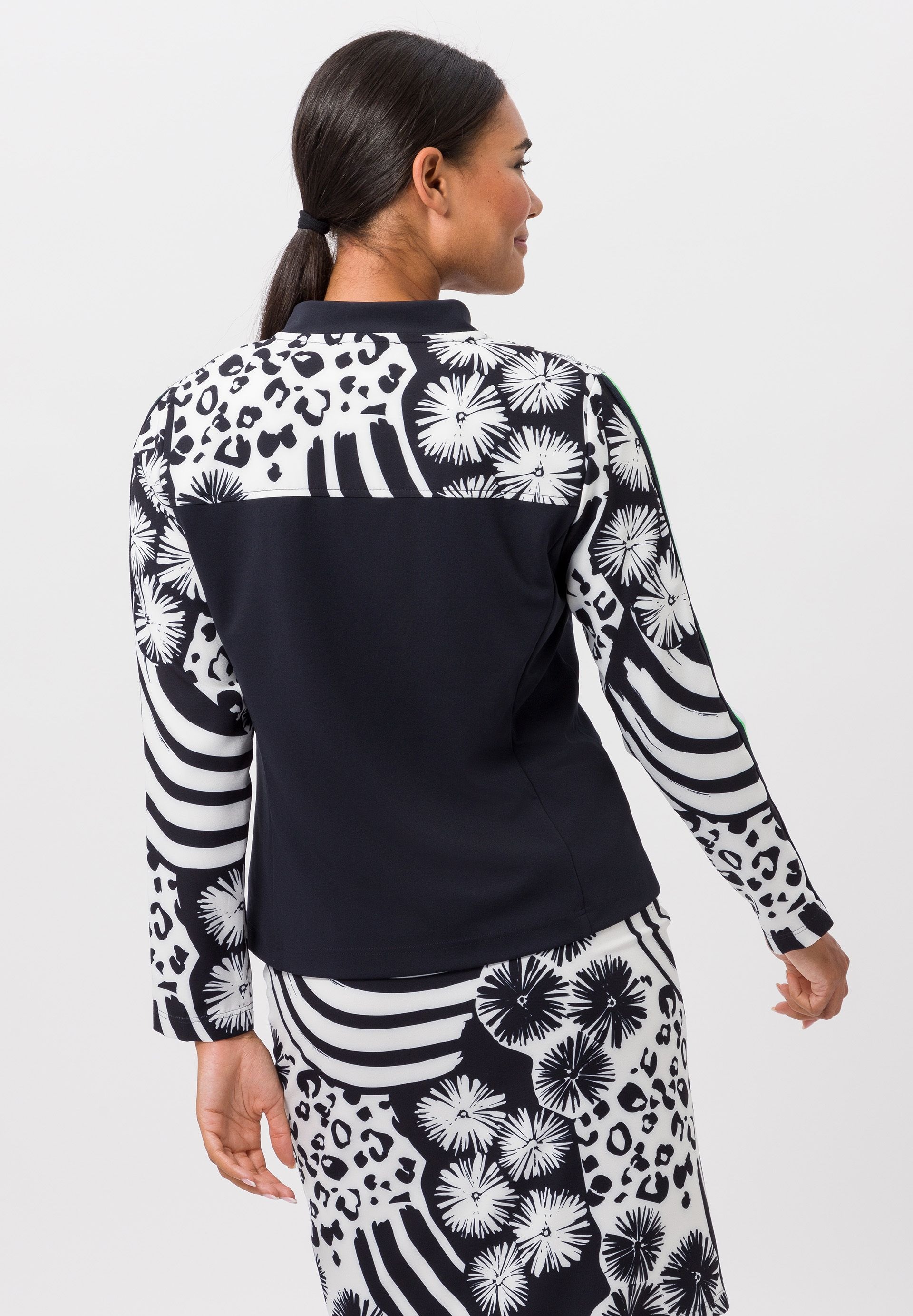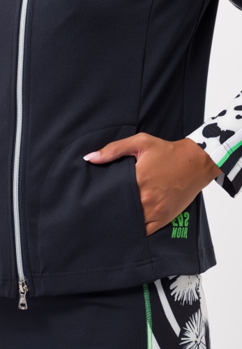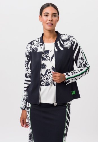 Легкая женская куртка с цветочным узором. С окончанием холодного сезона наступает весна, множество новых тенденций. Такая легкая куртка с модным рисунком определенно одна из них. Эффектный принт подчеркнут однотонными вставками и контрастными полосками на рукавах. Прямой крой и эластичная ткань обеспечивают свободу движений. Благодаря двусторонней молнии и боковым карманам куртка не только стильная, но и практичная. Длина в 42 размере - 58 см.