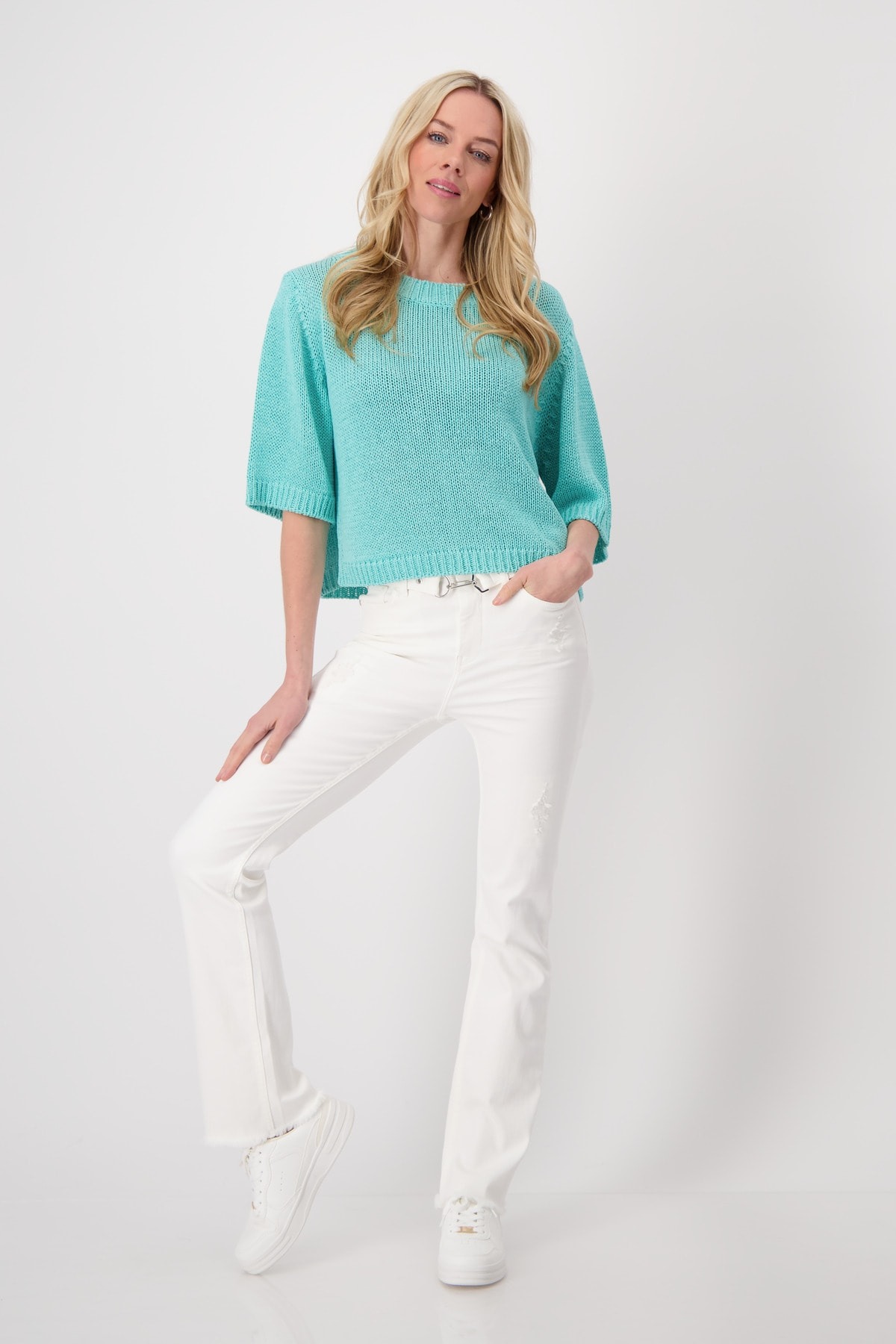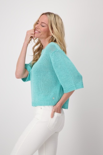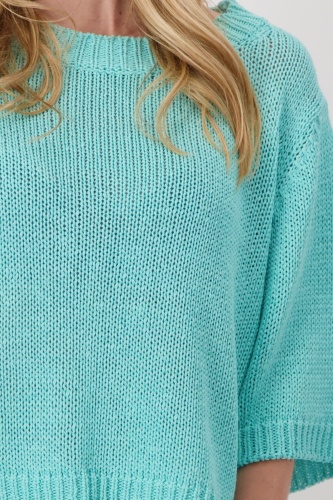 Свитер из 100% полиакрила удобен в ношении. Стиль ленточной пряжи придает образу особую нотку. Регулярная посадка. Ребристый круглый вырез. 3/4 рука. Ребристые манжеты и подол. Длина 44 размера 52 см.