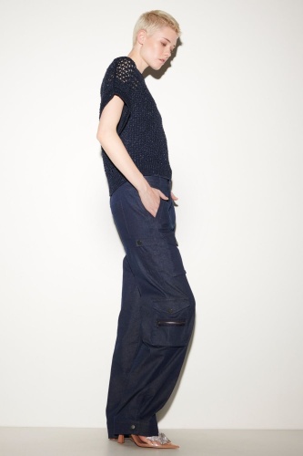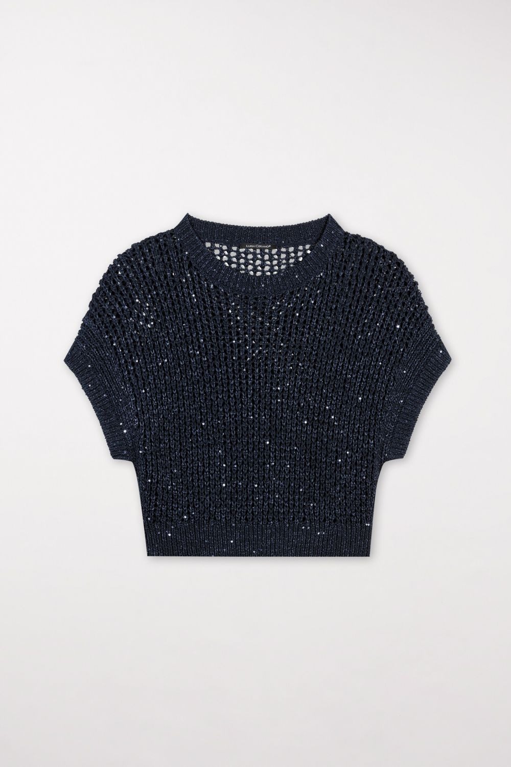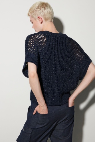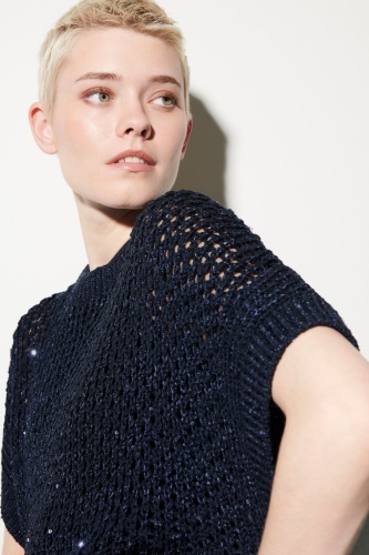 Майка с кружевной текстурой из летней ленточной пряжи, создающей ощущение бумаги. Заниженная линия плеча и встроенные пайетки придают этой майке одновременно повседневный и гламурный вид.