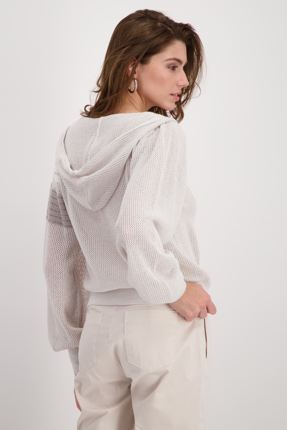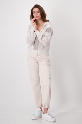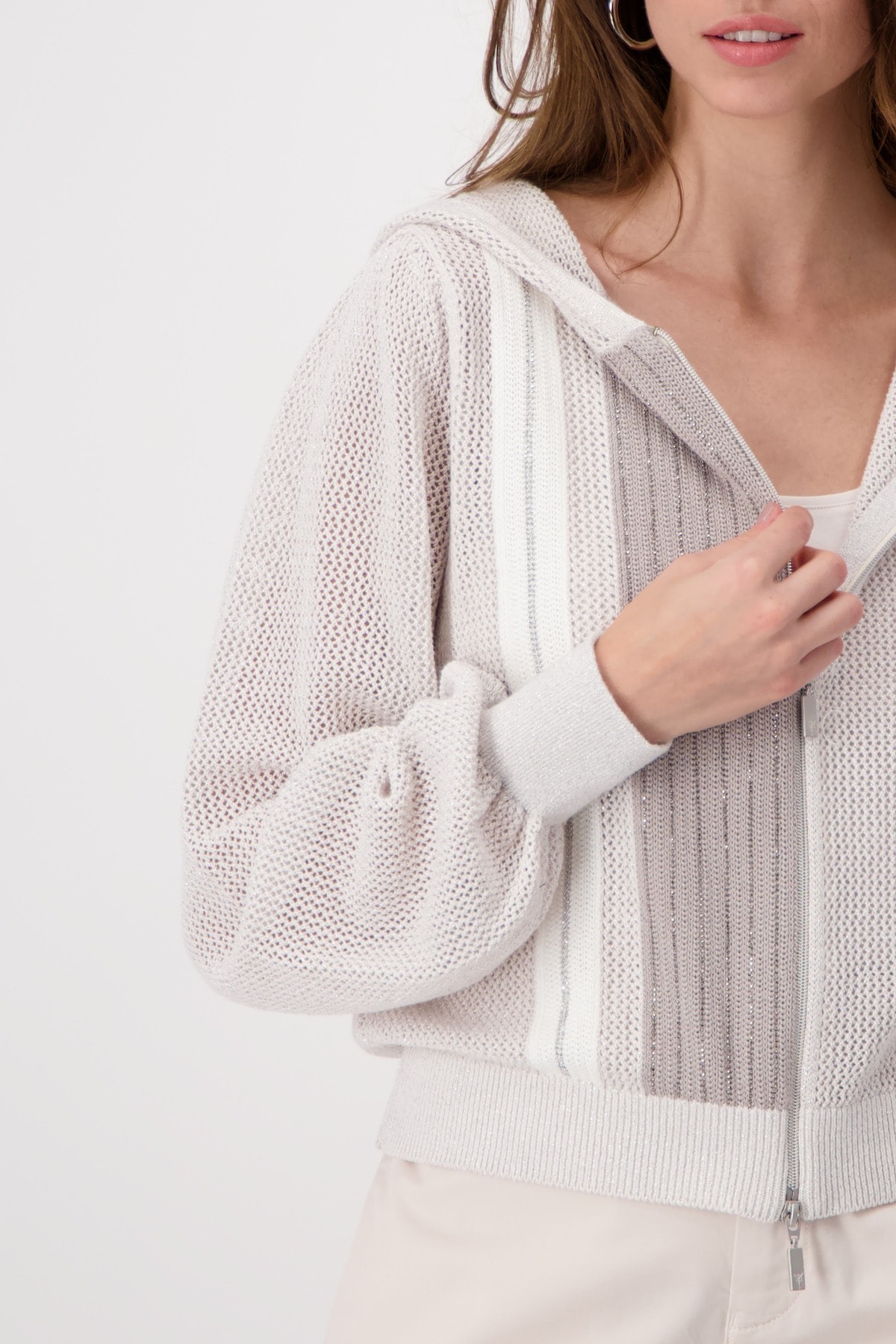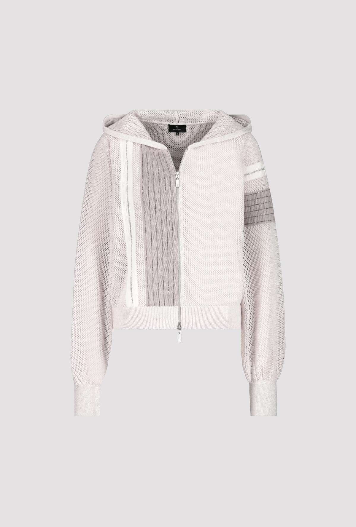 Кардиган с люрексом в цветных блоках из высококачественного хлопка с ажурным узором и полосками со стразами. Регулярная посадка. Капюшон. Широкие длинные рукава. Ребристые манжеты и подол. Двусторонняя молния. Длина 44 размера — 56 см.