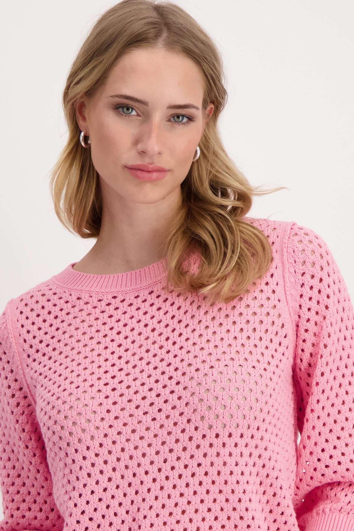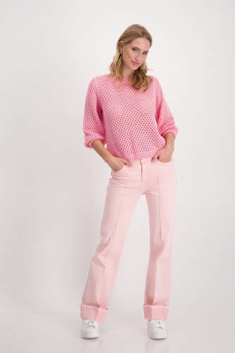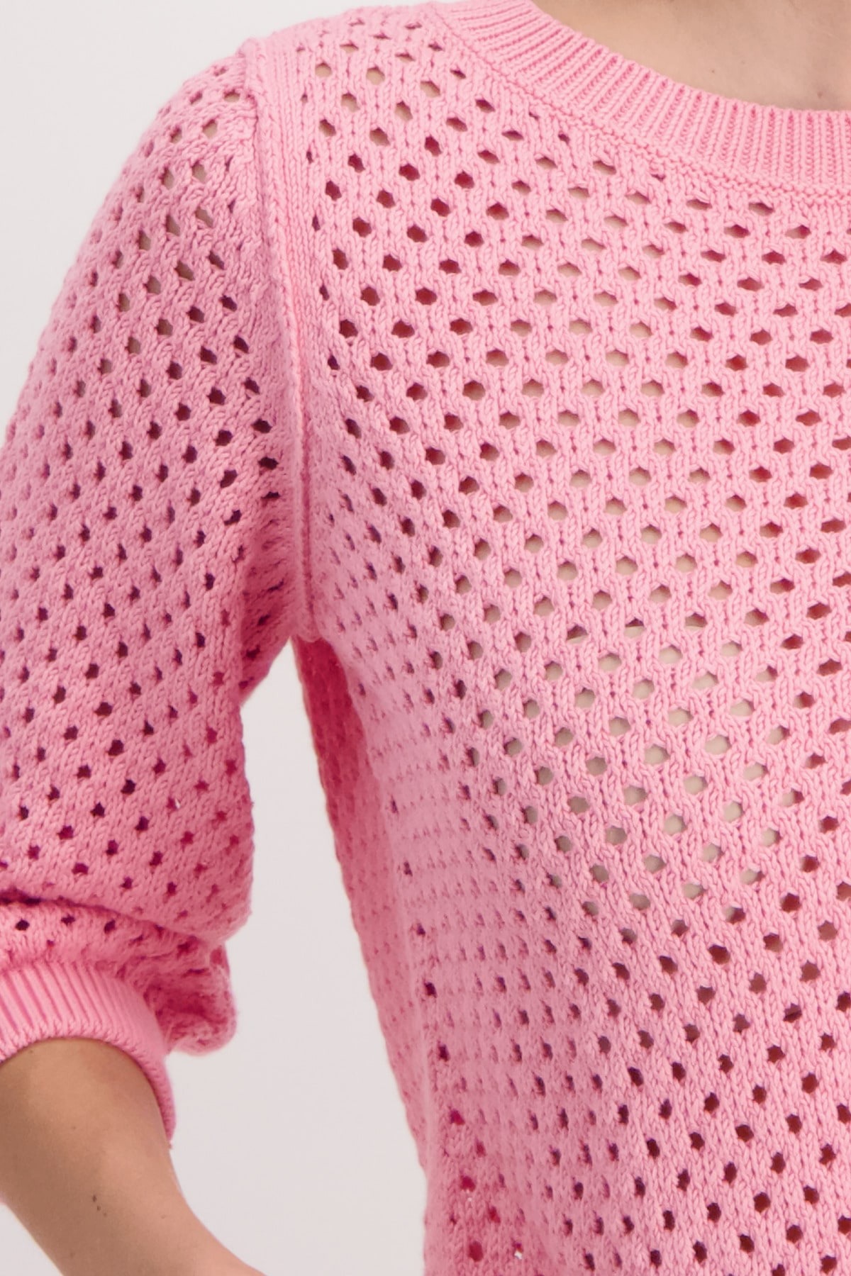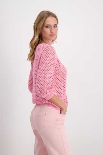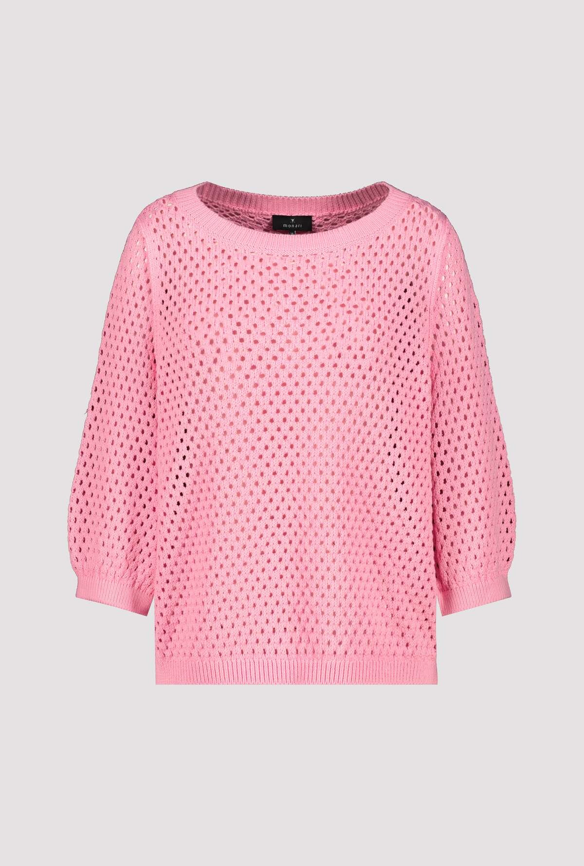 Свитер с рукавами 3/4 выполнен из 100% хлопка и имеет красивый ажурный узор. Регулярная посадка. Ребристый круглый вырез. Ребристые манжеты и подол. Длина 44 размера 56 см.