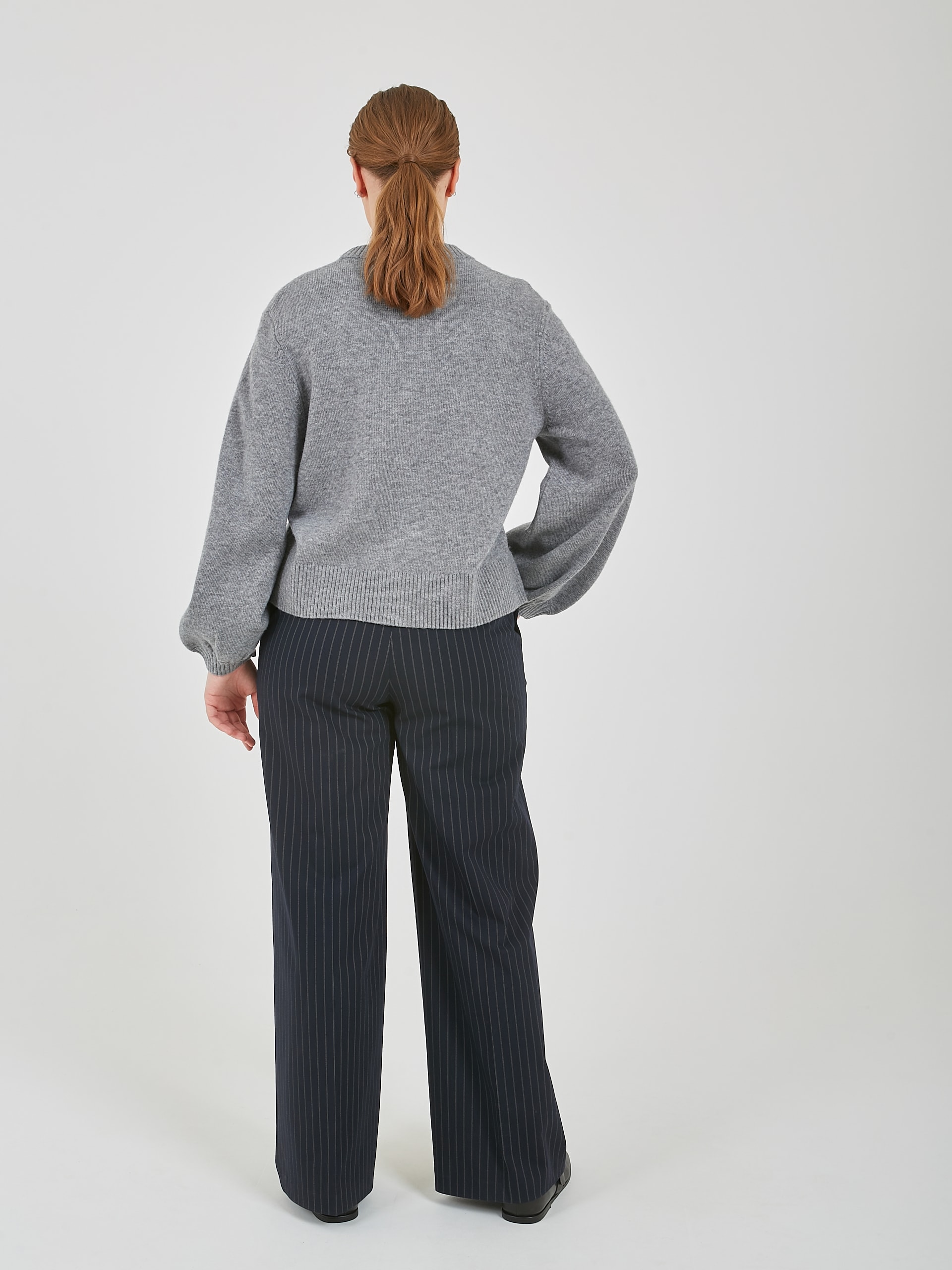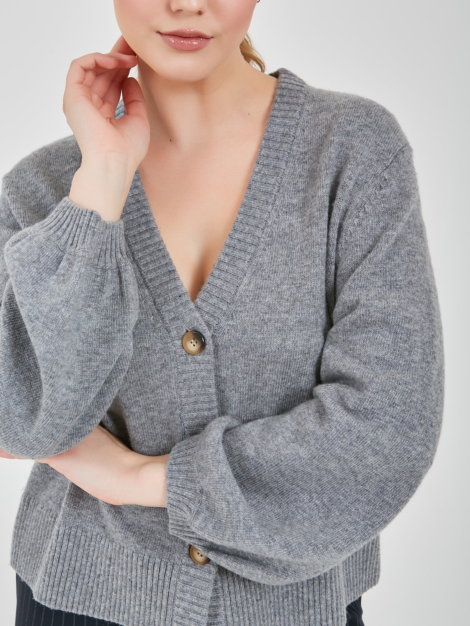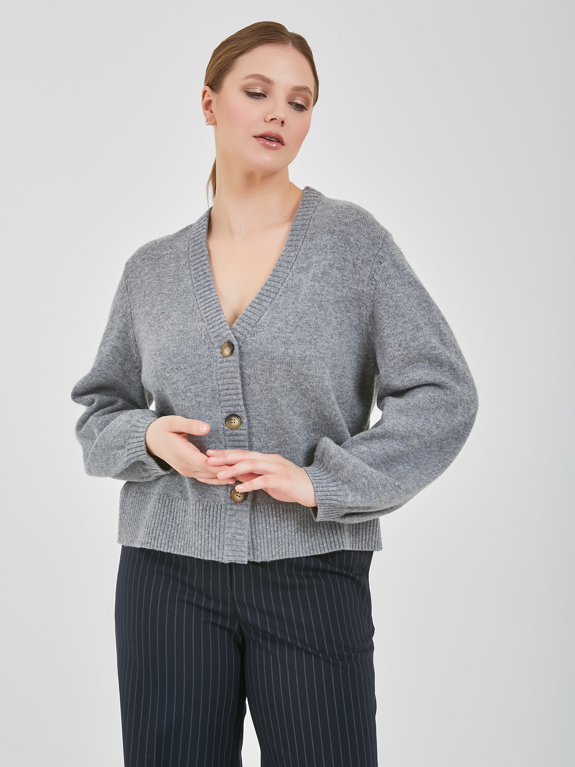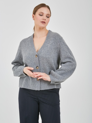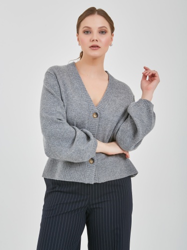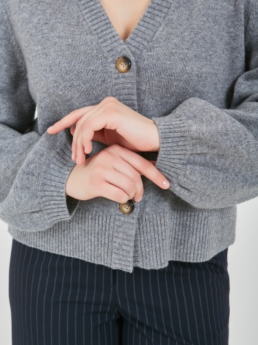 Кардиган в светло-сером цвете с глубоким V-образным вырезом зрительно вытягивает силуэт. Акцентные пугововицы и расширяющийся книзу рукав добавит к образу изюминку.Осень-Зима'25/26. Капсула "Вишневый сад"
