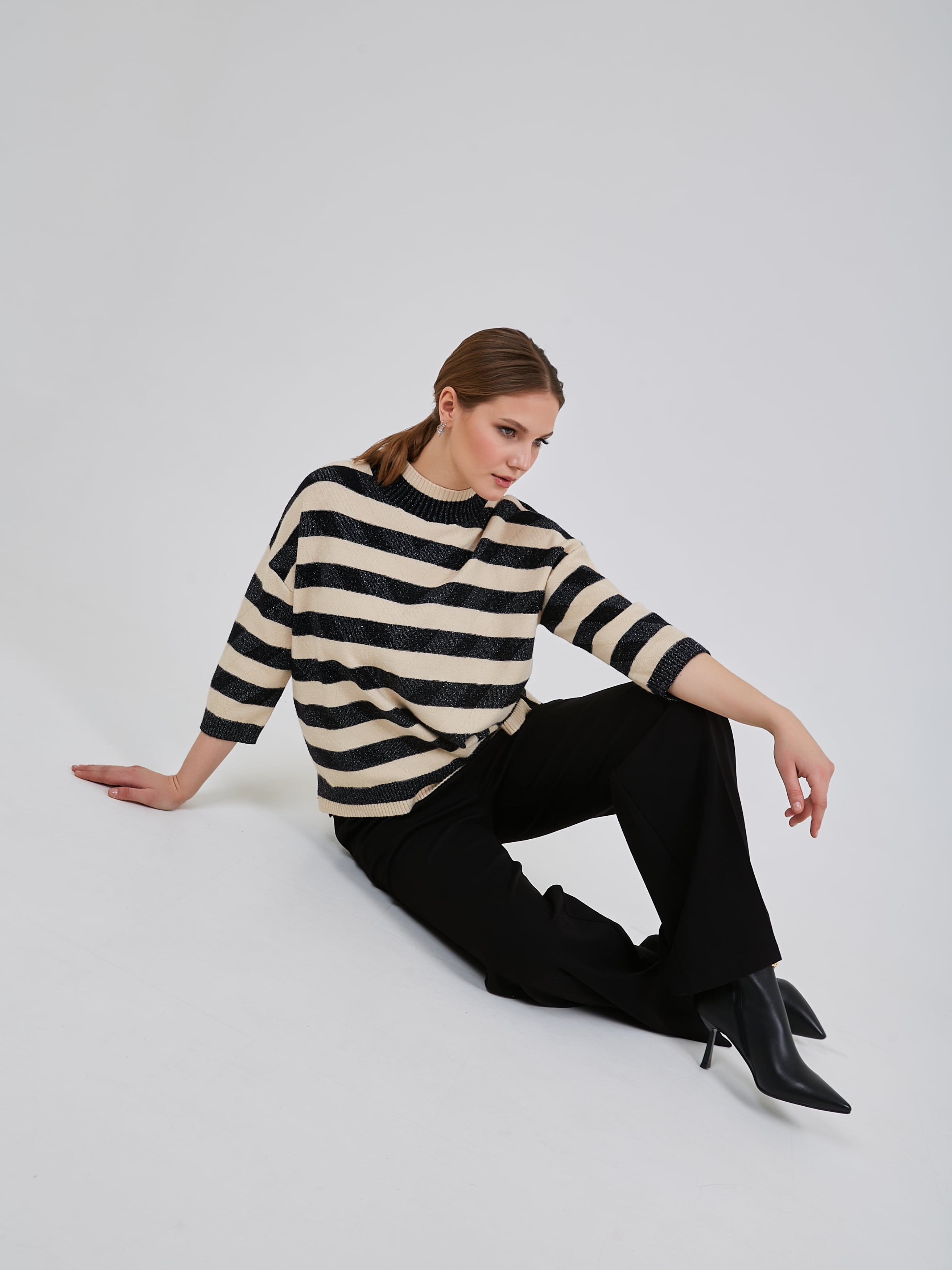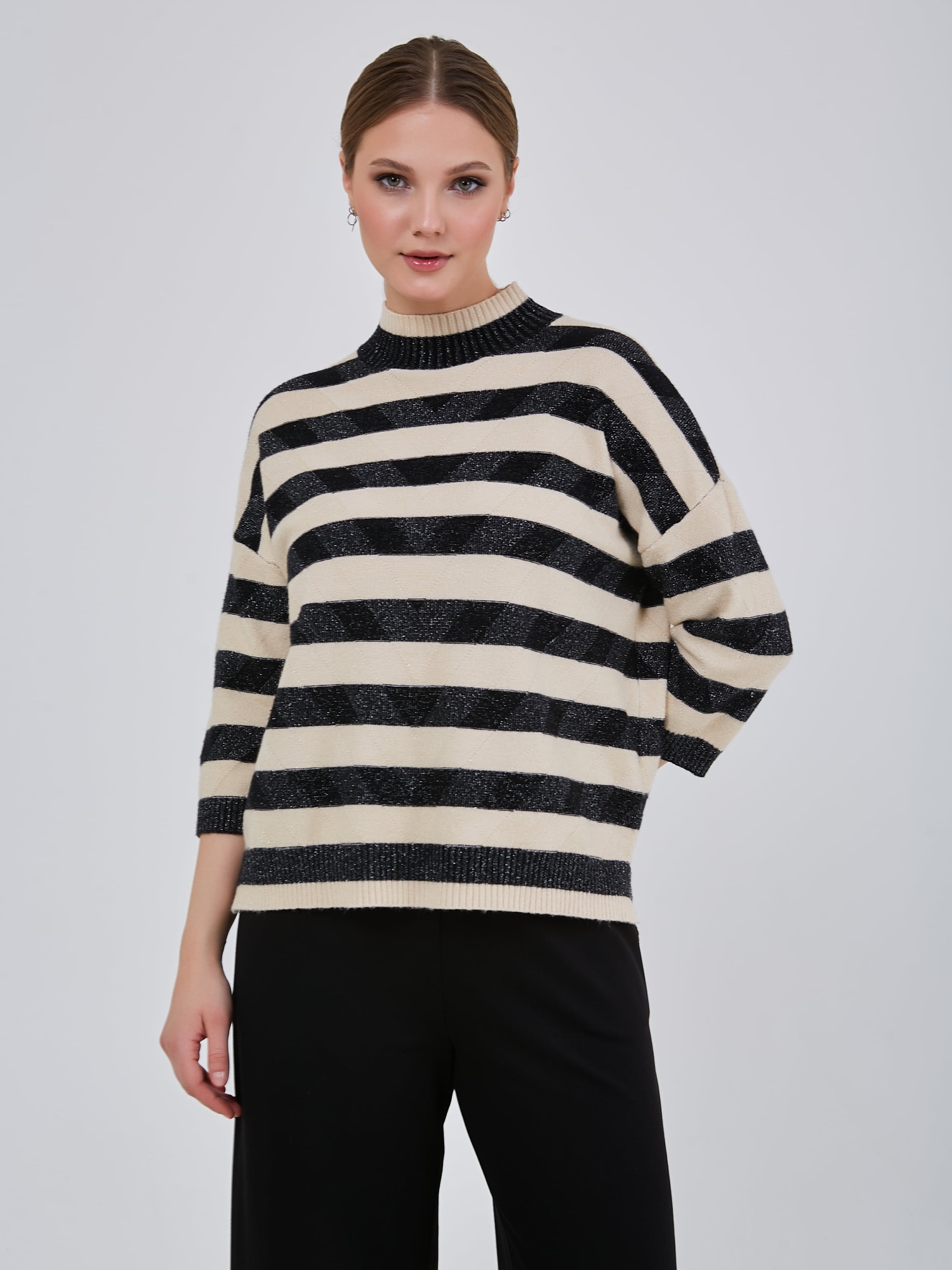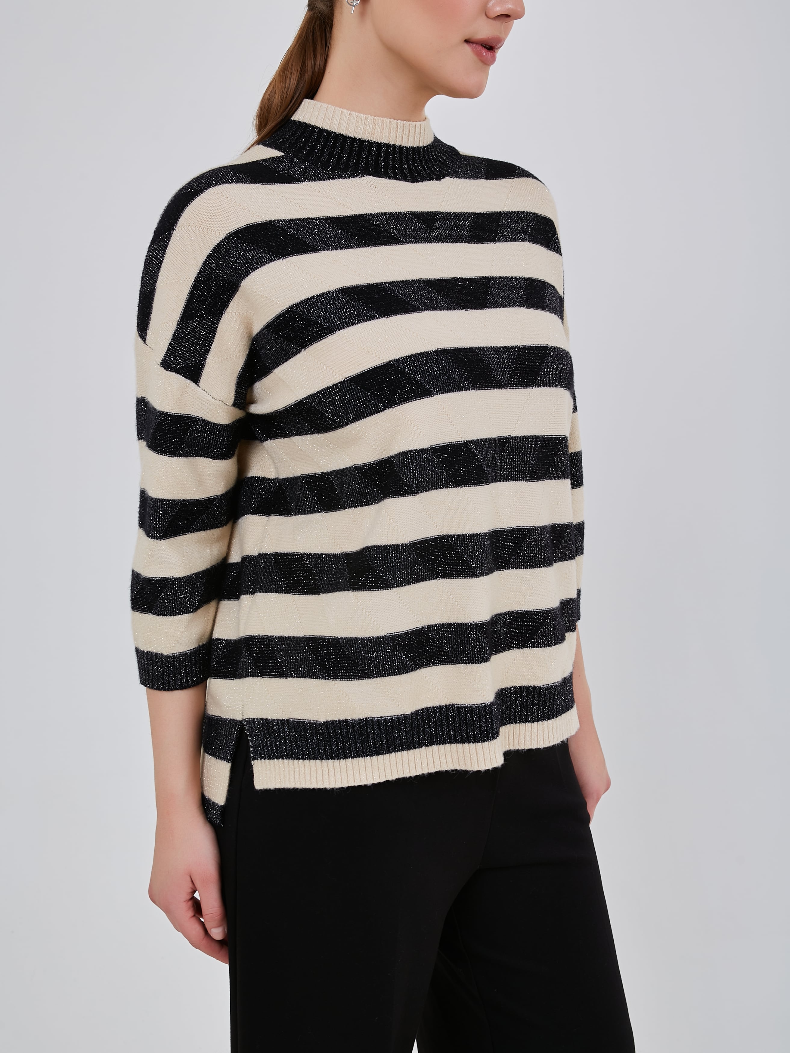 Джемпер с принтом в полоску и люрексным декором в виде диагональных полосок, зрительно вытягивающий силуэт. Длина рукава 3/4. Коллекция Осень-Зима 2024 Капсула "Унесённые ветром"