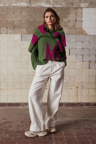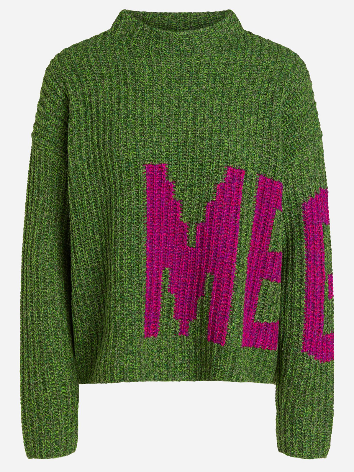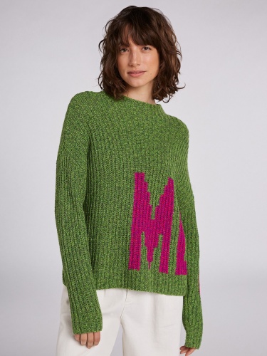Свитер крупной вязки с оригинально расположенной вязаной надписью "МЕГА" - «ME» спереди, «G» на левой руке, «A» на спине. Стильное цветовое сочетание зеленого и фуксии. Свободный силуэт, короткий воротник-стойка. Длина 50 см для 42 российского размера. Рост модели 178 см, ее размер - 42.