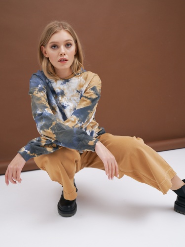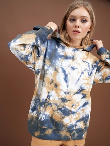Оверсайз толстовка в стиле тай-дай. Сочетание насыщенного синего и бежевого оттенков. Объемный капюшон с кулиской, длинные рукава с эластичными манжетами.