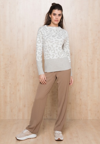 Трикотаж может быть изысканным, и этот джемпер - тому доказательство! Покрой по фигуре, вырез горловины "воронка", втачные рукава полной длины. Анималистический рисунок подчеркнут деликатным блеском нити люрекса. Приятный к телу смесовый материал с хлопком, вискозой и шерстью обеспечивает комфорт.