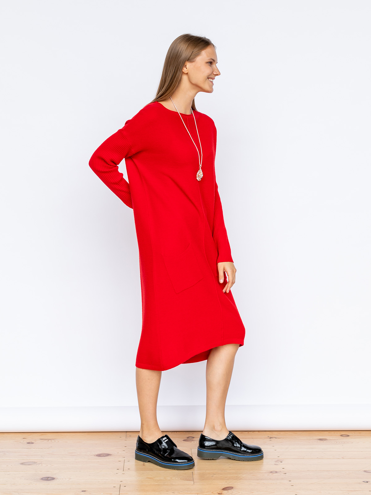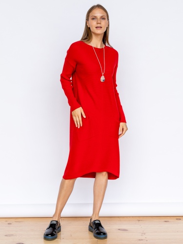 Однотонная трикотажная туника - тренд сезона! Актуальная длина миди и свободный крой идеально подходят под любой тип фигуры. Спереди изделия идет декоративный шов. Вырез горловины лодочка выгодно подчеркивает линию шеи. Спущенная линия плеч делает образ расслабленным. Два практичных накладных кармана спереди создают динамику в фактуре изделия.