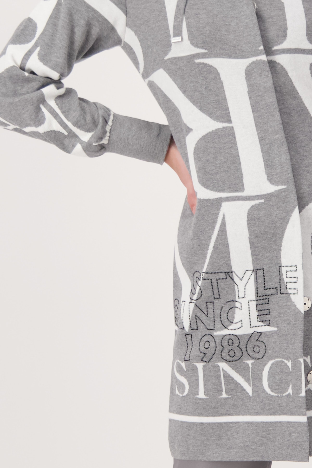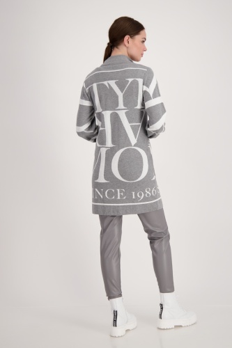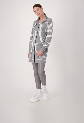 На сайте указаны российские размеры. Жаккардовое вязаный кардиган с воротником-стойкой на пуговицах. Трикотажный кардиган из мягкого качественного хлопка от monari. Повседневная модель с длинными рукавами согреет вас и дополнит любой ваш наряд. Модель с воротником-стойкой и планкой на потайных кнопках. Привлекает внимание: жаккардовая надпись и надпись со сверкающими стразами спереди. Модель ростом 179 см.