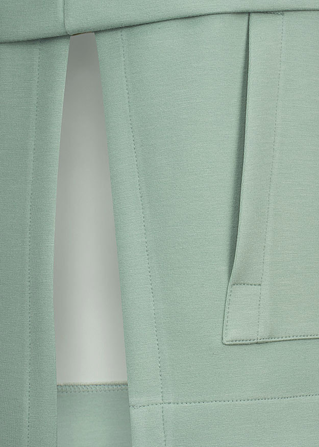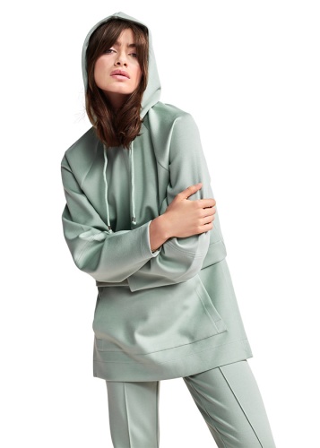 Спортивная модель с капюшоном, кулисками и карманами-кенгуру. На талии горизонтальный шов и боковые вырезы.
