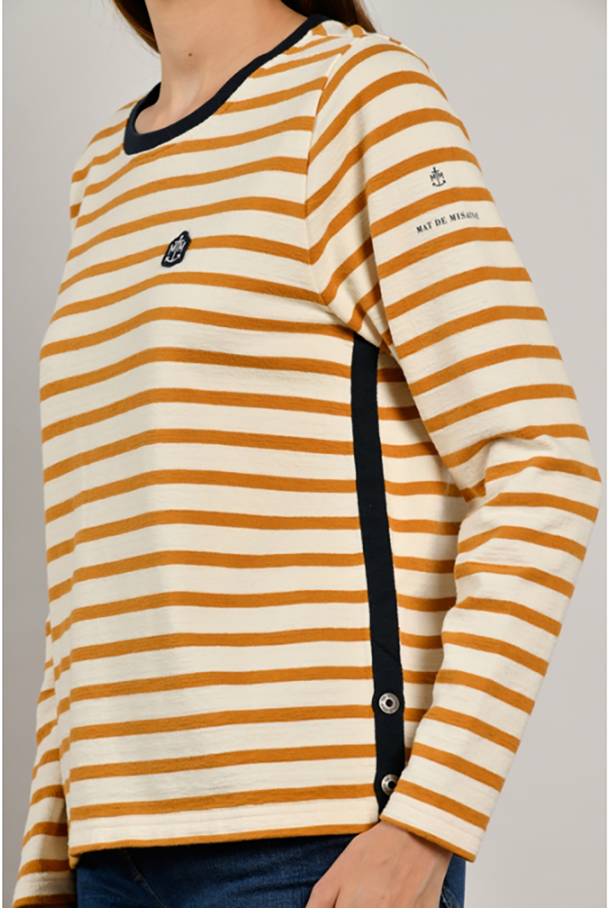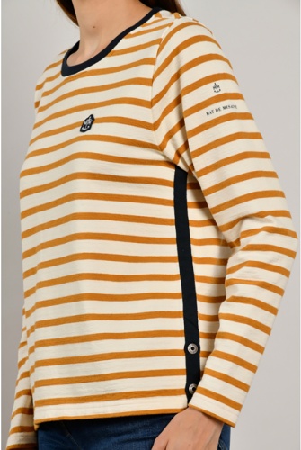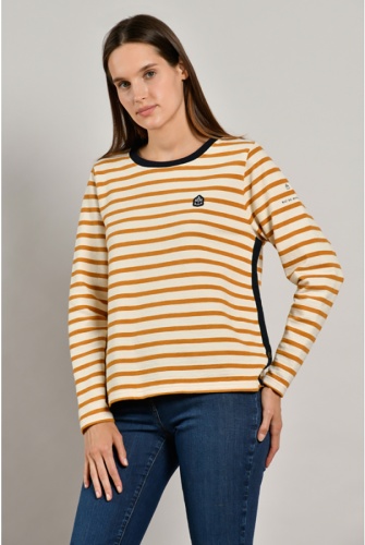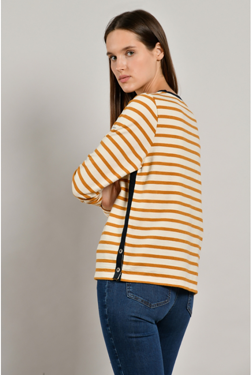 Хлопковый джемпер в полоску, круглая горловина, втачной рукав полной длины. Нашивка на груди в качестве украшения. Горловина и боковой шов украшены контрастной лентой. Отличный вариант для повседневной носки и образов в стиле кэжуал.