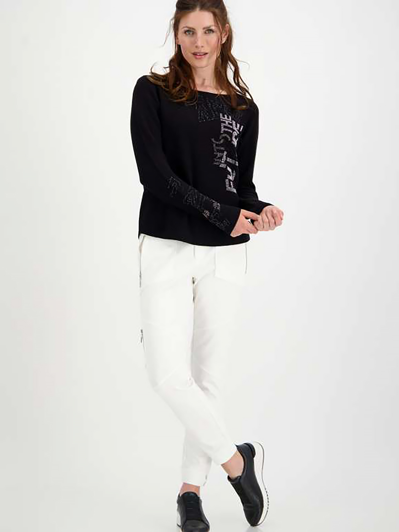 Однотонный джемпер свободного силуэта отлично скроет недостатки фигуры. Горловина-лодочка выгодно подчеркивает шею. Втачной рукав полной длины украшен стразами. Стразы также украшают перед изделия. Материал приятен в носке.