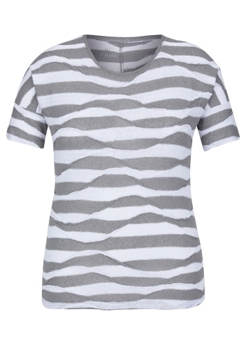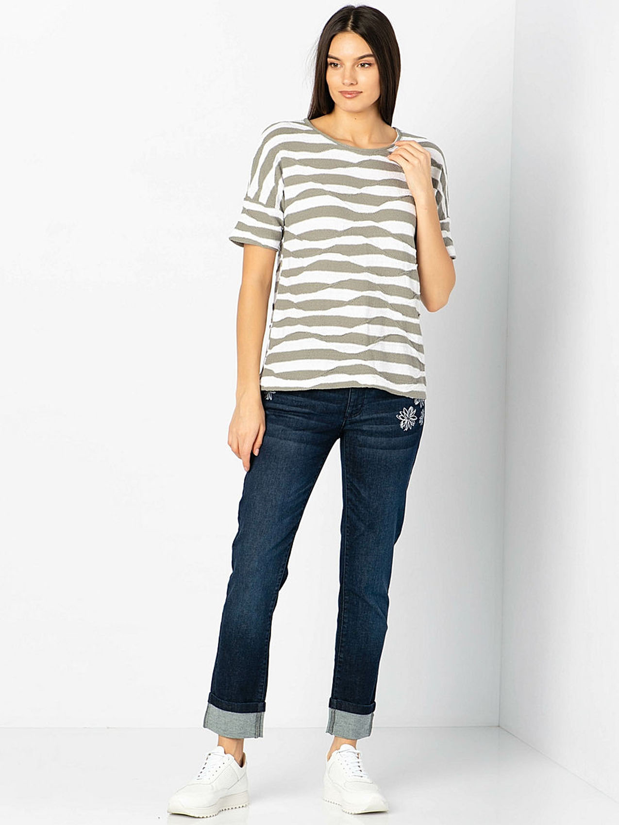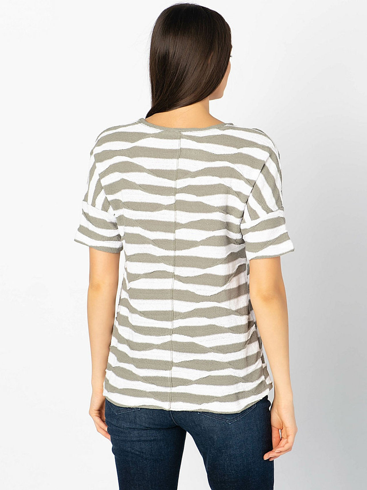 Джемпер с коротким рукавом. Состав ткани из хлопка из синтетических материалов обеспечивает отличную посадку и легкость в уходе. В дизайне интересно обыгран тренд на полоску: создается оптическая иллюзия волн. Нейтральные цвета джемпера делают его универсальным элементом любого гардероба.