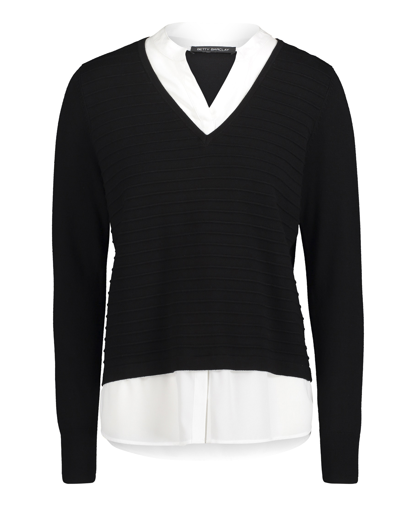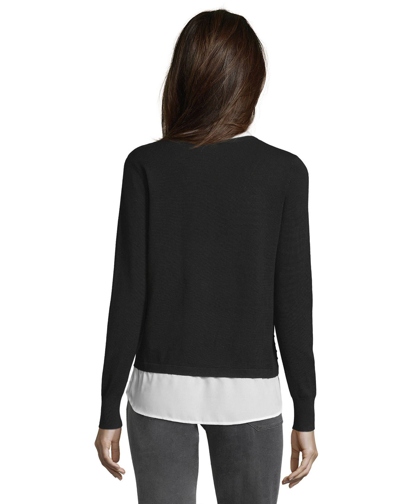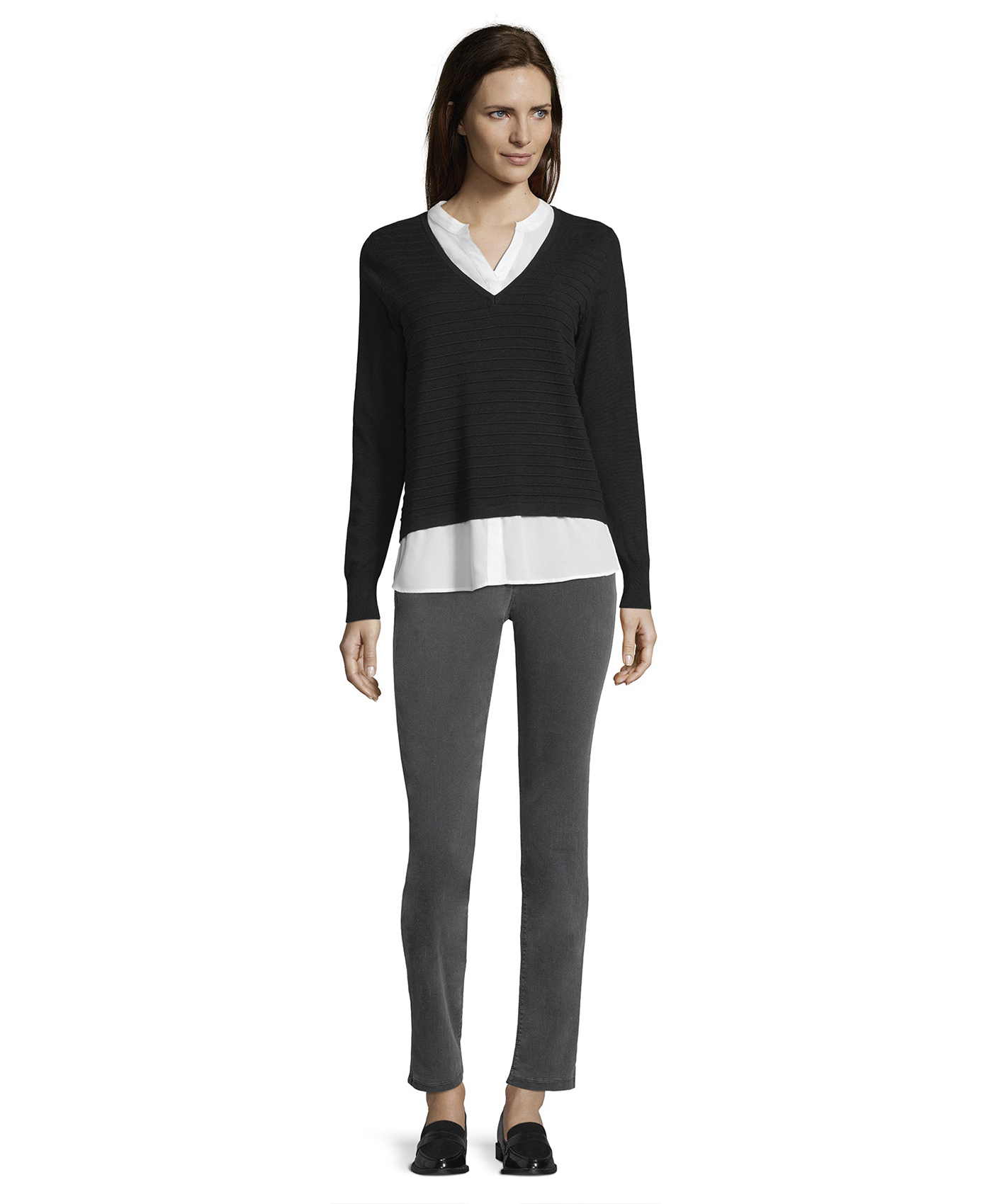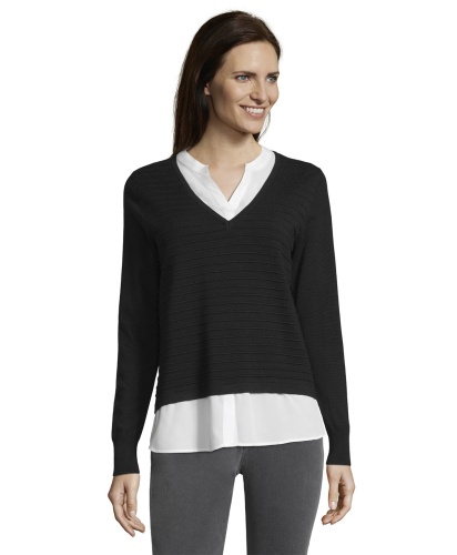 Джемпер с имитацией модели-двойки смотрится очень женственно и элегантно. Слегка прилегающий силуэт, V-образный вырез, длинные рукава. Материал из вискозной смеси приятен к телу и обеспечивает комфорт. В сочетании с брюками этот джемпер создает сдержанный образ в стиле смарт-кэжуал.