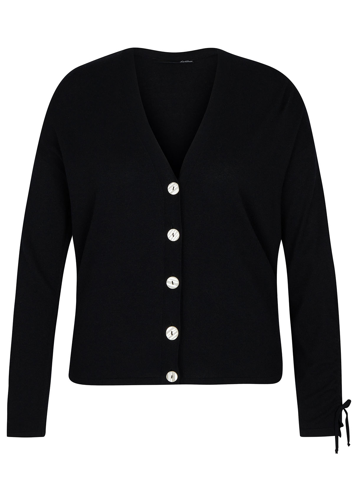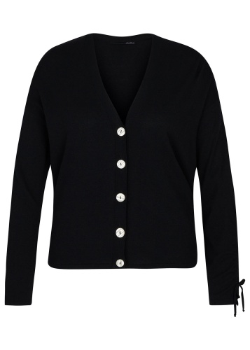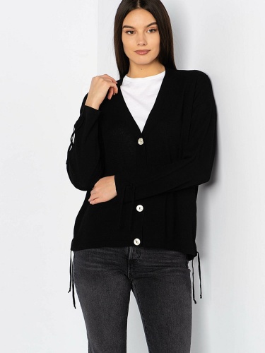 Трикотажный кардиган с контрастными пуговицами. V-образный вырез, длинные рукава.