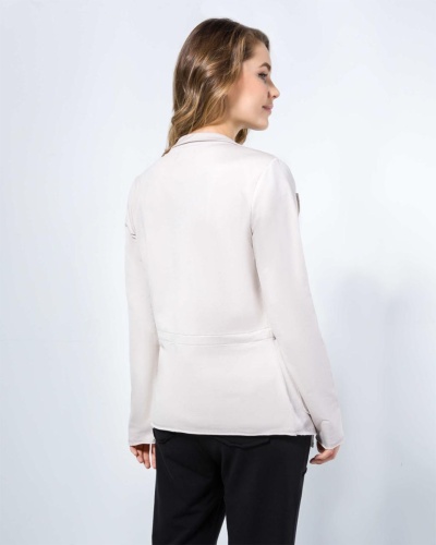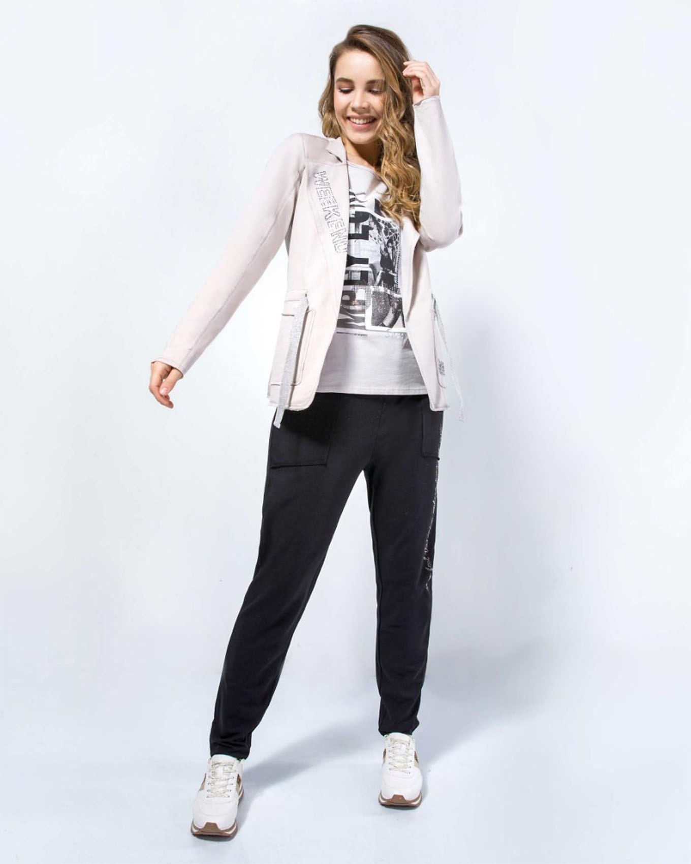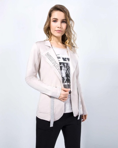 Кардиган песочного цвета. Отложной воротник, кулиска на талии, накладные карманы. Стальный декор из страз. Открытые срезы изделия создают демократичный образ.