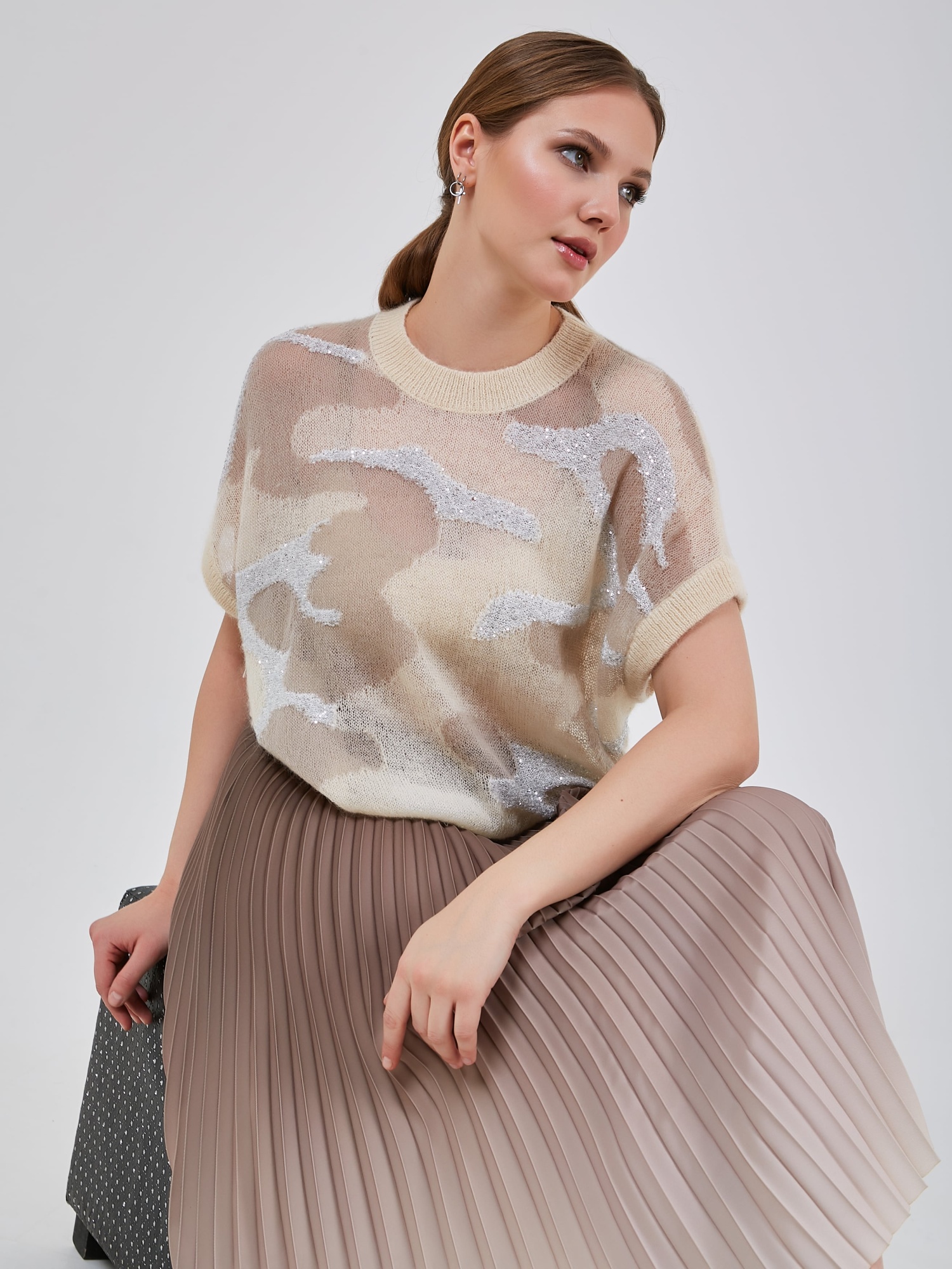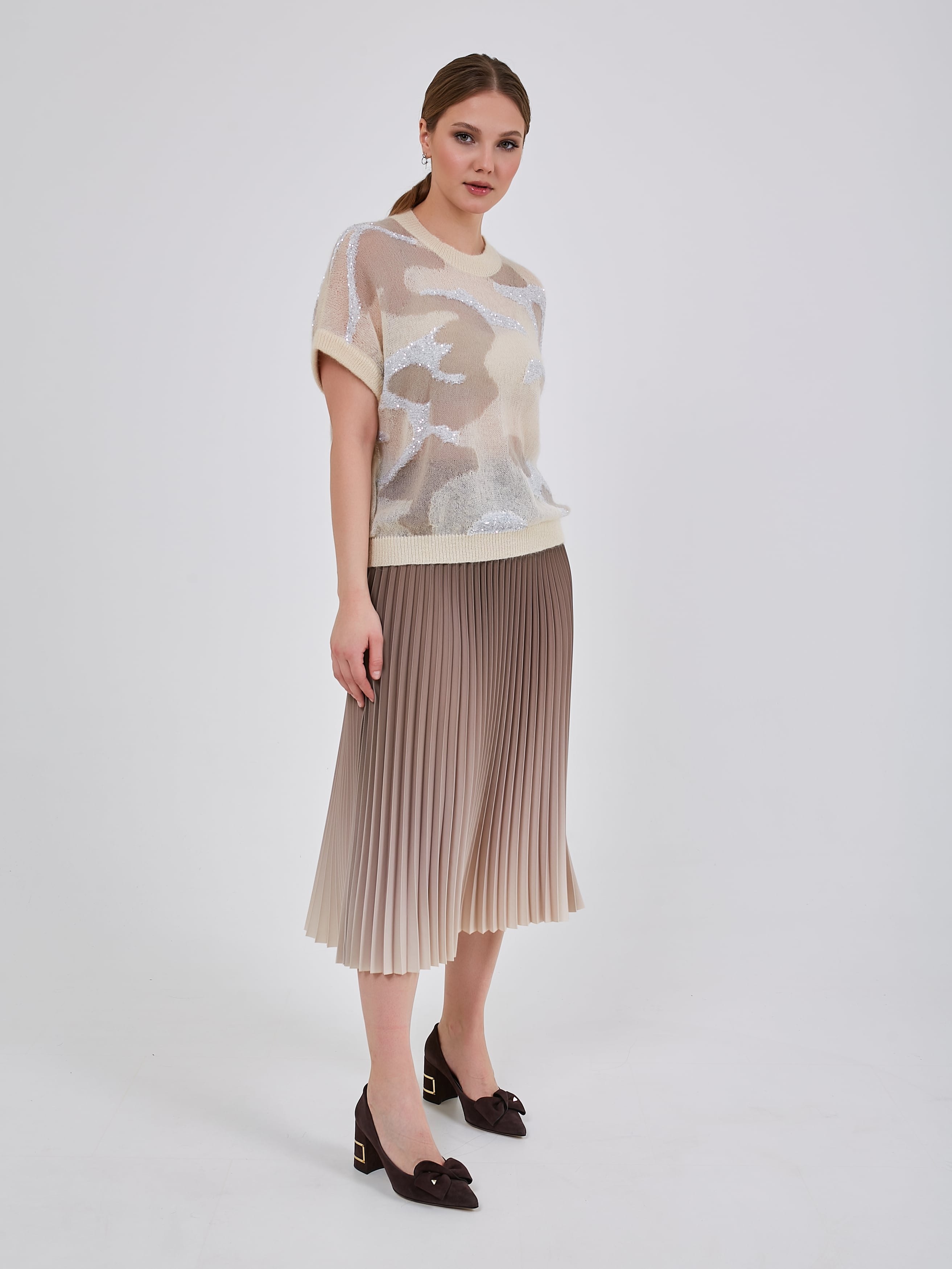 Нарядный джепер с комбинированной вязкой в виде анималистичного узора. Рукав короткий цельнокроенный с узкой эластичной манжетой. Коллекция Осень-Зима 2024-2025. Капсула "Крадущийся тигр, затаившийся дракон".