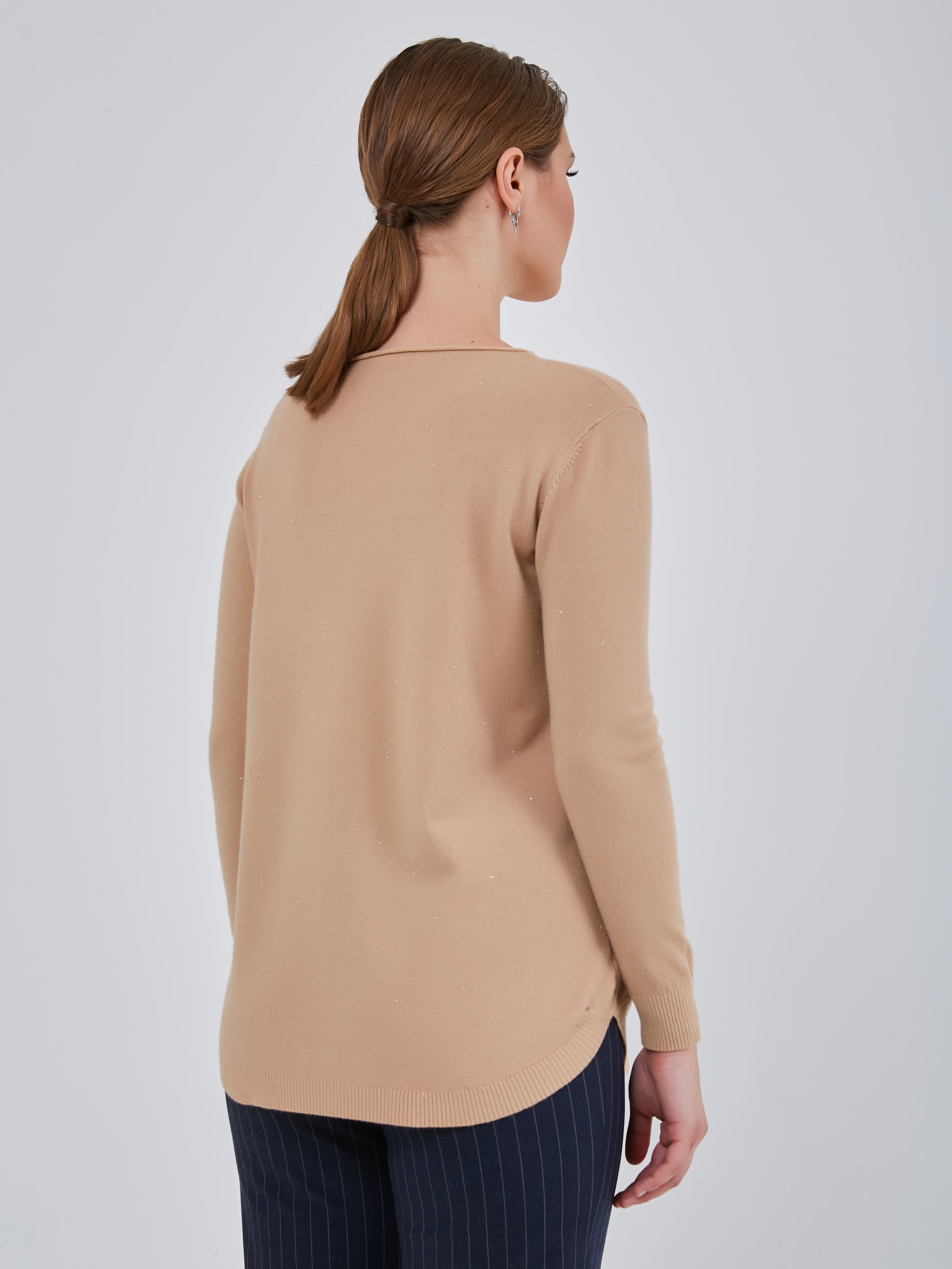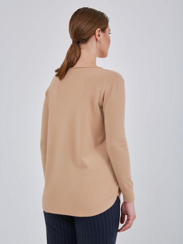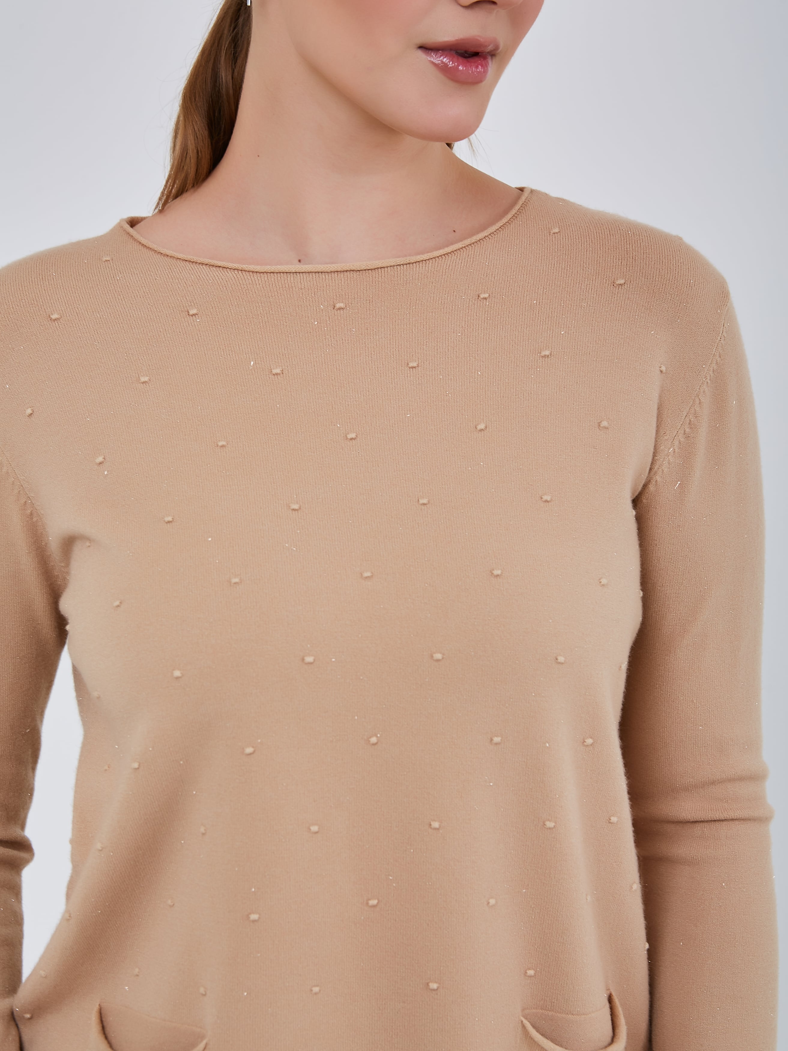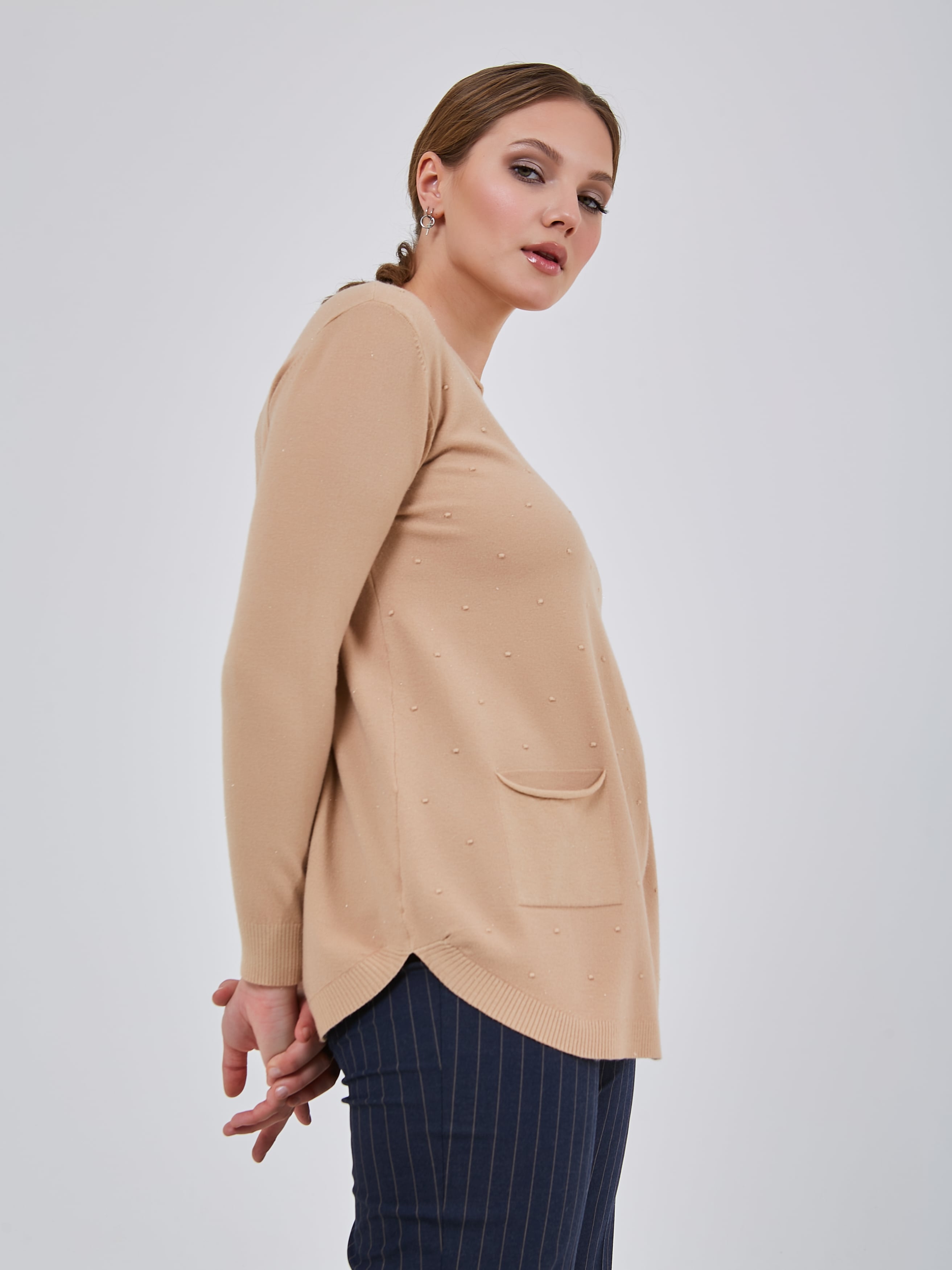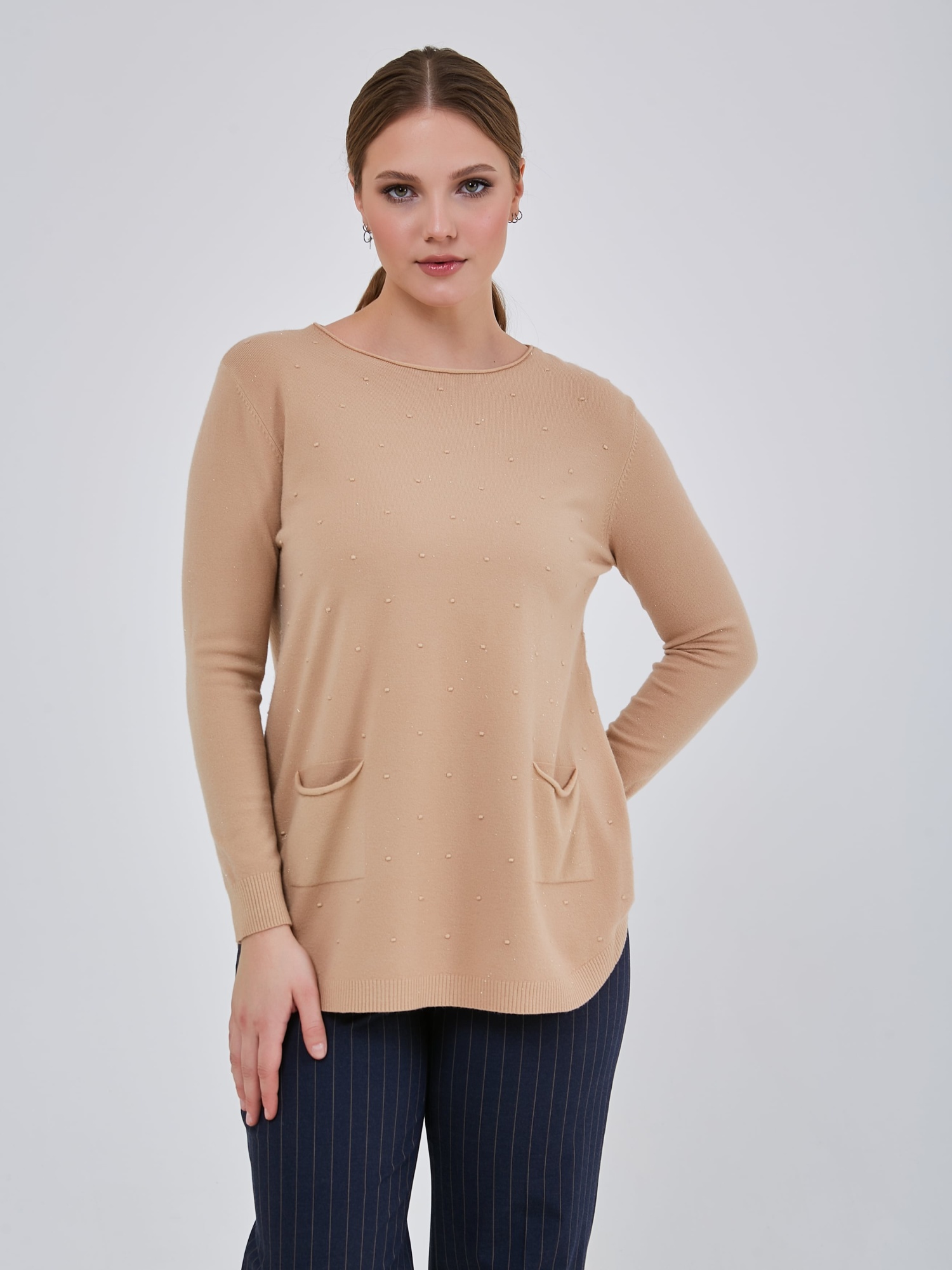 Удлинённый джемпер прямого кроя с небольшими карманами, круглой горловиной и резинками на манжетах.