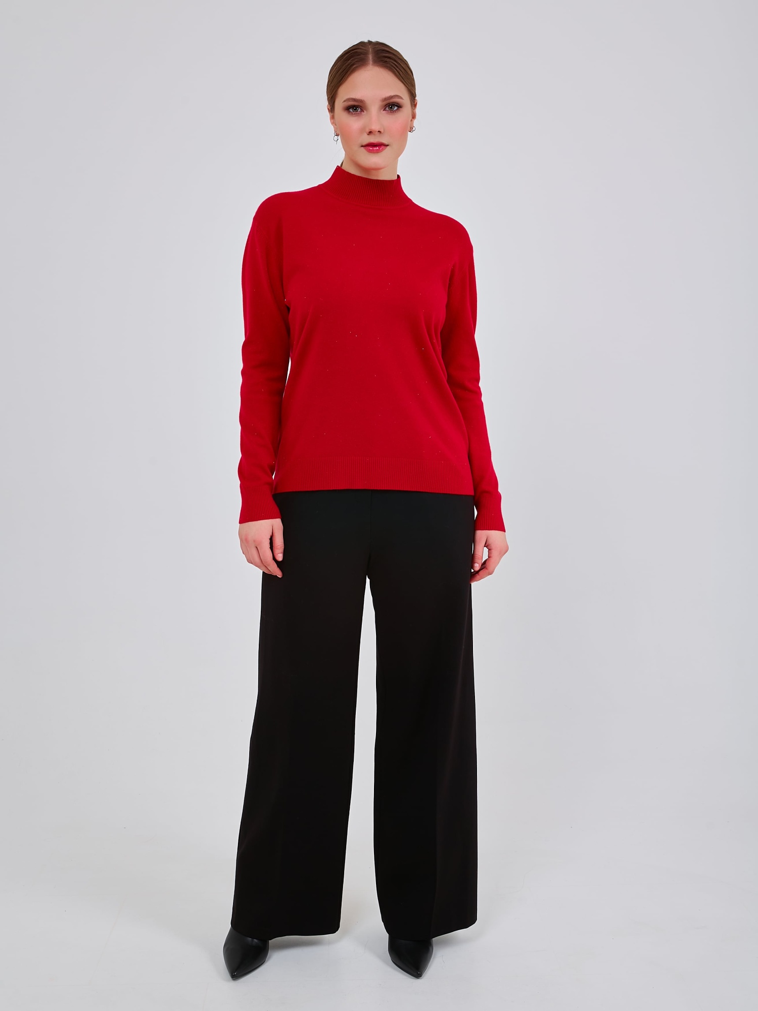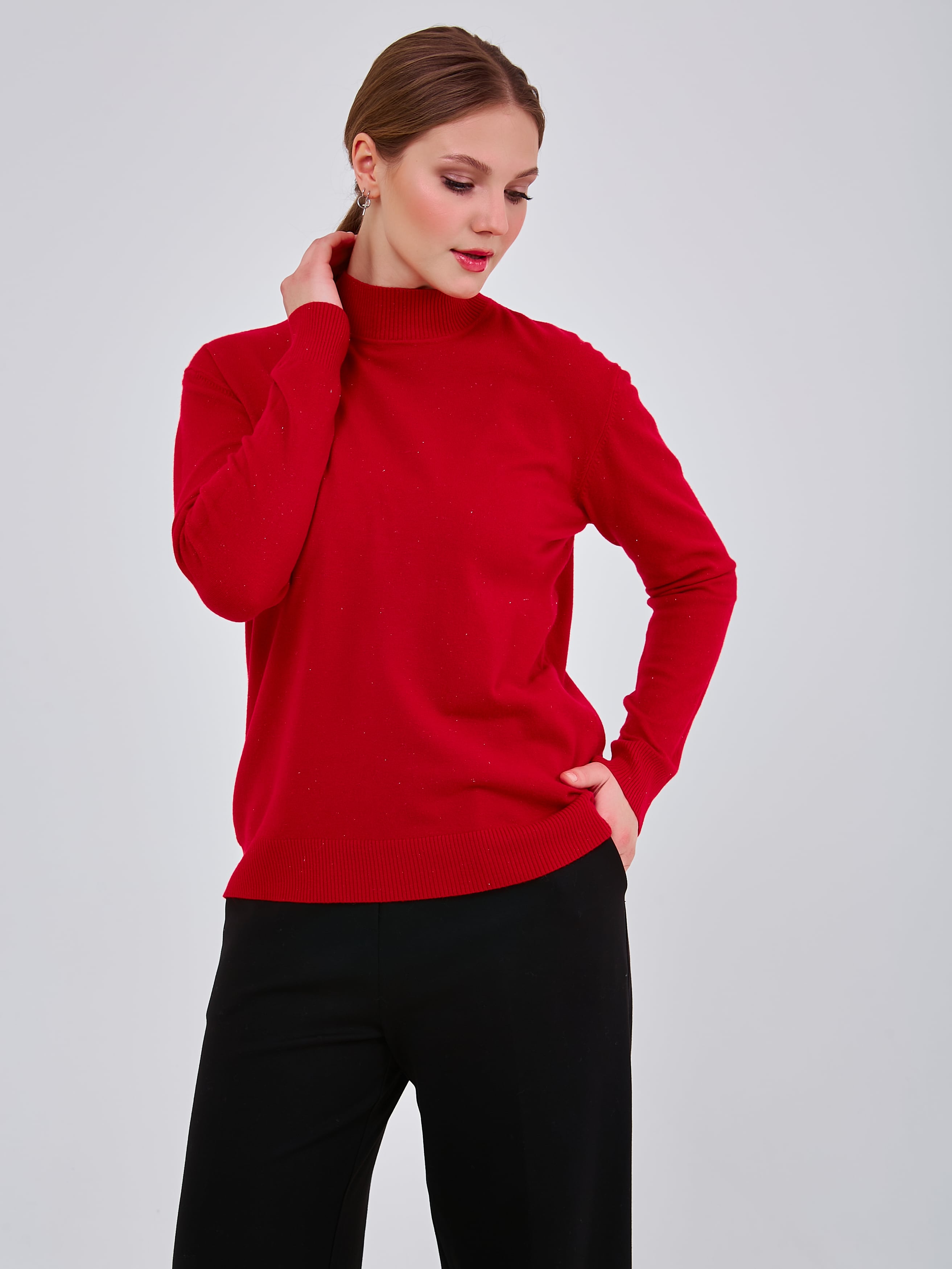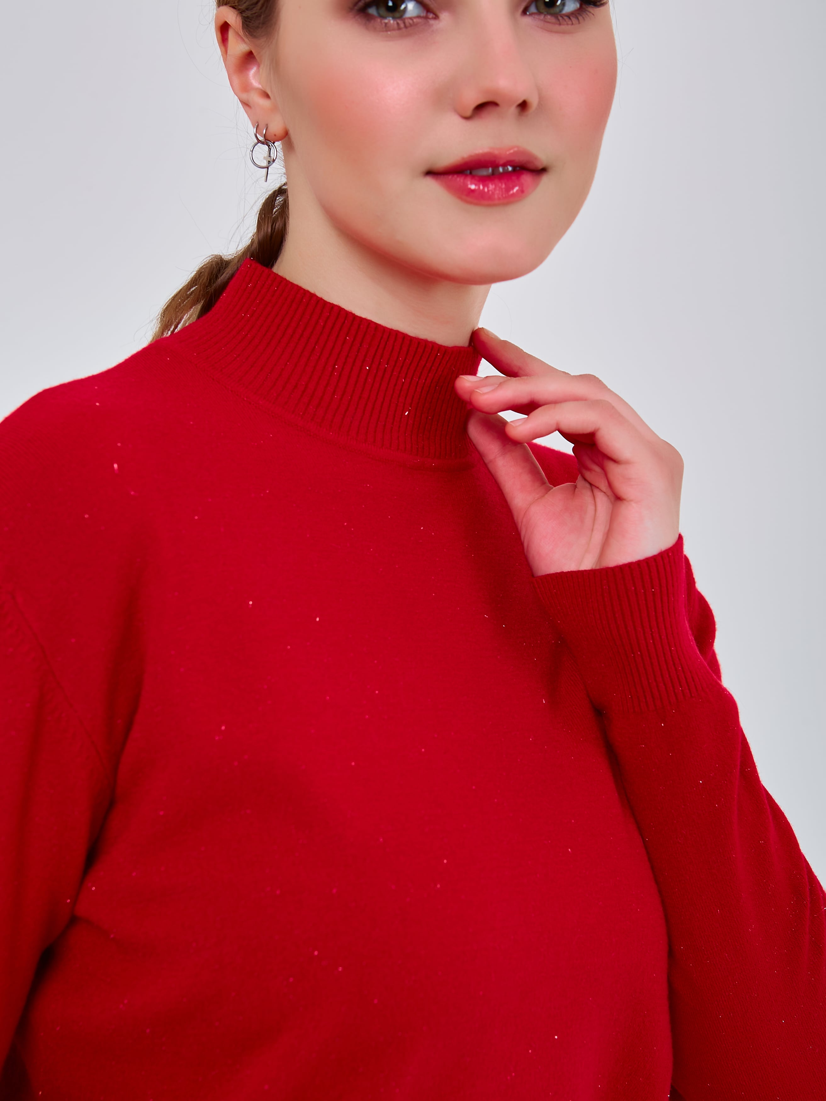 Свитер карминого цвета с резинками на манжетах и воротнике. Украшен лёгкой перфорацией по плечам и рукавам изделия. Коллекция Осень-Зима 2024-2025. Капсула "Амели".