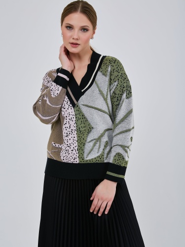 Пуловер с фантазийным принтом, спущенной линией плеча и эластичной резинкой по низу изделия и на манжетах. Осень-Зима'25/26. Капсула "Малахитовая шкатулка"
