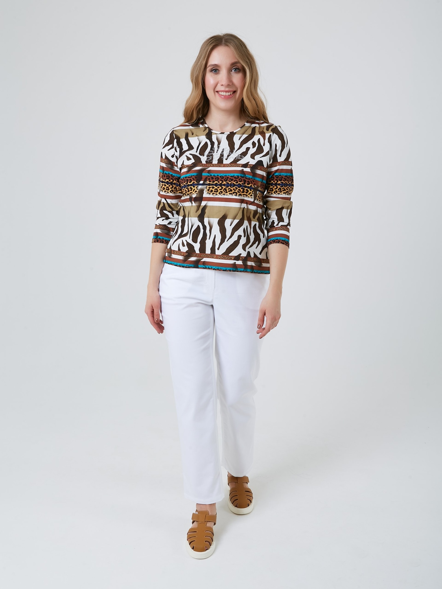 Лонгслив с рукавом 3/4, круглым вырезом и нетривиальным принтом собравшим все оттенки сафари. Коллекция Весна-Лето 2025. Капсула "Рио де Жанейро". Параметры модели: 89-70-92, рост 167, размер 44-46