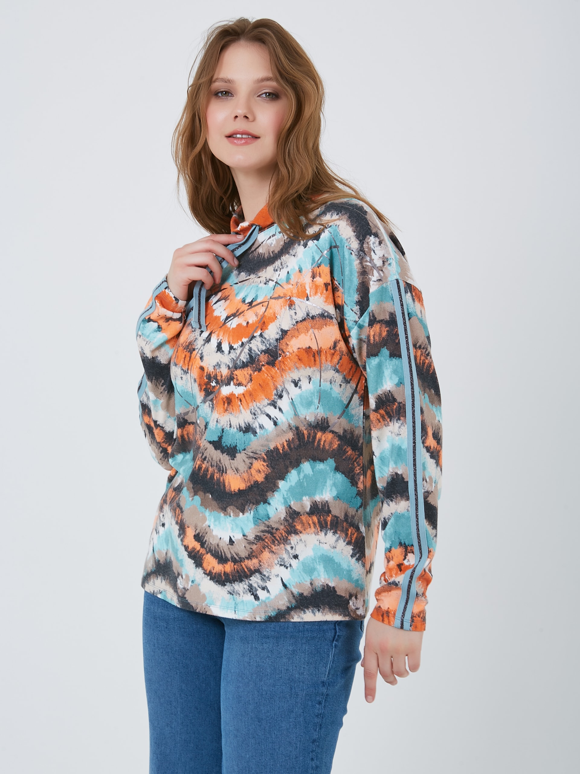 Принтованный лонгслив свободного кроя, обеспечивающий комфорт и свободу движений, с акцентными полосками на рукавах. Коллекция Весна-Лето 2025. Капсула "Санторини". Параметры модели: 95-64-101, рост 175, размер 44-46