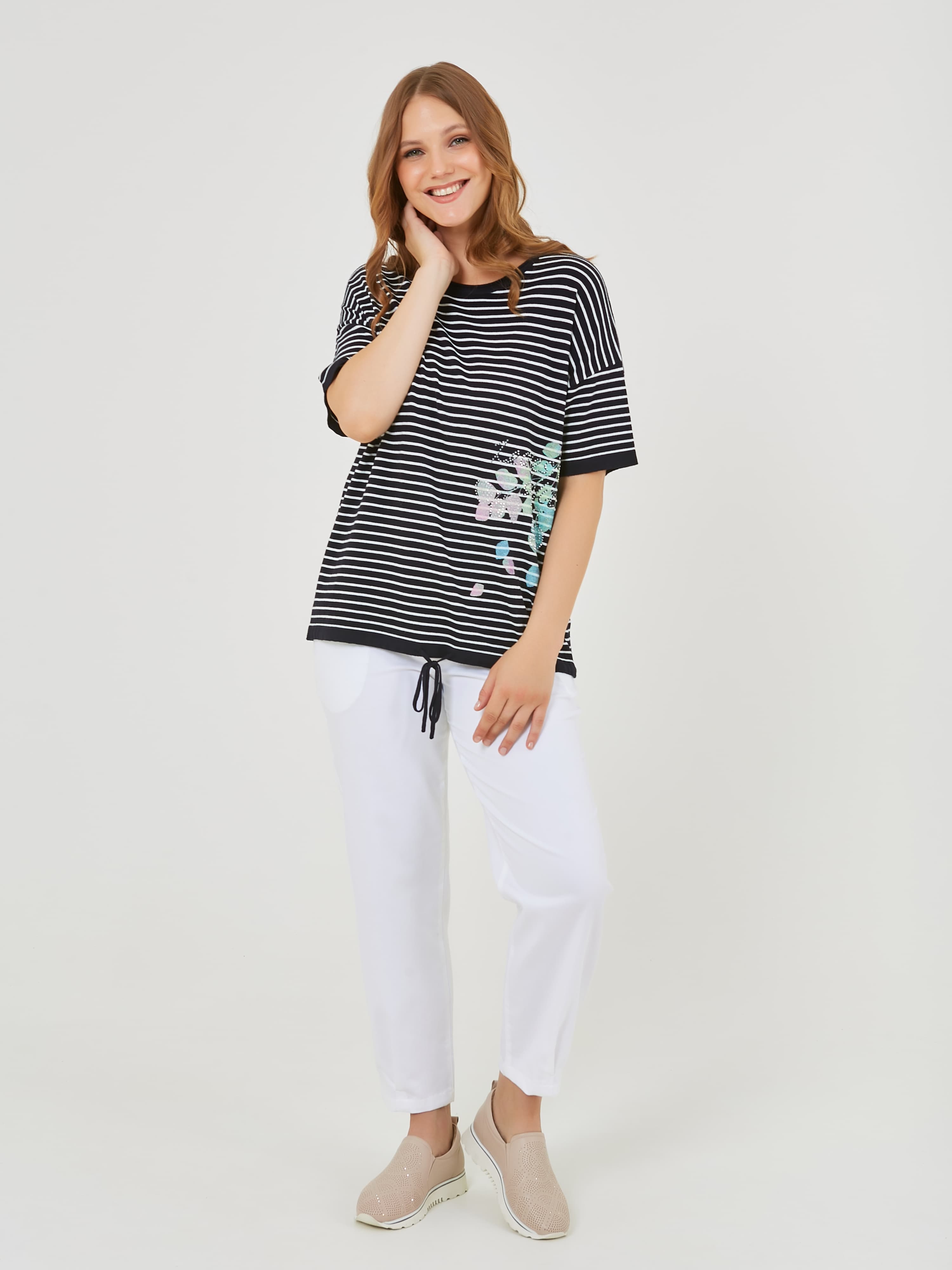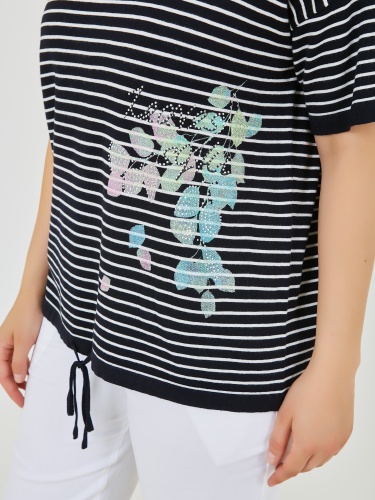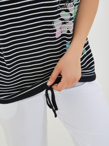 Джемпер в морскую полоску со спущенной линией плеча и кулиской по низу. Весна-Лето 2025. Капсула "Самарканд". Параметры модели: 95-64-101, рост 175, размер 44-46