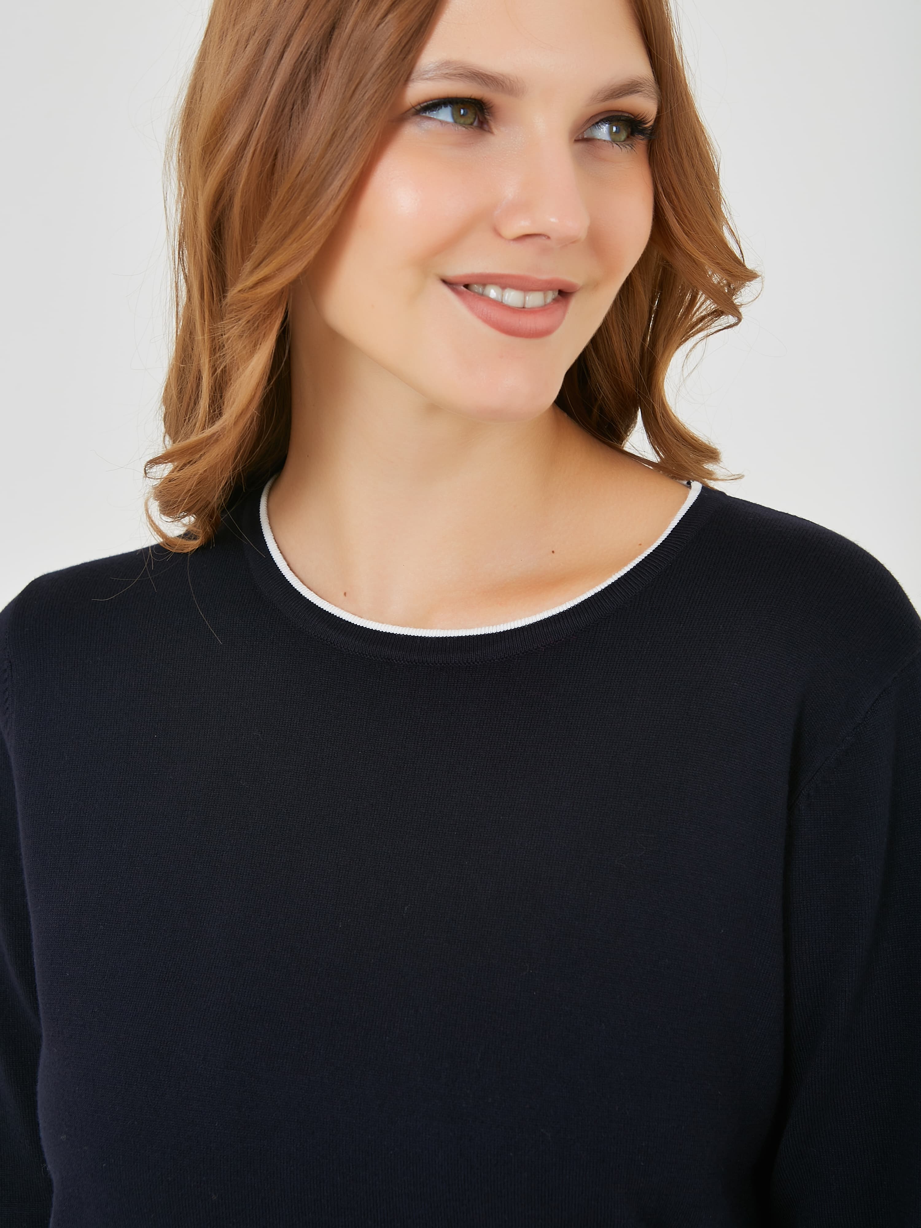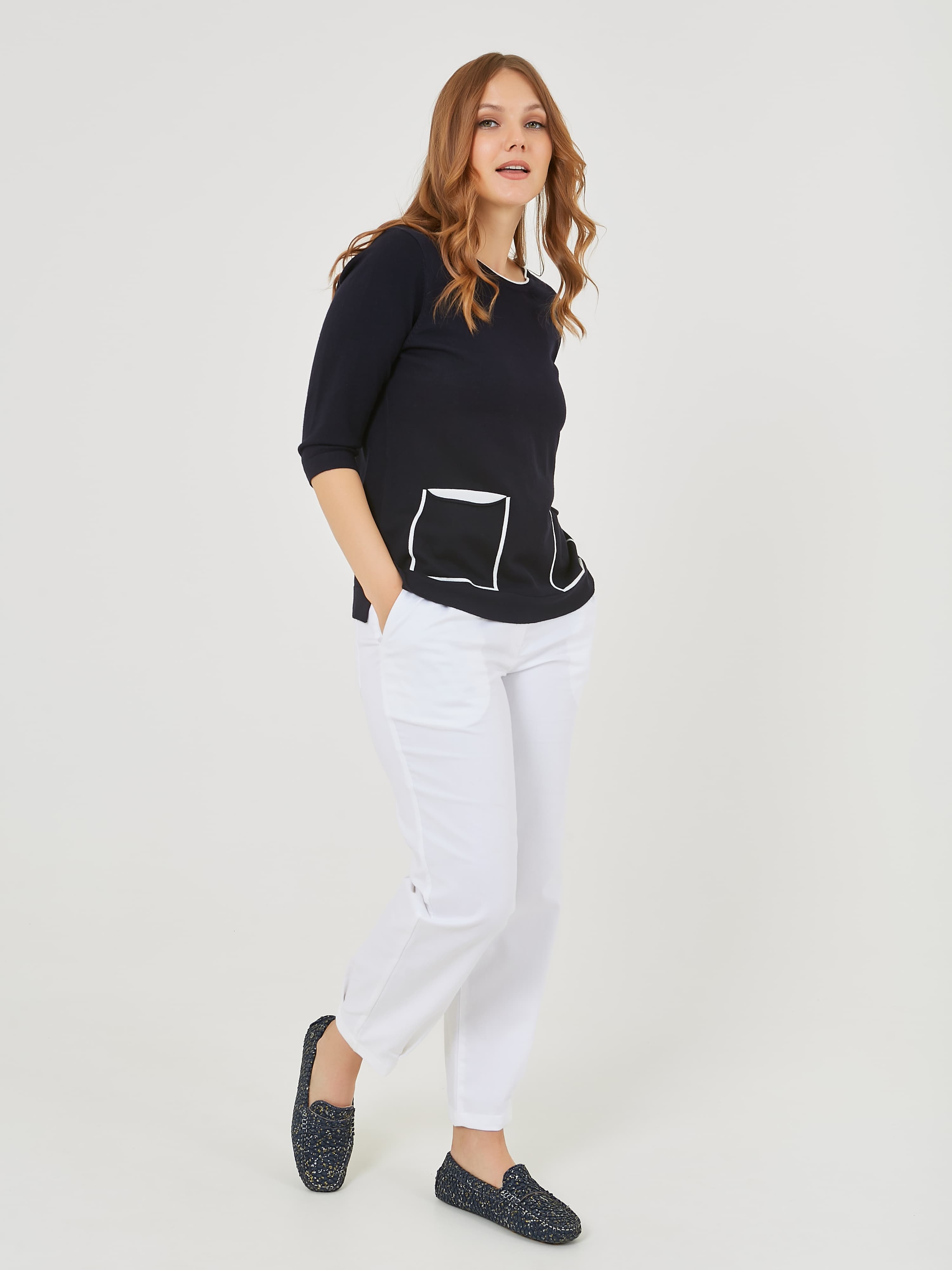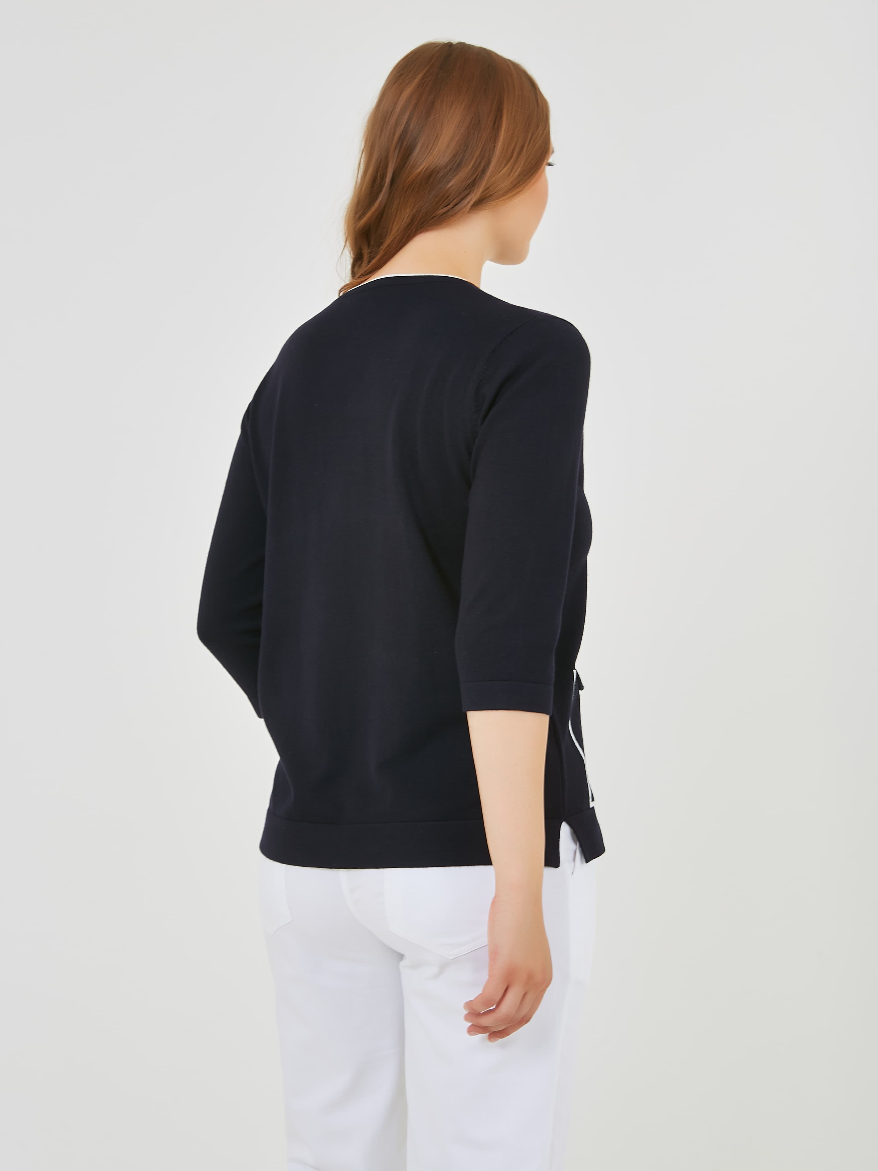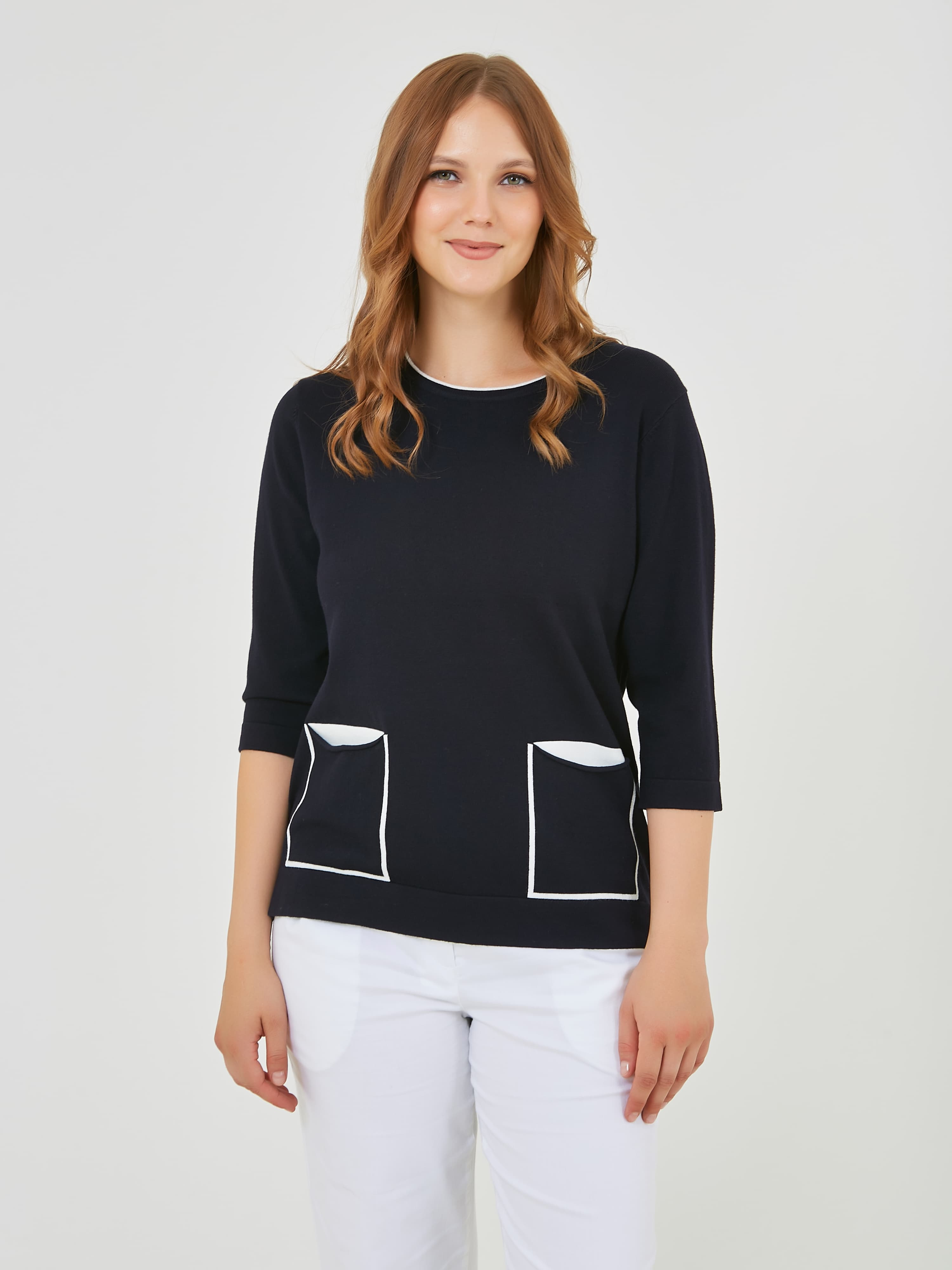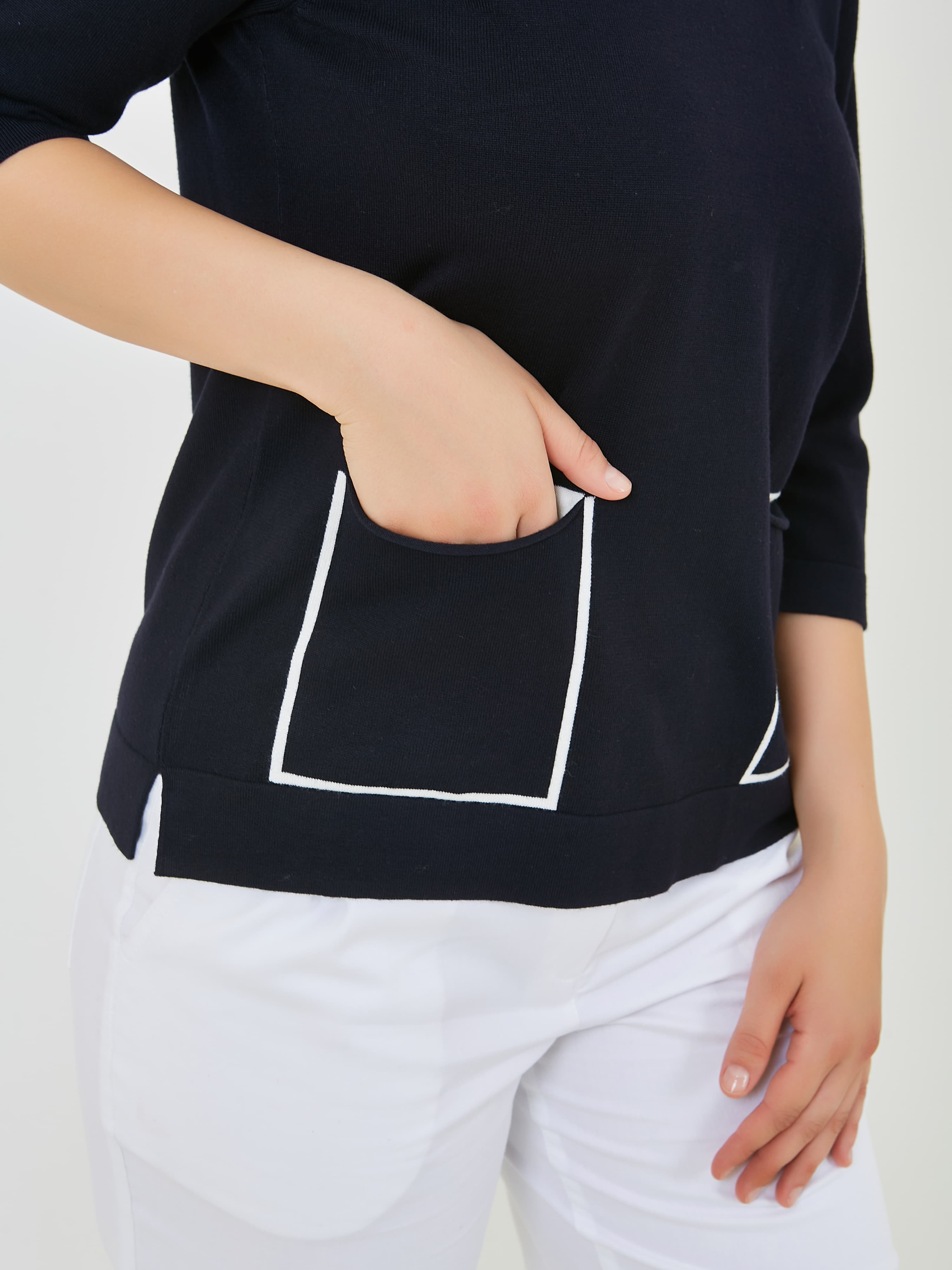 Джемпер с рукавом 3/4 и акцентными горловиной и карманами. Весна-Лето 2025. Капсула "Самарканд". Параметры модели: 95-64-101, рост 175, размер 44-46