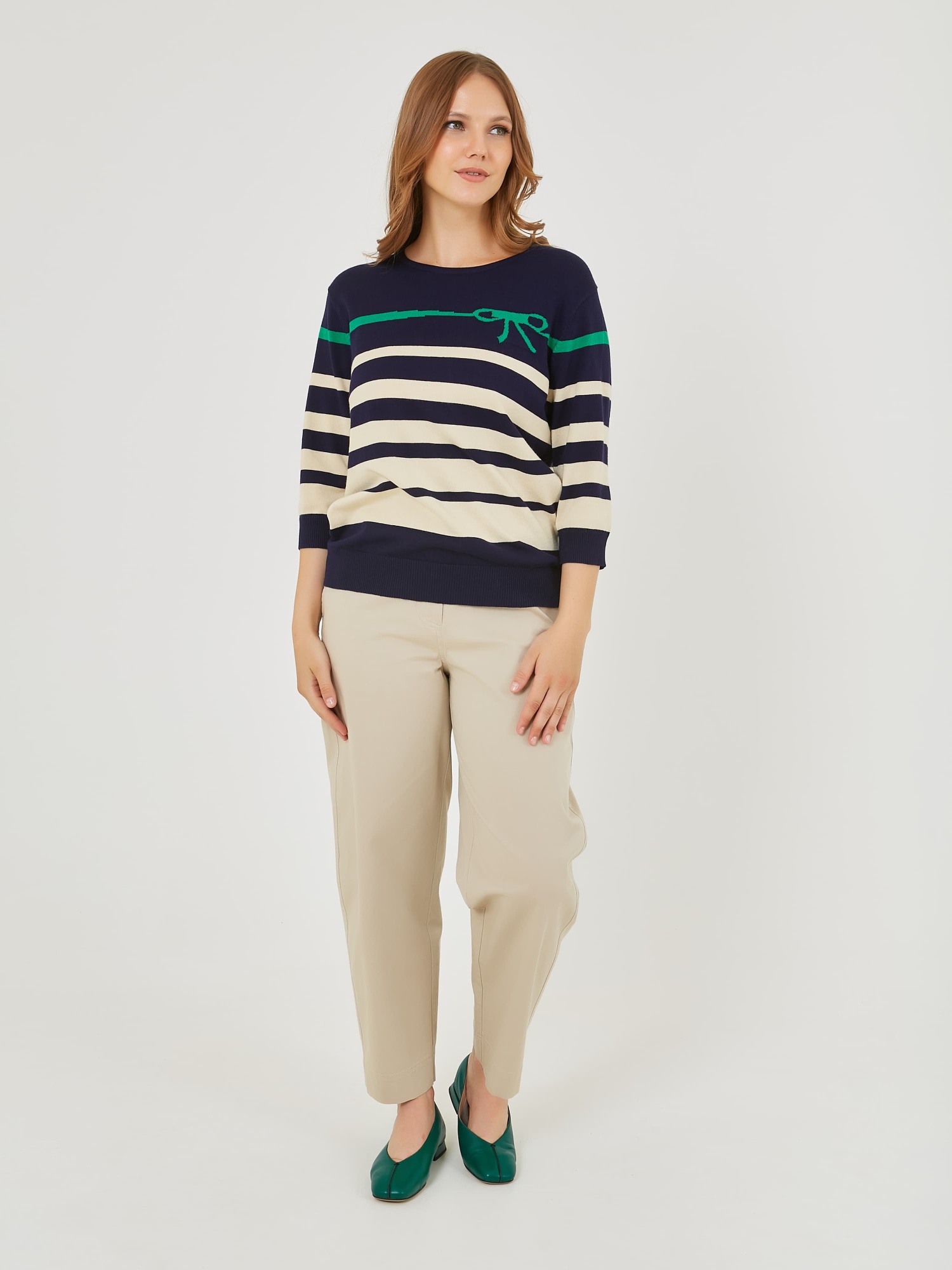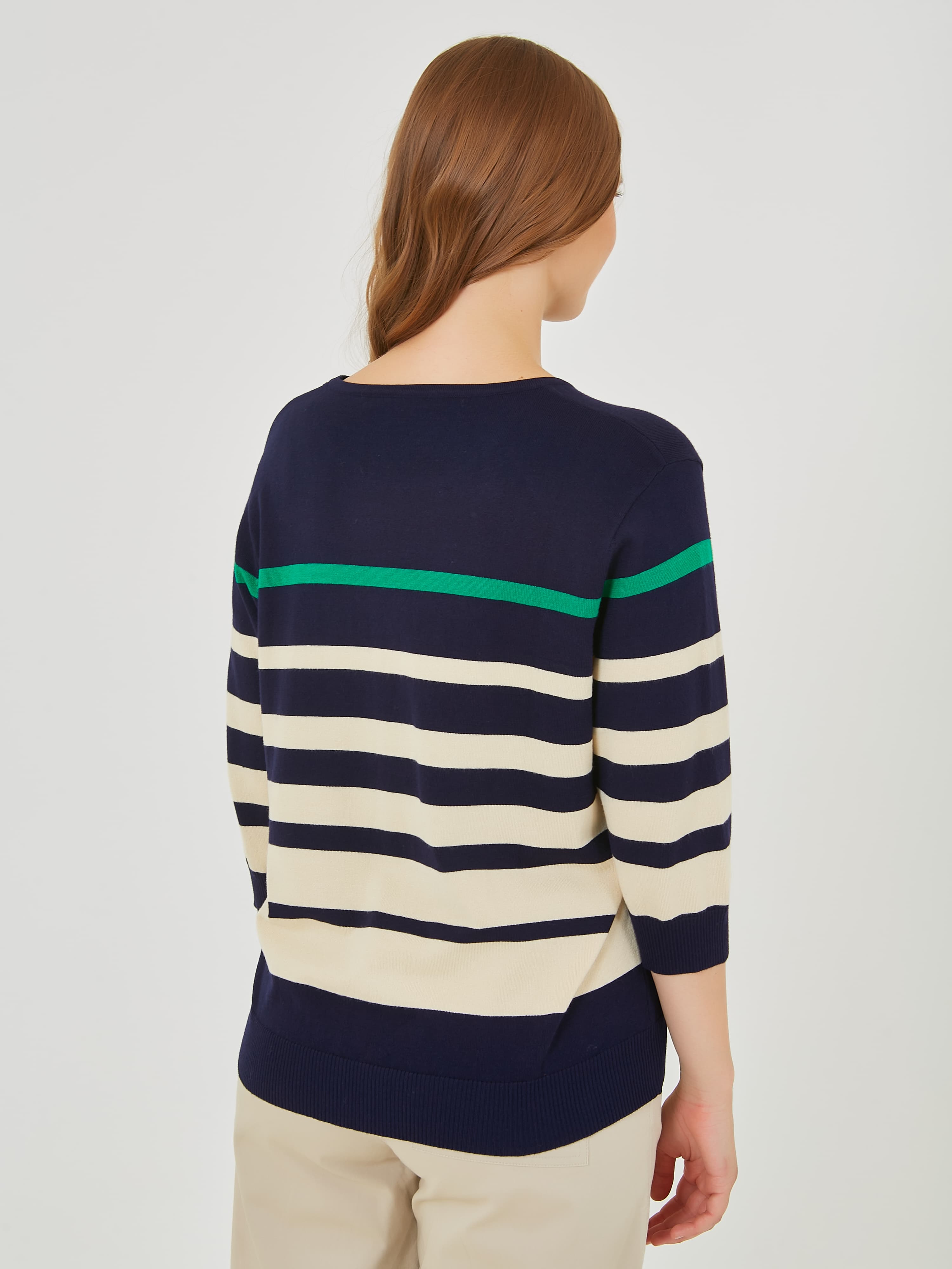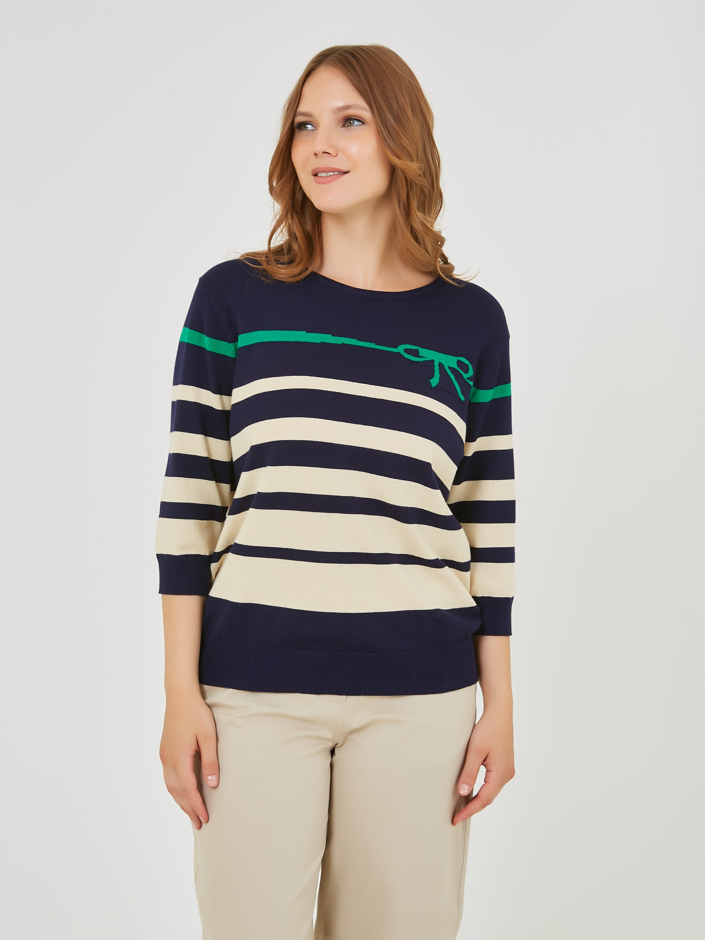 Классический джемпер с полосками различной ширины. Весна-Лето 2025. Капсула "Марракеш". Параметры модели: 95-64-101, рост 175, размер 44-46