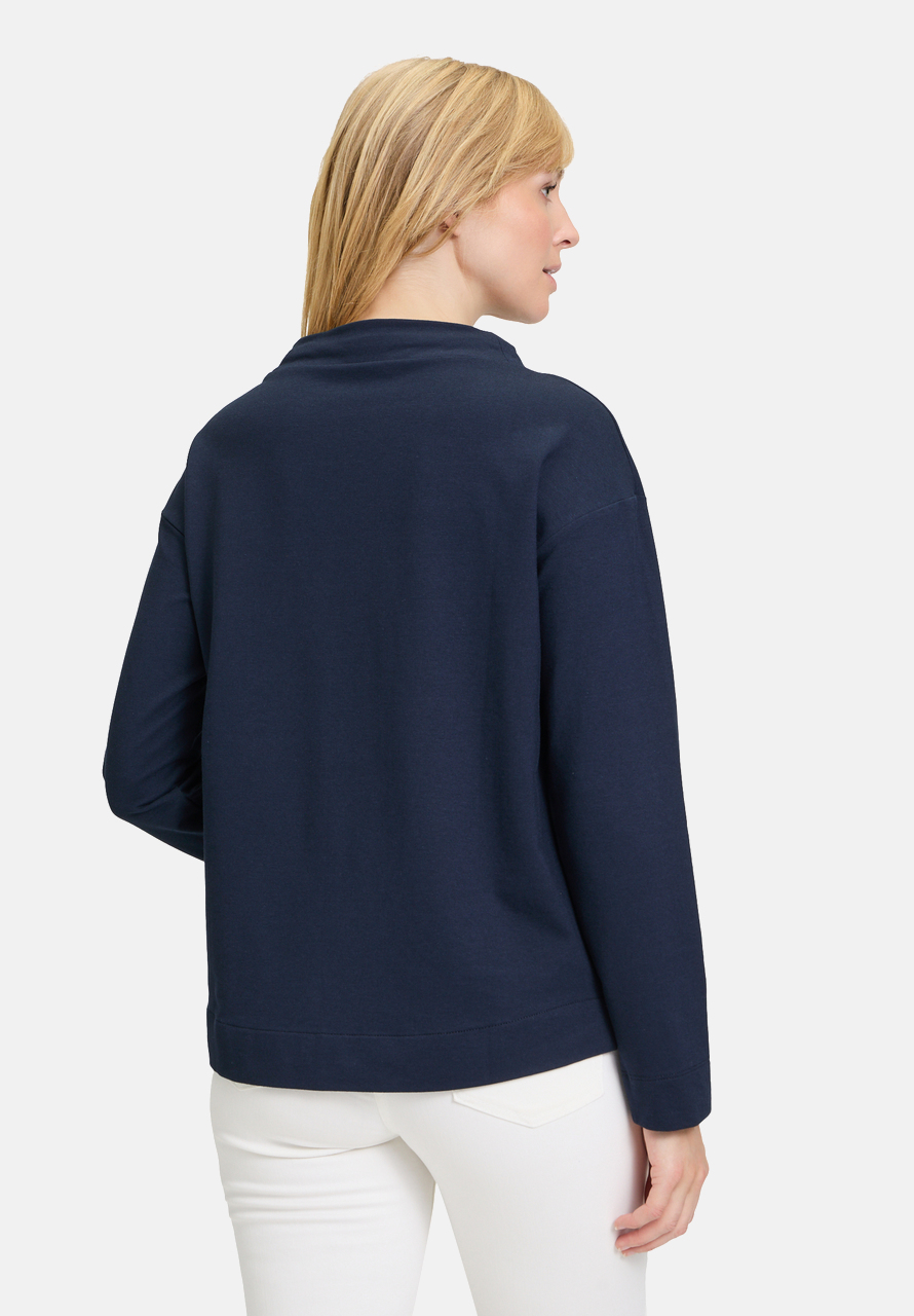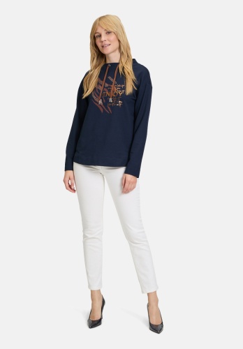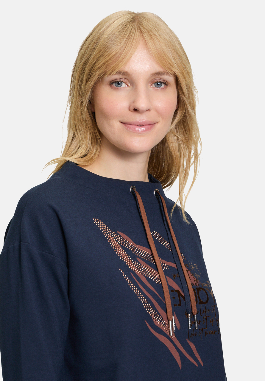 Свитшот женственный и стильный предмет одежды. Заниженная пройма и длинные рукава придают изделию модный вид. Толстовка имеет воротник-стойку и украшена привлекательным рисунком в виде животных и сверкающими стразами. Прямой крой создает современный и женственный силуэт