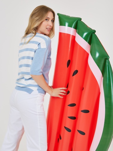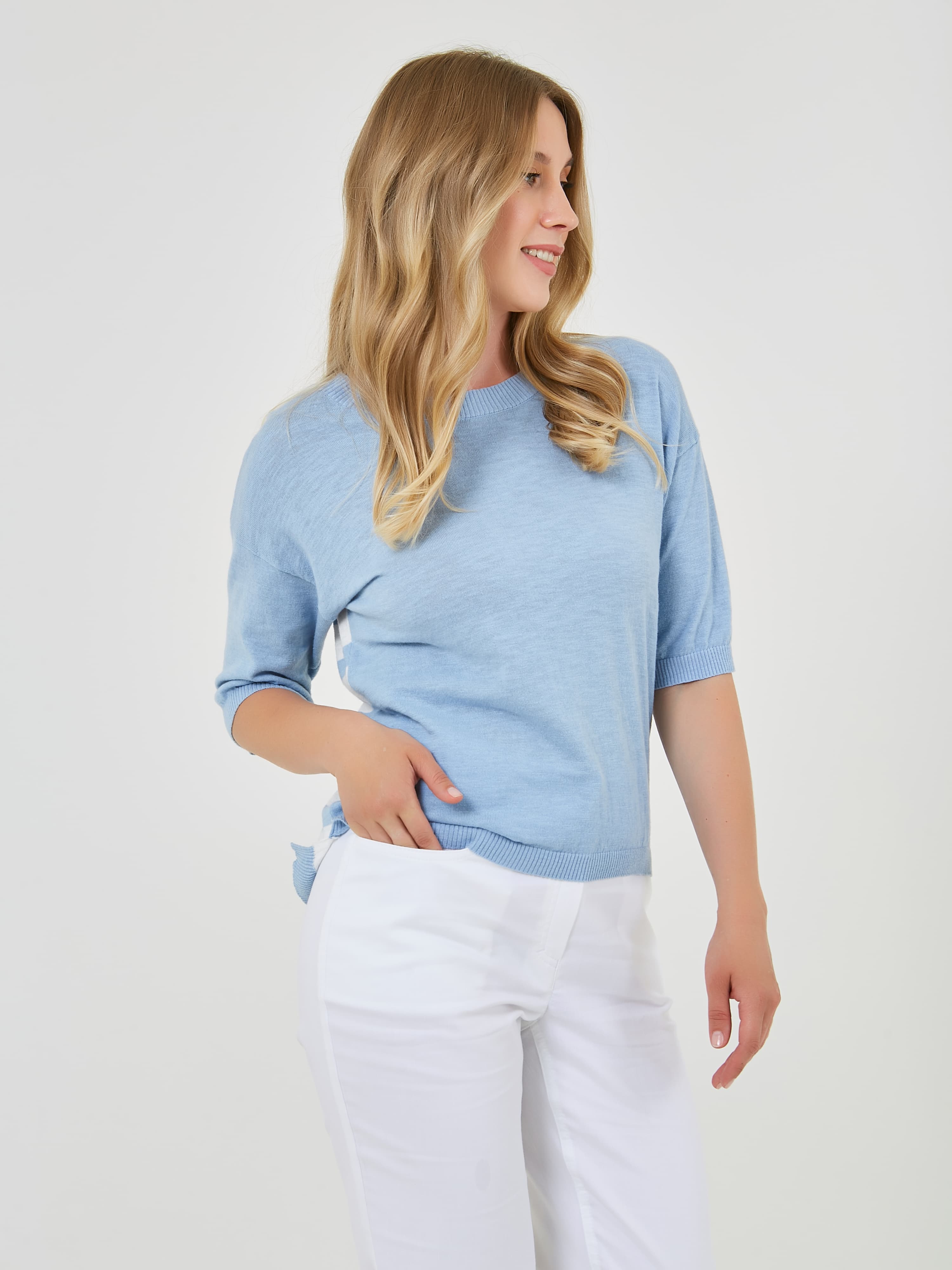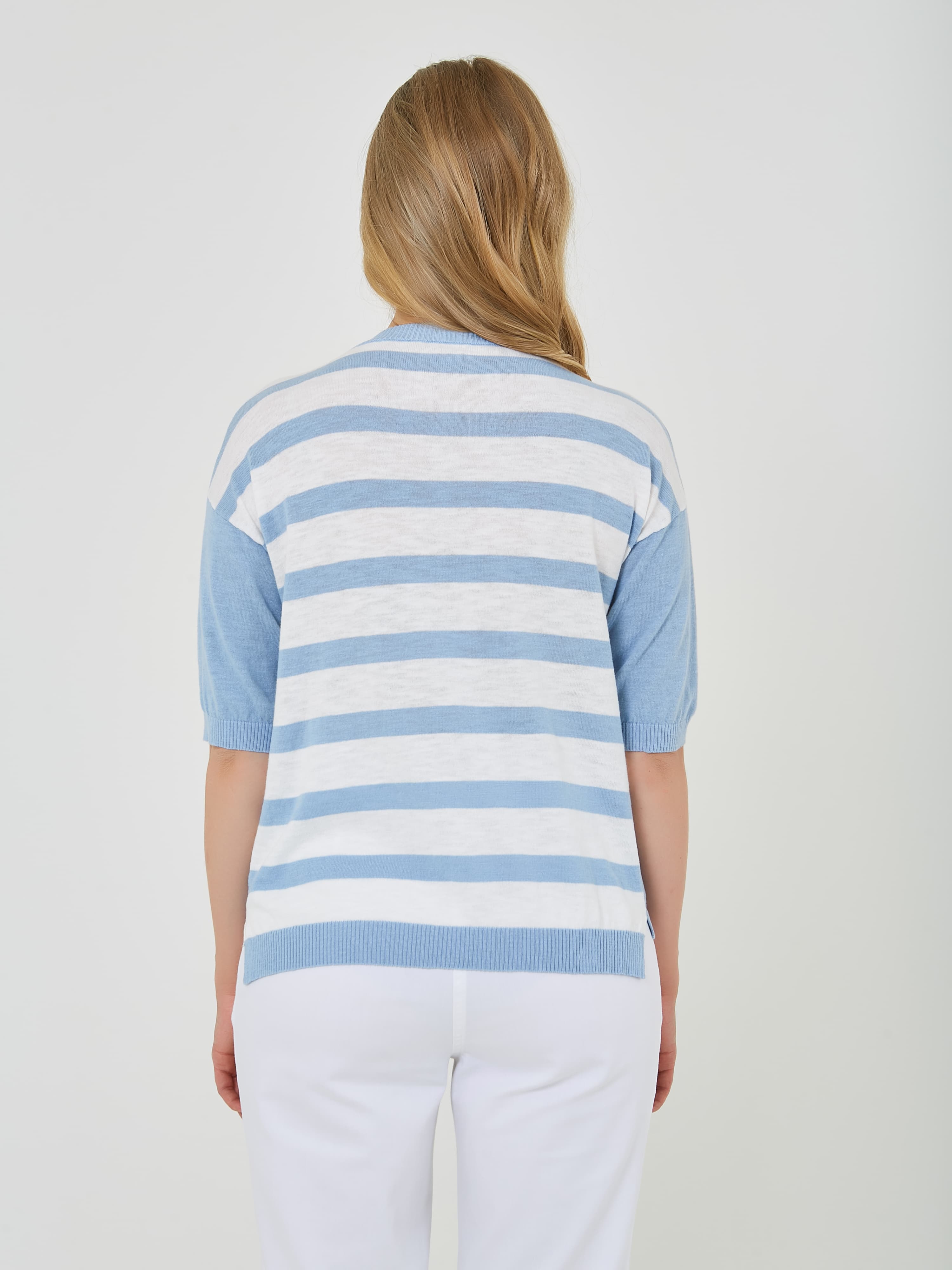 Джемпер выполнен в мягких голубых оттенках с полосатой спиной, что придаёт ему свежий и летний вид. Модель с коротким рукавом и лёгким палантином идеально подходит для уютных вечеров и комбинируется с различной одеждой. Коллекция Весна-Лето 2025. Капсула "Санторини". Параметры модели: 89-70-92, рост 167, размер 44-46