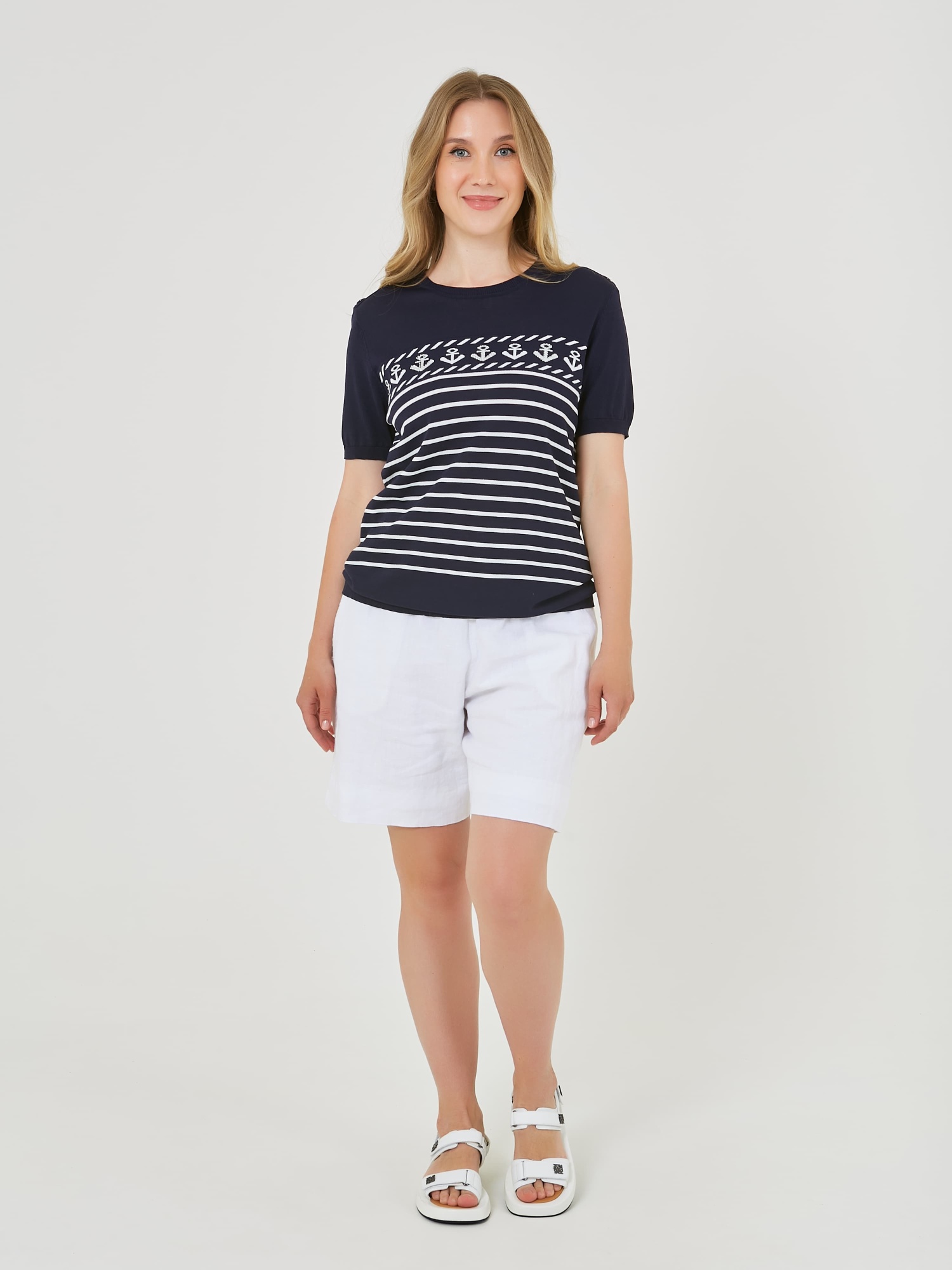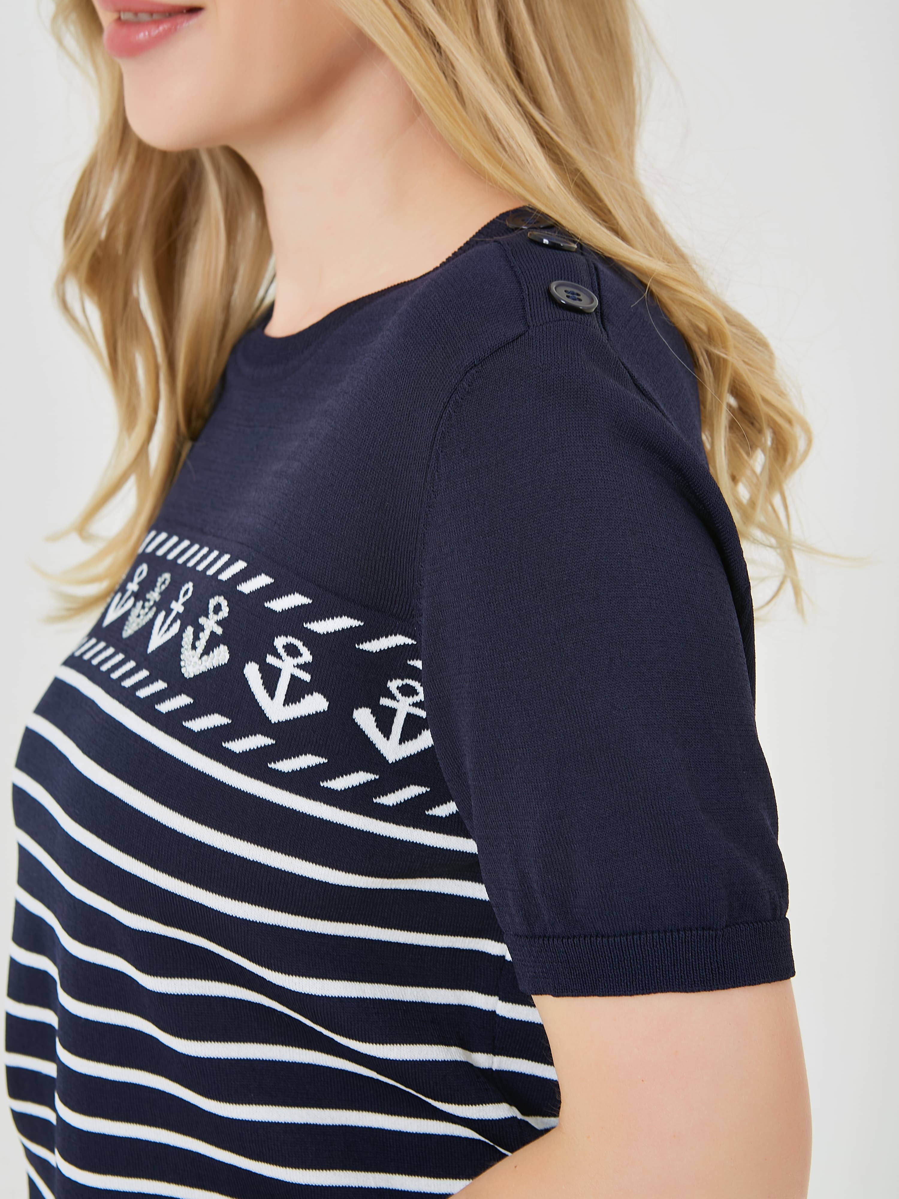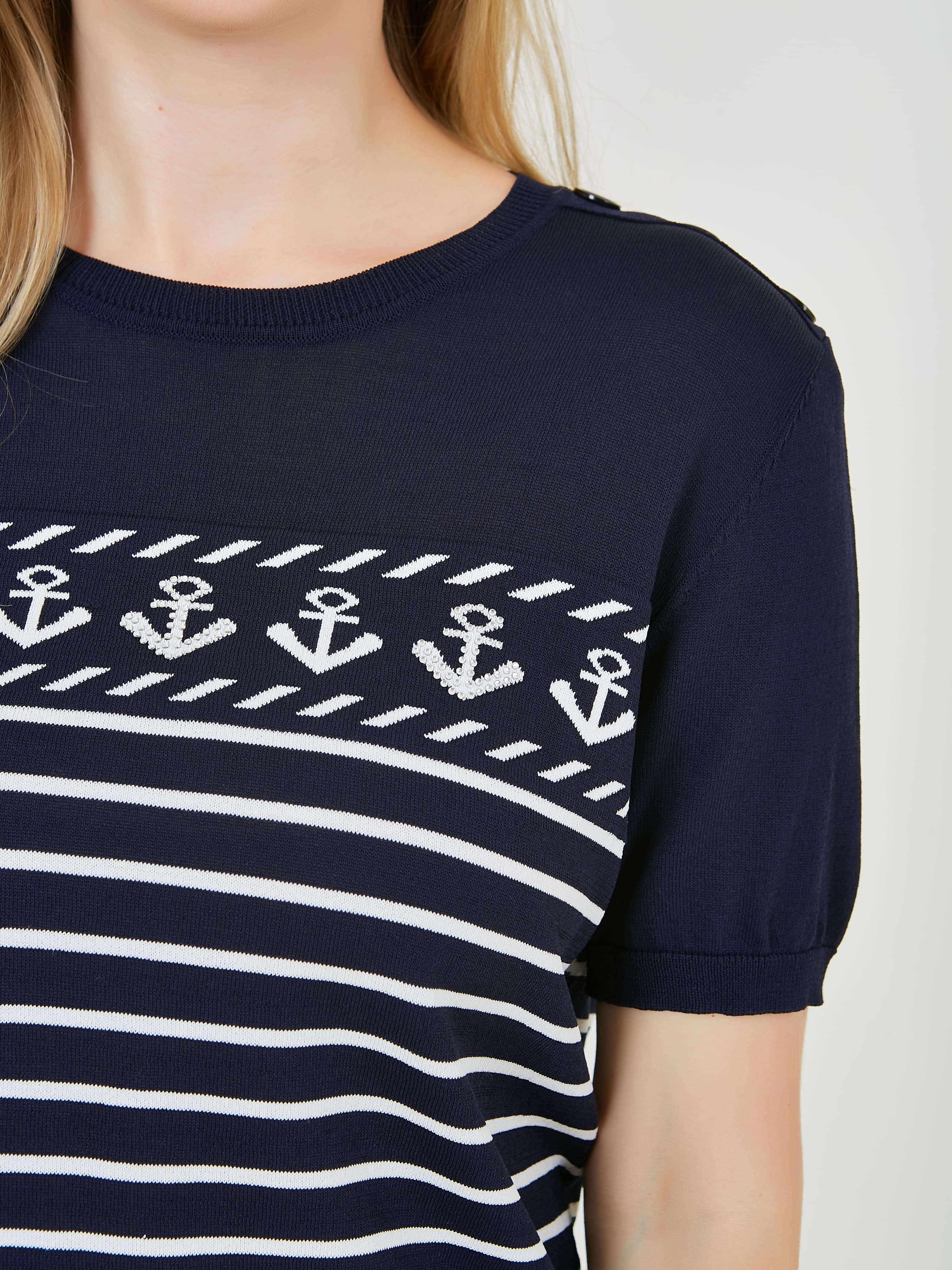Джемпер выполнен в темно-синем цвете и украшен горизонтальными полосками и узором с якорями. Короткие рукава и комфортный крой, делает его подходящим для теплой погоды и повседневного ношения. Коллекция Весна-Лето 2025. Капсула "Самарканд". Параметры модели: 89-70-92, рост 167, размер 44-46