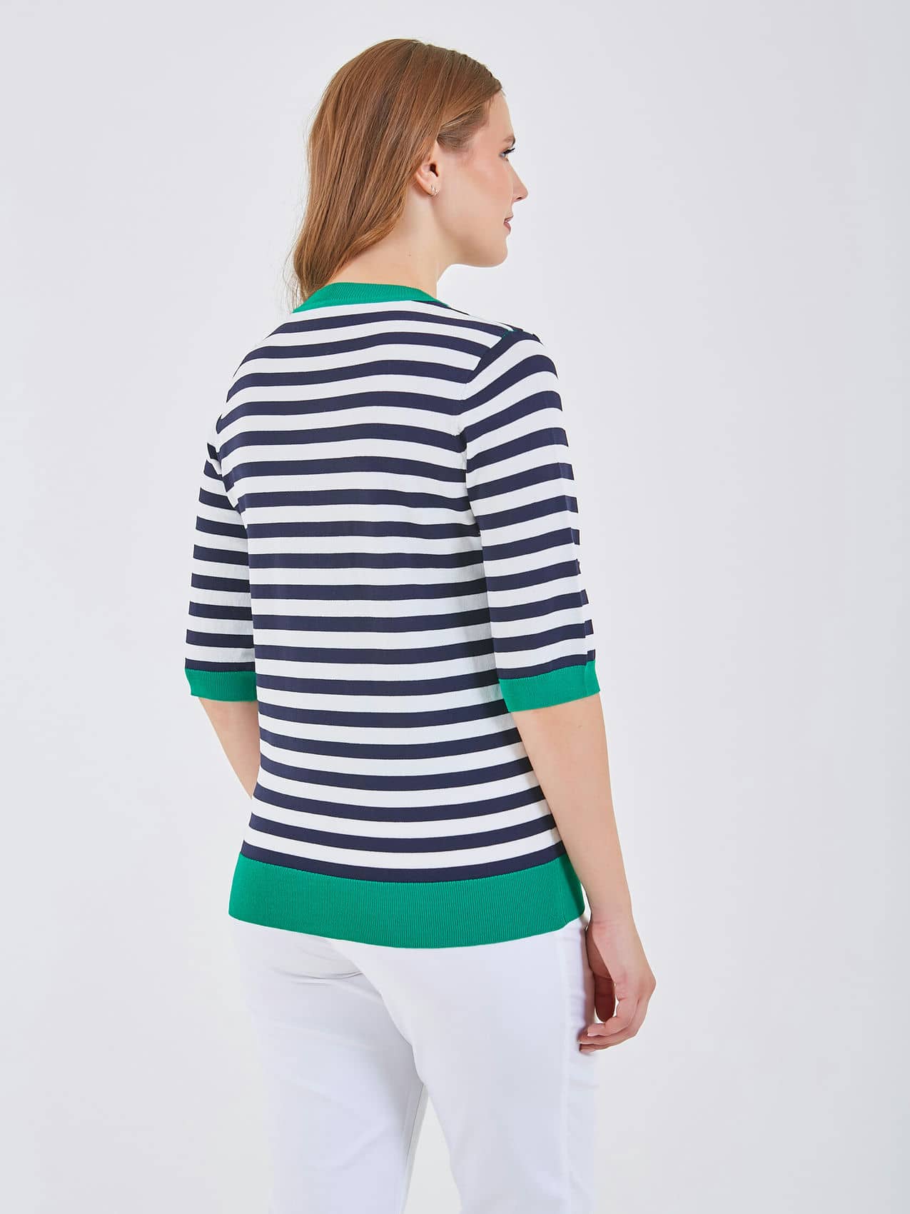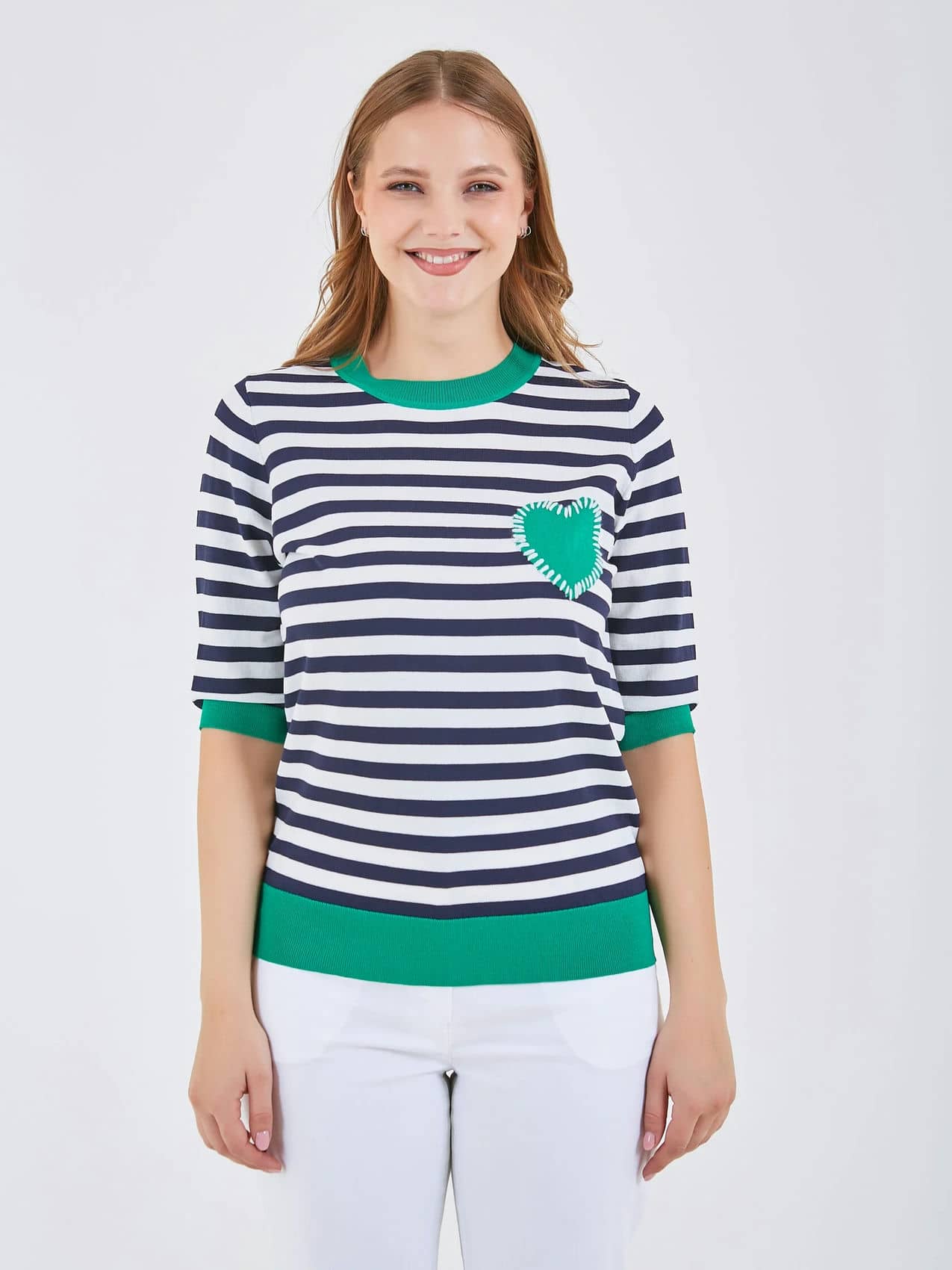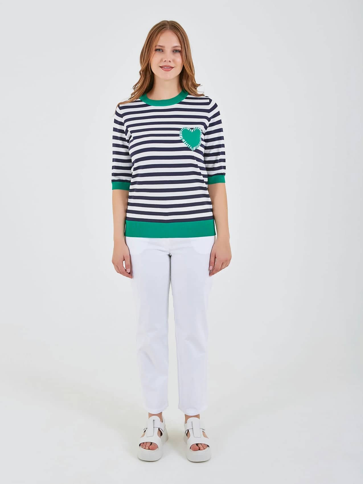 Джемпер имеет полосатый рисунок в черно-белых тонах с ярким зеленым воротником и акцентом в форме сердца. Свободный крой и короткие рукава обеспечивают комфорт, идеально подходя для повседневного носки. Коллекция Весна-Лето 2025. Капсула "Марракеш". Параметры модели: 95-64-101, рост 175, размер 44-46