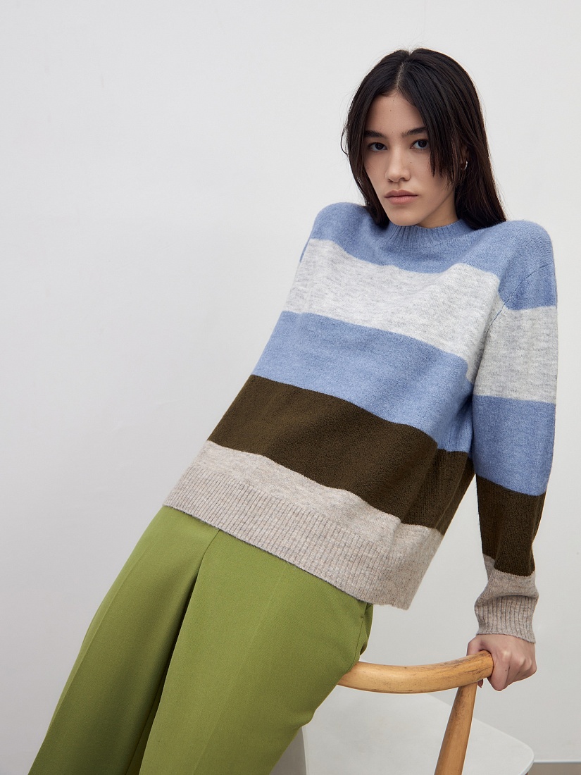 Уютный базовый свитер в полоску, круглый вырез горловины, рукав полной длины. Благодаря смесовомой композиции пряжи и содержанию овечьей шерсти свитер имеет мягкую дышащую поверхность, которая приятна при соприкосновении с кожей.
