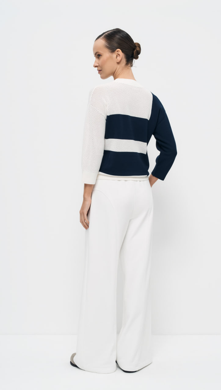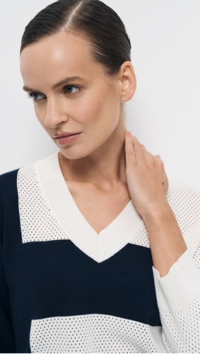 Пуловер прямого силуэта «Черничный пирог» выполнен в интарсионном переплетении, сочетающем ажурную вязку и кулирную гладь, что обеспечивает комфорт и тепло, при этом выглядит стильно и современно. Яркое контрастное сочетание двух цветов ставит акцент в повседневном образе. Рукав прямой, длиной ¾, а горловина имеет V-образную форму, что придаёт изделию элегантный и современный вид.