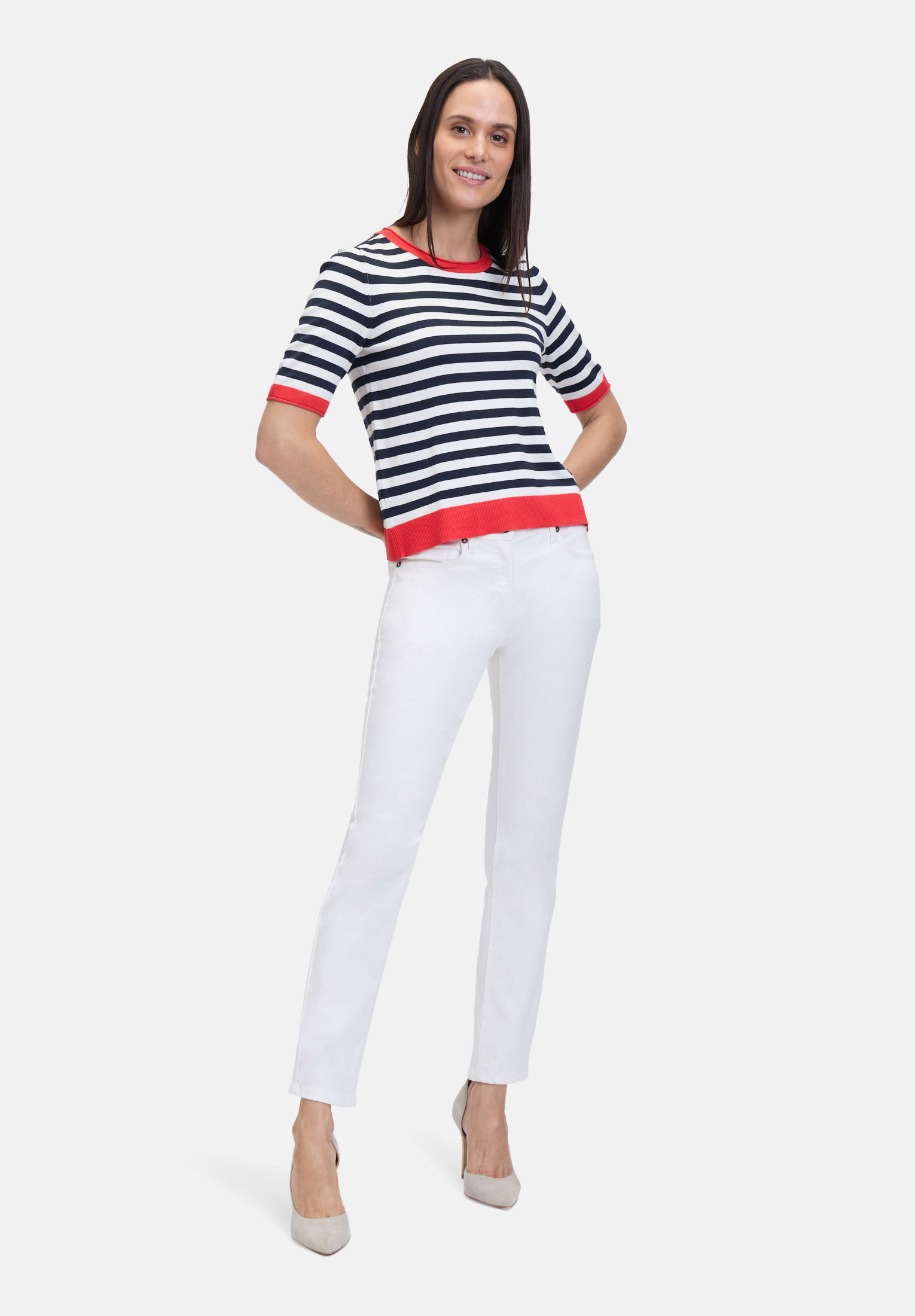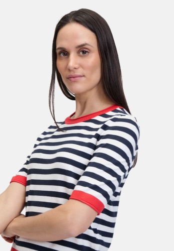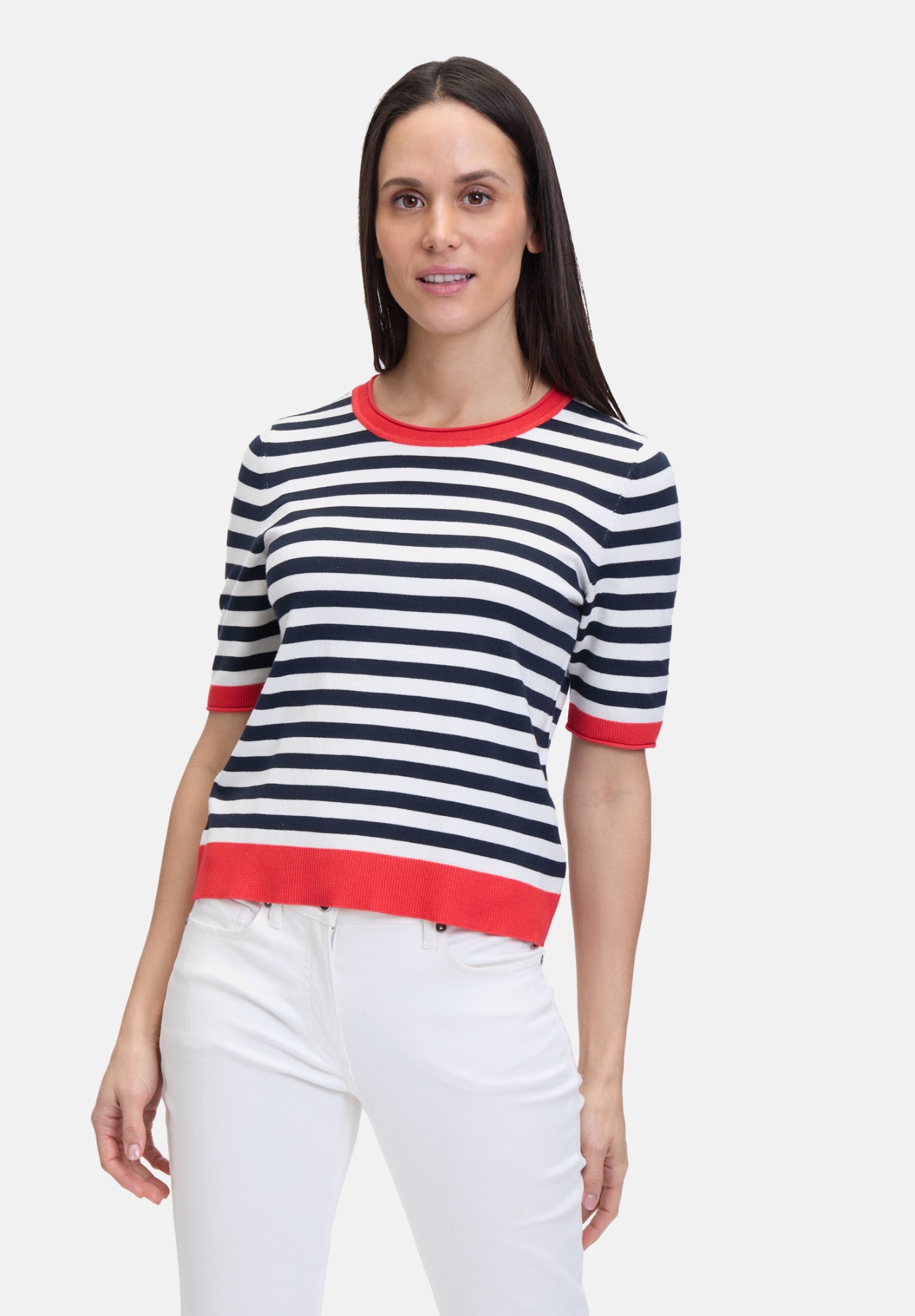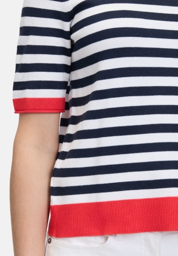 Этот базовый свитер в модном стиле колор-блок вдохнёт новую жизнь в ваш гардероб. Прямой крой и эффектные полоски создают современный спортивный образ. Круглый вырез и короткие рукава идеально подходят для создания непринуждённых летних образов.