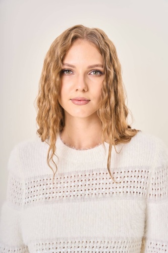 Женский молочный пушистый джемпер элегантно сочетает различные фактуры и техники вязки создавая стильный объемный рисунок. Идеально подчеркивает все преимущества фигуры корректируя недостатки благодаря мягкому облегающему крою. Рельефные полосы визуально добавляют объема и создают ощущение многослойности. Мягкий материал приятен к телу, обеспечивает тепло и уют в прохладное время года. Осень-Зима'25/26. Капсула "Вишневый сад"