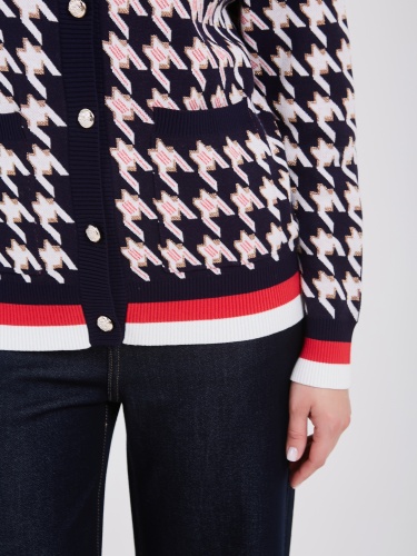 Темно-синий кардиган с узором "гусиная лапка" белого и розового цветов сочетает в себе классический стиль и современный дизайн. Застежка на несколько светлых пуговиц добавляет элегантности, а нижняя часть кардигана с белой и красной полоской создает яркий акцент. Такой кардиган станет универсальным выбором для создания любых образов. Осень-Зима'25/26. Капсула "Алые Паруса"