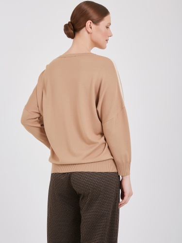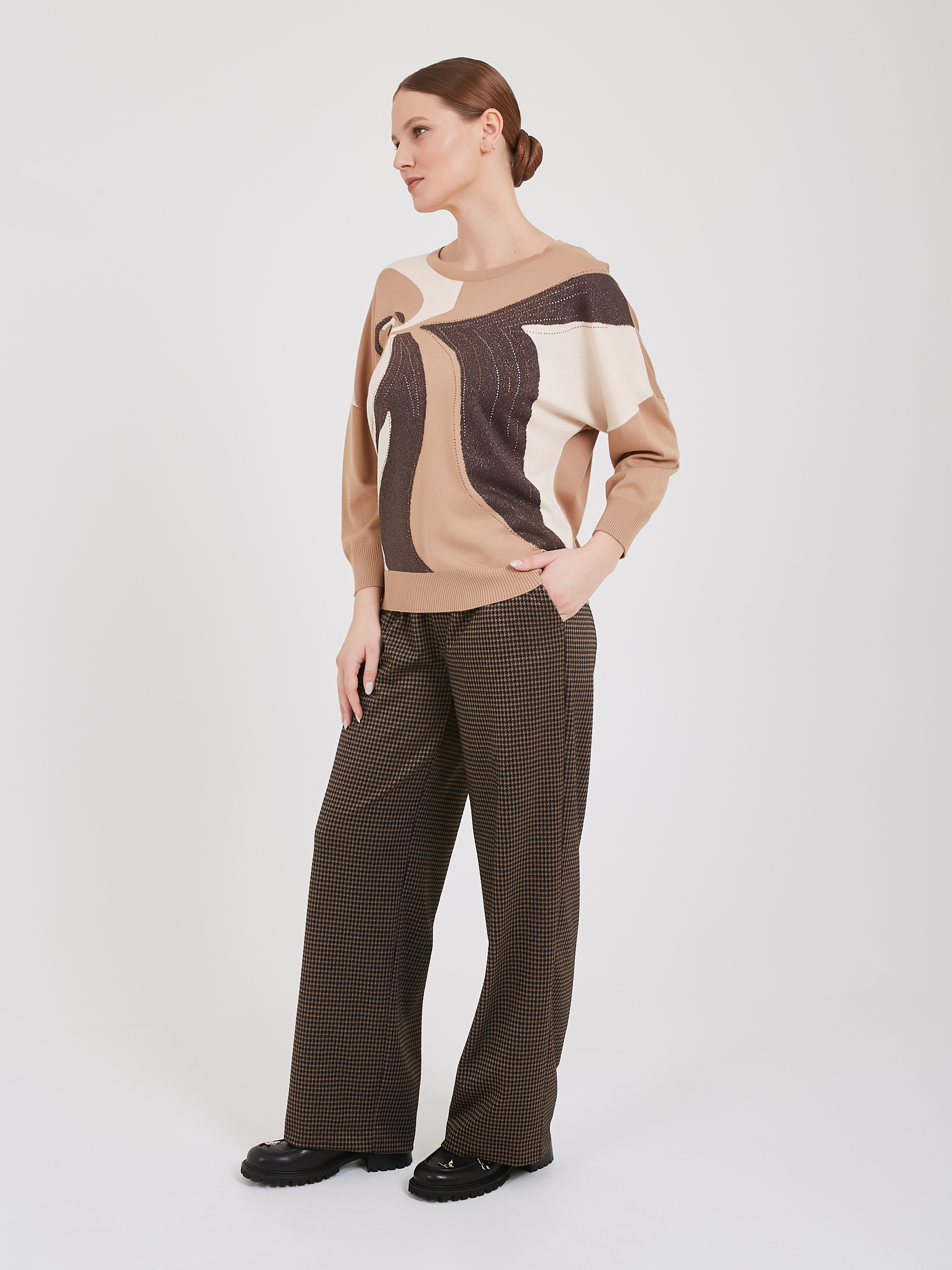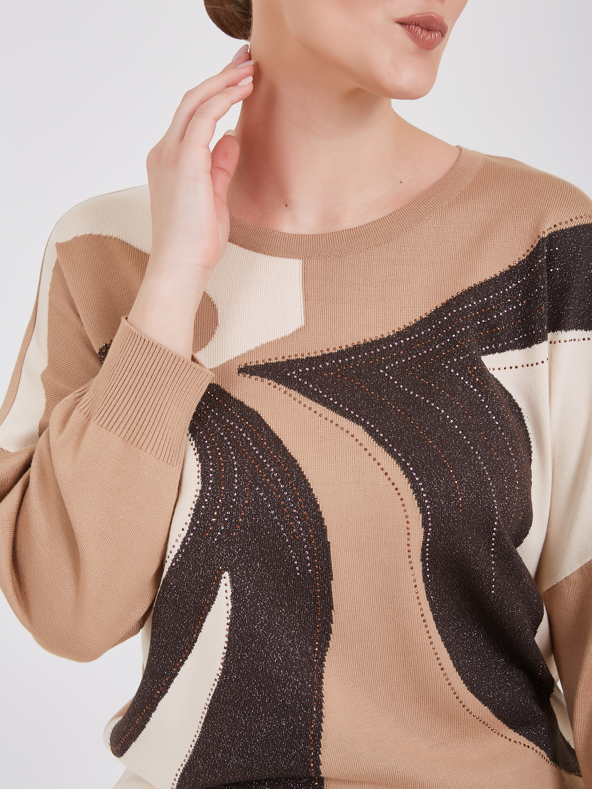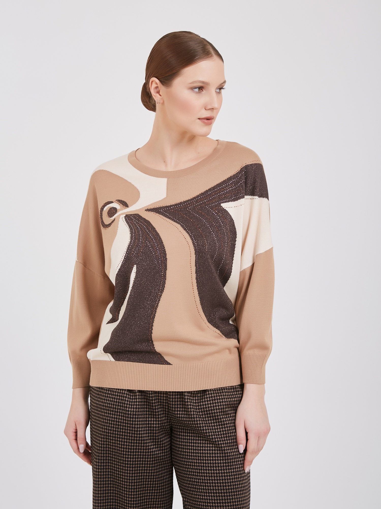 Женская бежево-коричневая кофта свободного силуэта. Круглый вырез и длинные рукава добавляют образу мягкости и утонченности. Волнистые линии и геометрический узор гармонично сочетаются друг с другом, создавая оригинальный дизайн.Состав ткани обеспечивает комфорт даже в холодную погоду.Осень-Зима'25/26. Капсула "Вино из одуванчиков"
