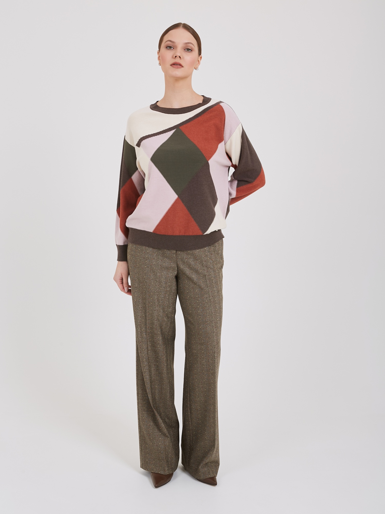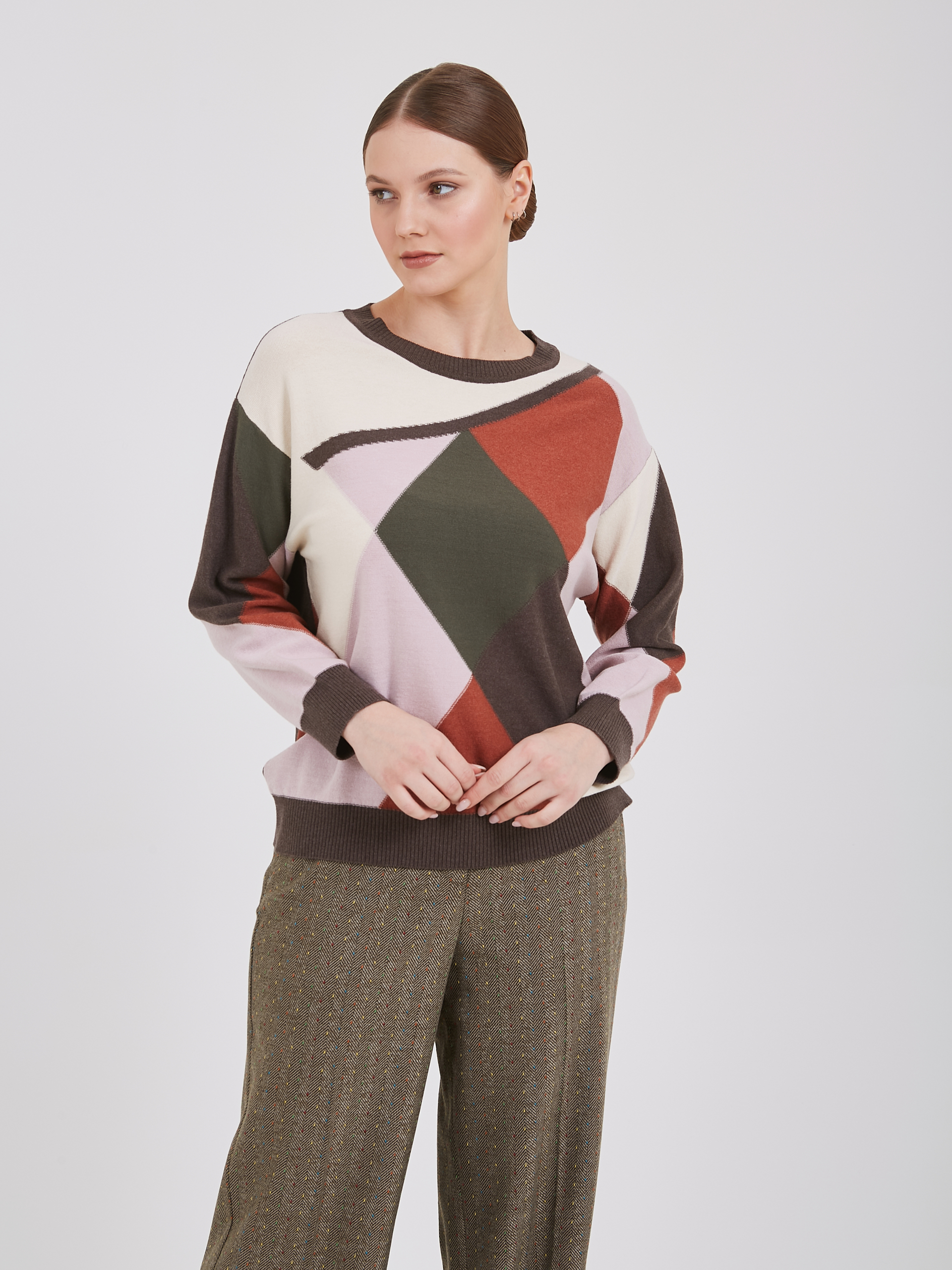 Свитер с выразительным геометрическим узором из коллекции известного бренда. Многоцветная палитра включает благородные оттенки коричневого, оливкового, нежного розового и теплого кремового цветов. Круглый ворот подчеркивает линию шеи, а длинные рукава обеспечивают комфорт и тепло. Осень-Зима'25/26. Капсула "Хозяйка медной горы"