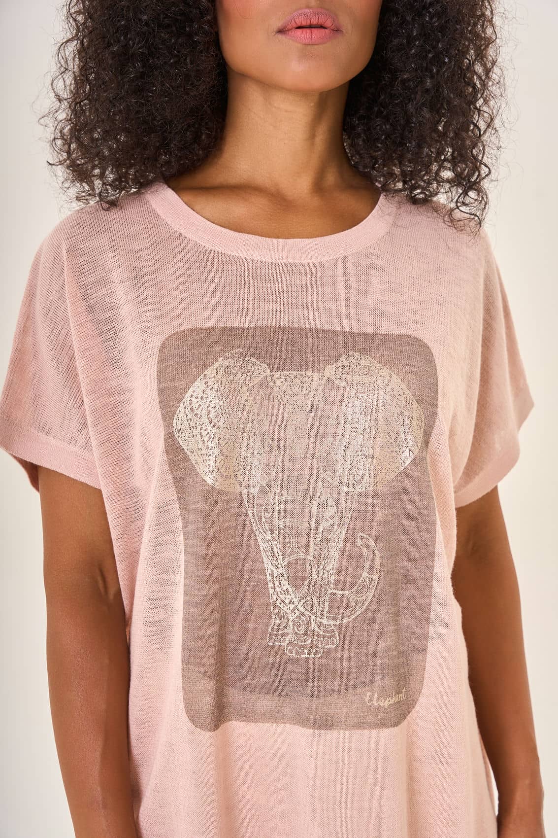 Свободная блузка пастельно-розового оттенка с коротким рукавом и круглым вырезом. Центральное внимание привлекает крупный прямоугольный принт на передней стороне — изящный рисунок слона, выполненный в стилистике классической гравюры. Изящный дизайн и приятный к телу материал делают эту блузку идеальным выбором для создания легкого и романтичного образа.