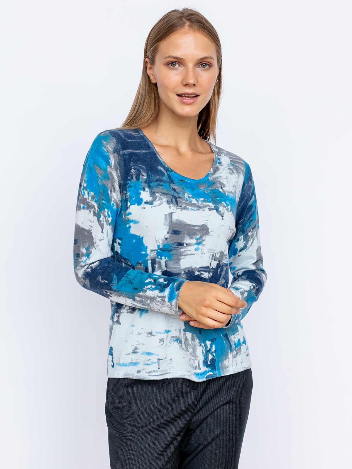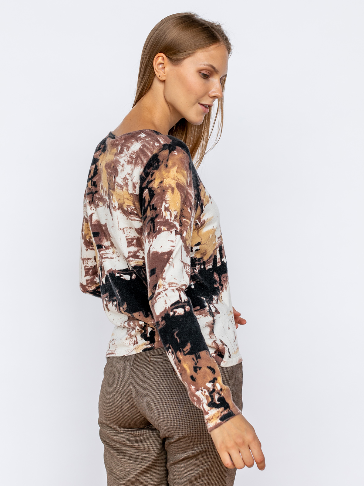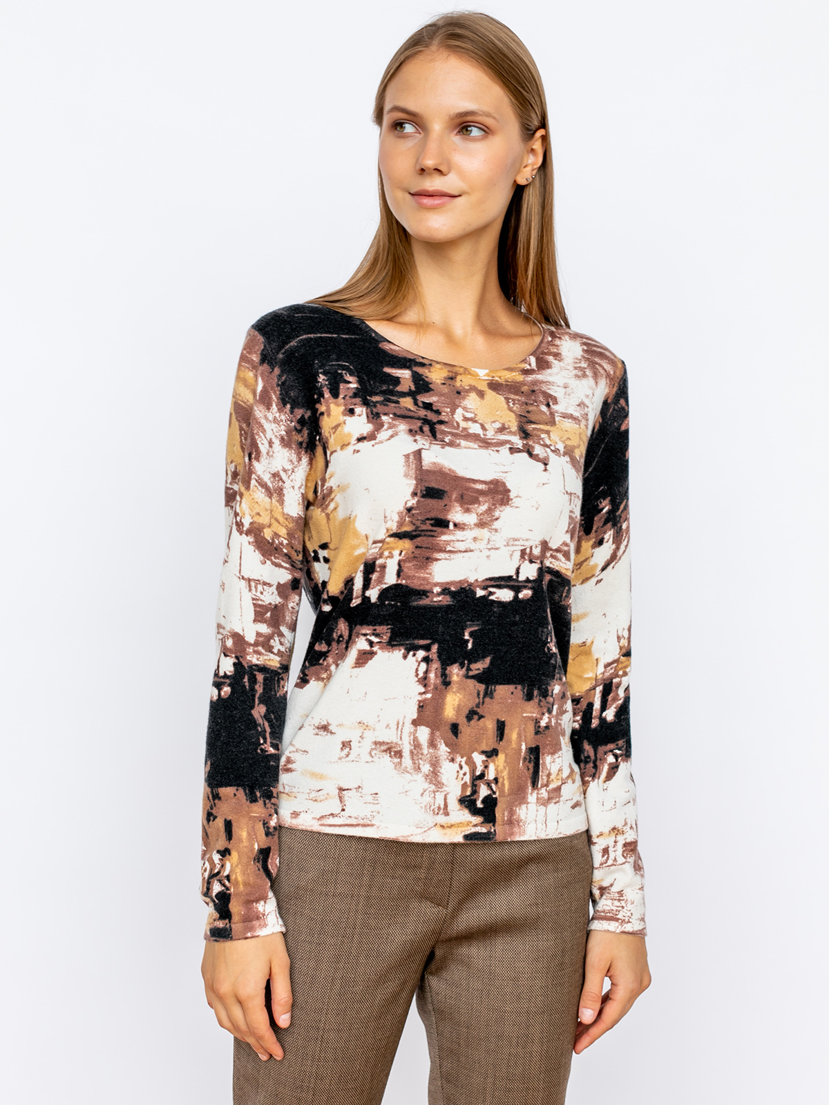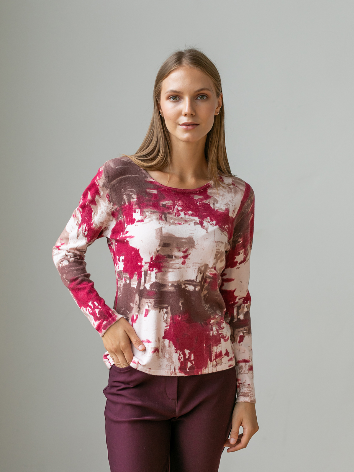 Джемпер с ярким абстрактным принтом выполнен в трех оттенках: бордовом, синем и коричневом. Широкий овальный вырез горловины подчеркивает изящество линии шеи. Полуприлегающий силуэт подчеркивает женственность форм. Джемпер сочетаетается с юбкой и брюками и расставляет яркие акценты в вашем аутфите.