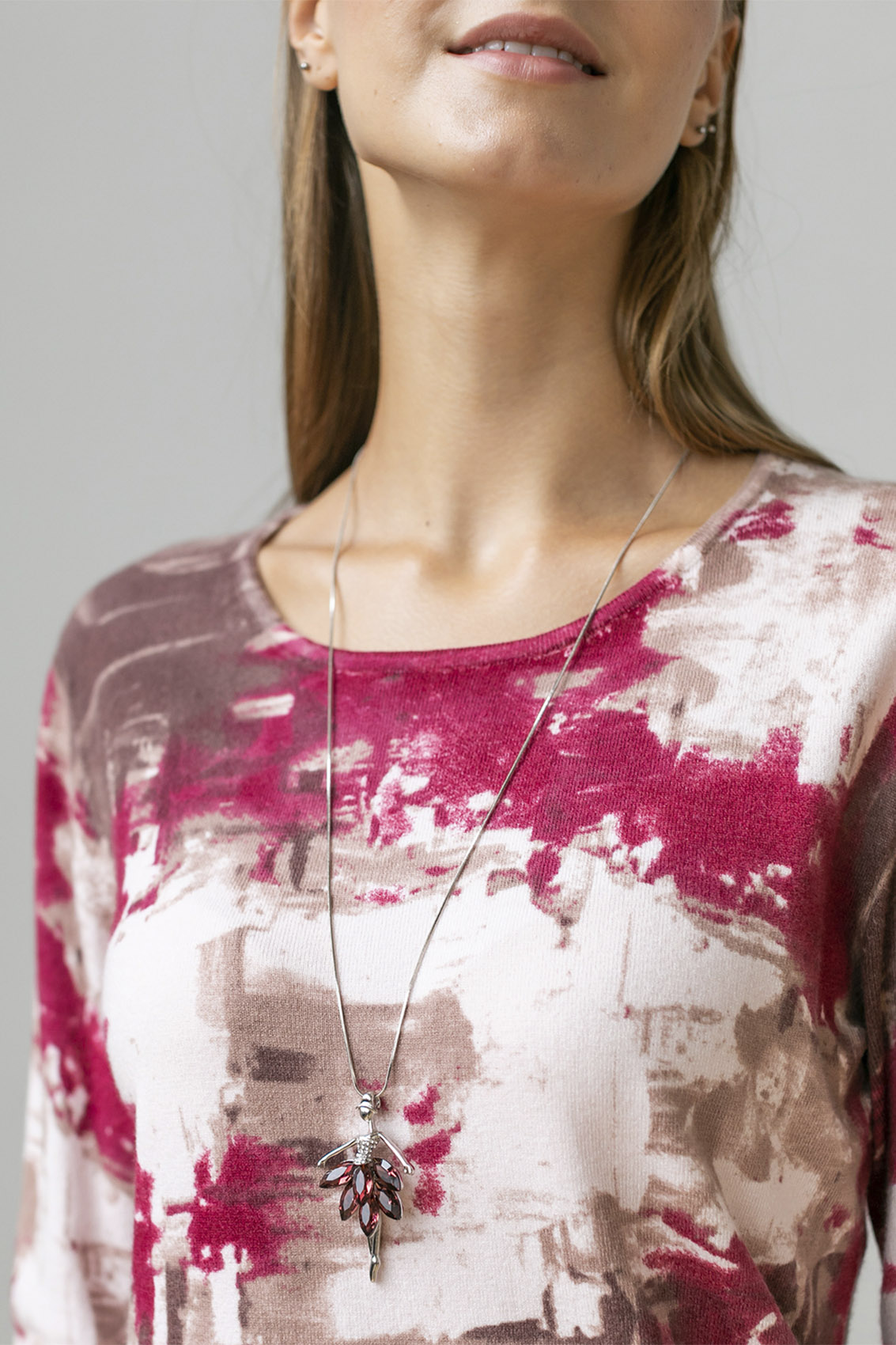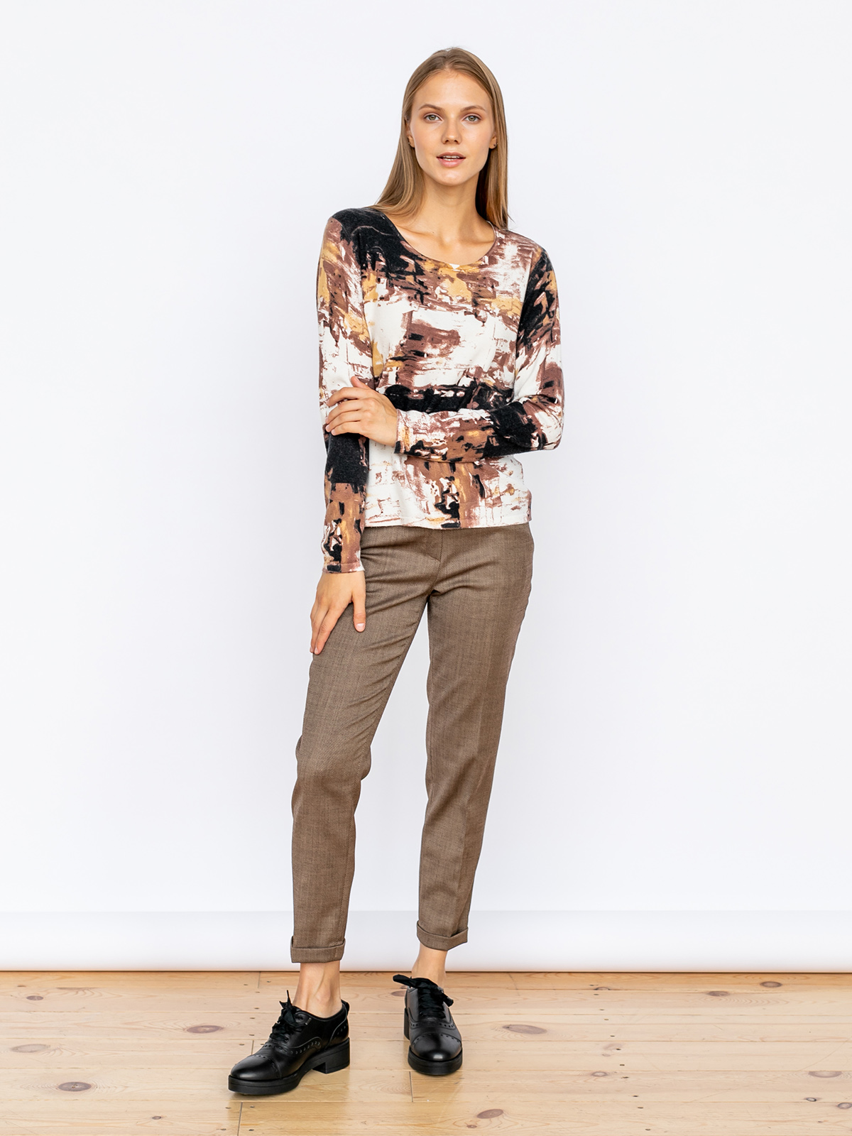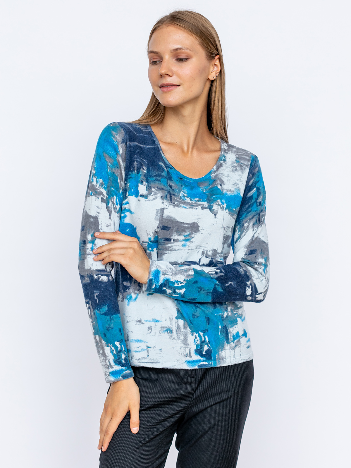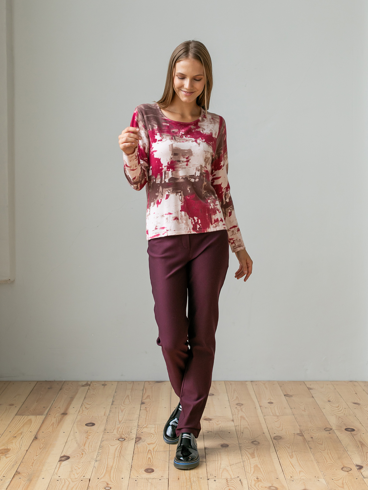 Джемпер с ярким абстрактным принтом выполнен в трех оттенках: бордовом, синем и коричневом. Широкий овальный вырез горловины подчеркивает изящество линии шеи. Полуприлегающий силуэт подчеркивает женственность форм. Джемпер сочетаетается с юбкой и брюками и расставляет яркие акценты в вашем аутфите.