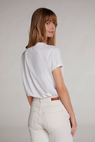 Белая футболка привлекает внимание своим смелым принтом. Прямой крой, круглый вырез горловины, короткие втачные рукава с фиксированными манжетами. Хлопковый материал приятен к телу и обеспечивает комфорт в ношении. Футболка создает демократичный образ и прекрасно сочетается как с брюками, так и с юбкой.