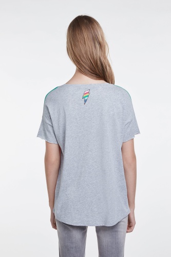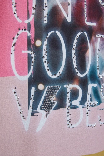 Стильная футболка с яркми принтом. Свободный покрой, круглый вырез горловины, короткий комбинированный рукав. Декор стразами придает образу нотку гламура. Приятный к телу материал из смеси модала и хлопка обеспечивает комфорт.