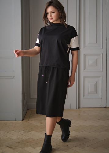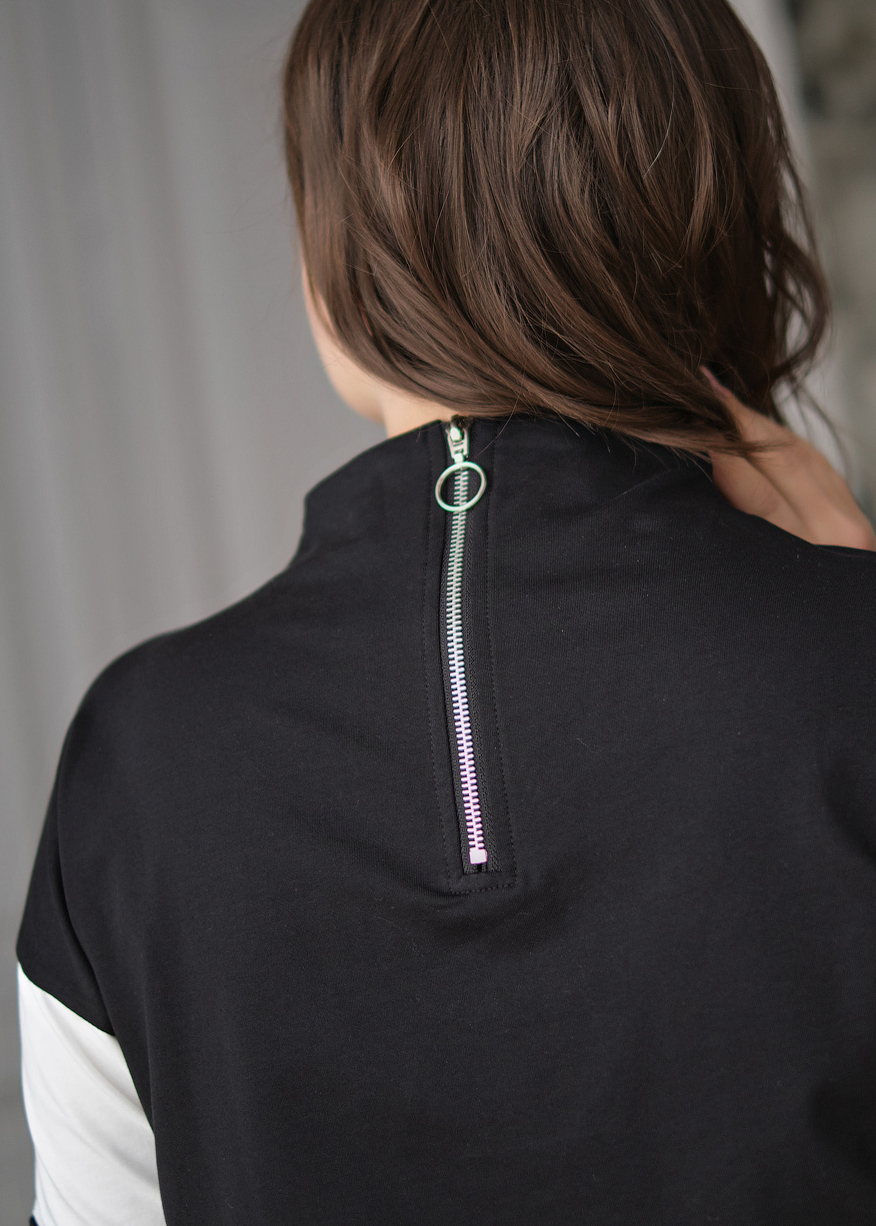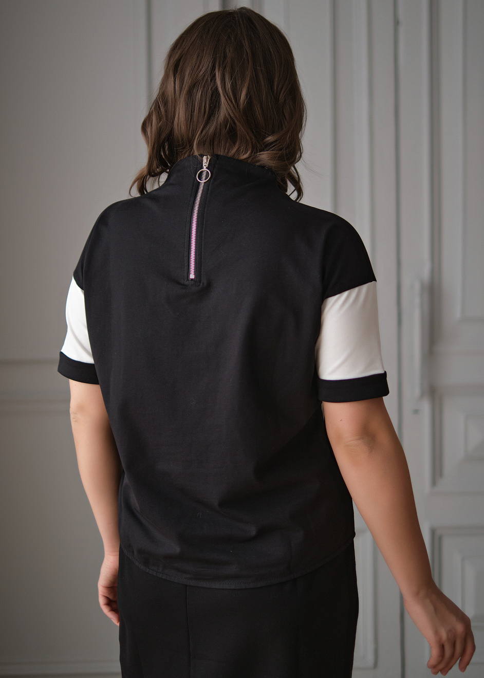На сайте указаны российские размеры. Ткань: приятный телу, эластичный смесовый материал (74% хлопок, 20% полиэстер, 6% спандекс) Крой: укороченная, слегка приталенная футболка в спортивном стиле с высокой горловиной. Подчёркивает достоинства фигуры и визуально стройнит силуэт благодаря благородному черному цвету. Отделка: имеет контрастные короткие рукава, которые создают современный авангардный образ. На спинке располагается функциональная металлическая молния с переливом. Сочетается с кожаными и трикотажными брюками из коллекции Stern.