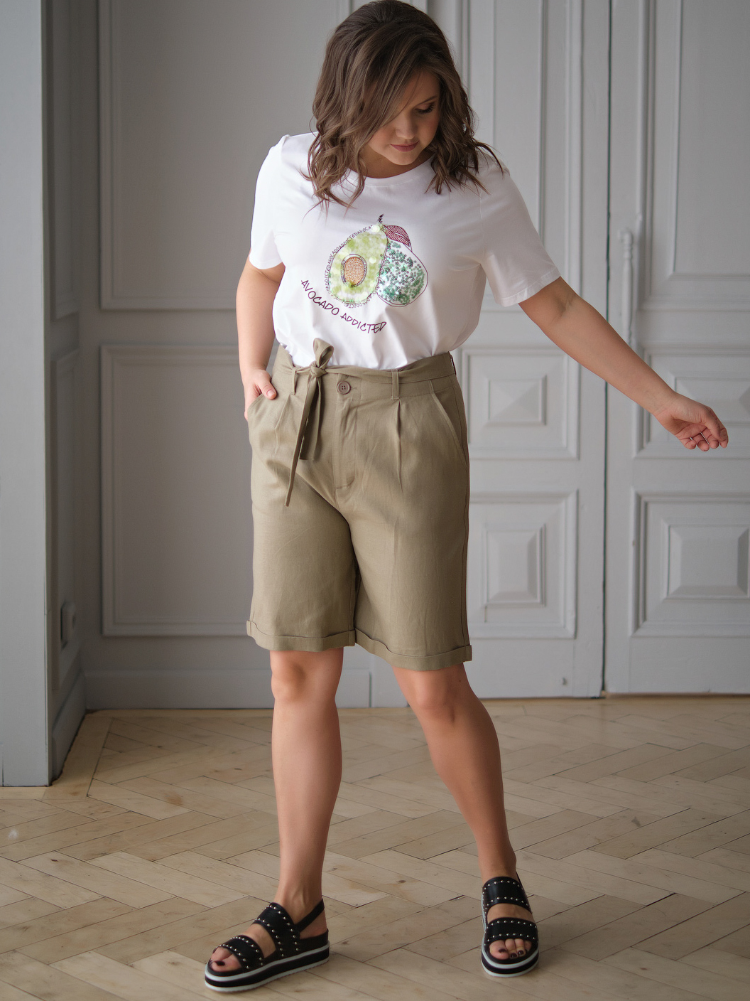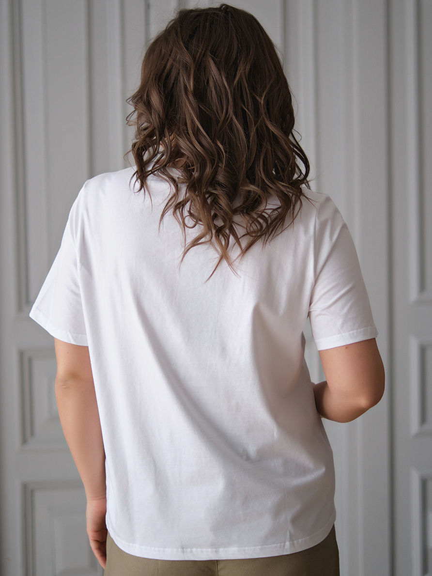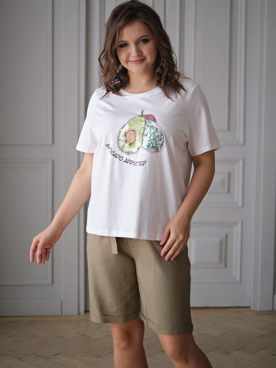 На сайте указаны российские размеры. Ткань: выполнена из гладкого хлопка высокого качества (95%) и эластана, добавляющего ткани упругости (5%) Крой: футболка прямого силуэта с коротким рукавом. Удобная, стильная, подчеркивающая достоинства фигуры. Имеет среднюю длину, закрывает область живота, надежно фиксируется благодаря наличию эластана в составе. Не поднимается вверх при движении. Отделка: футболка с милым изображением авокадо мгновенно поднимает настроение даже в самый сложный день. Принт украшен переливающимися пайетками разной фракции. Сочетается с брюками, джинсами, юбками и шортами из ассортимента Stern.